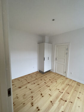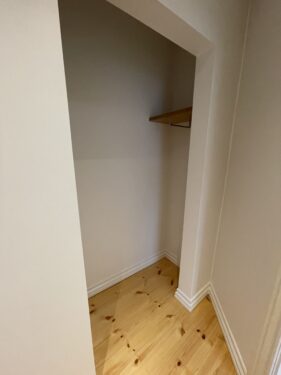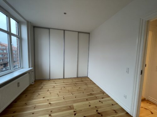 Soveværelset har et praktisk klædeskab med skydelåger, der giver god opbevaringsplads og bidrager til en enkel og stilren indretning.