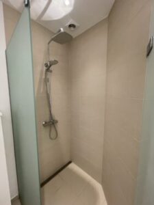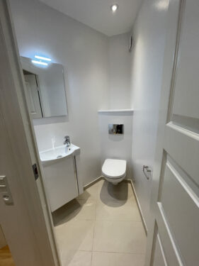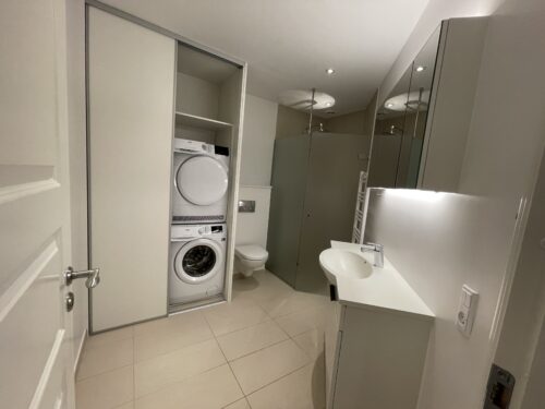 Badeværelset er praktisk indrettet med vaskeskab, spejlskab, håndklædetørrer samt både vaskemaskine og tørretumbler, hvilket giver dig alt, hvad du behøver for nem og effektiv hverdag.