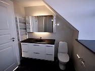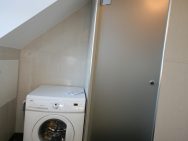 Badeværelset har en bruseniche med glasdør. Der er installeret følgende:
