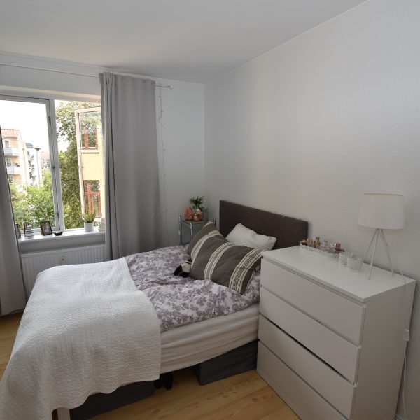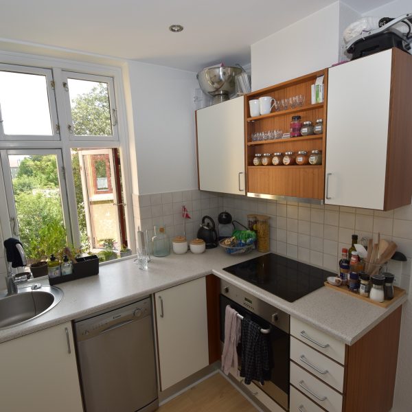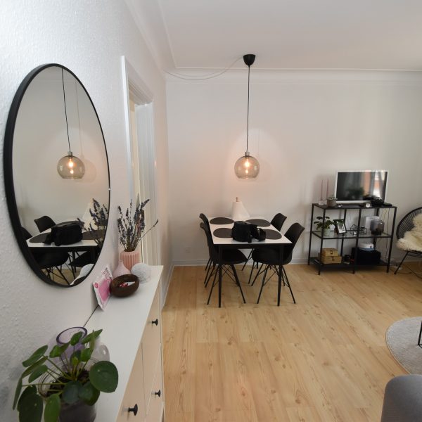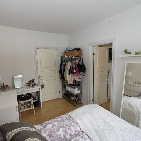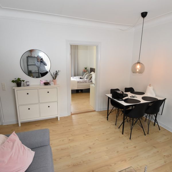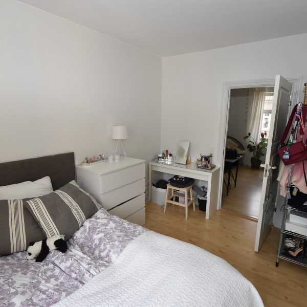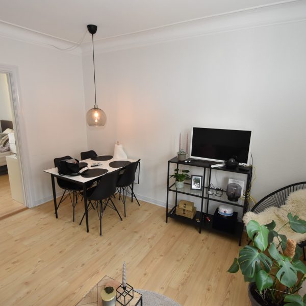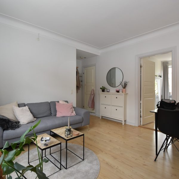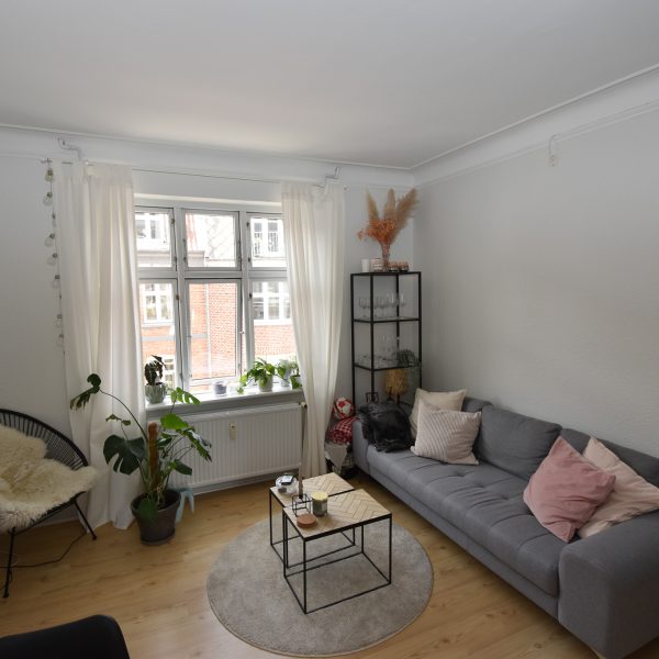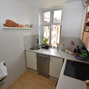 Lejligheden har en charmerende stue med stukloft, flotte trægulve og et dejligt lysindfald, der skaber en varm og hyggelig atmosfære. Soveværelset er lyst og roligt med udsigt til gårdhaven – herfra er der adgang til det nye, stilfulde køkken.