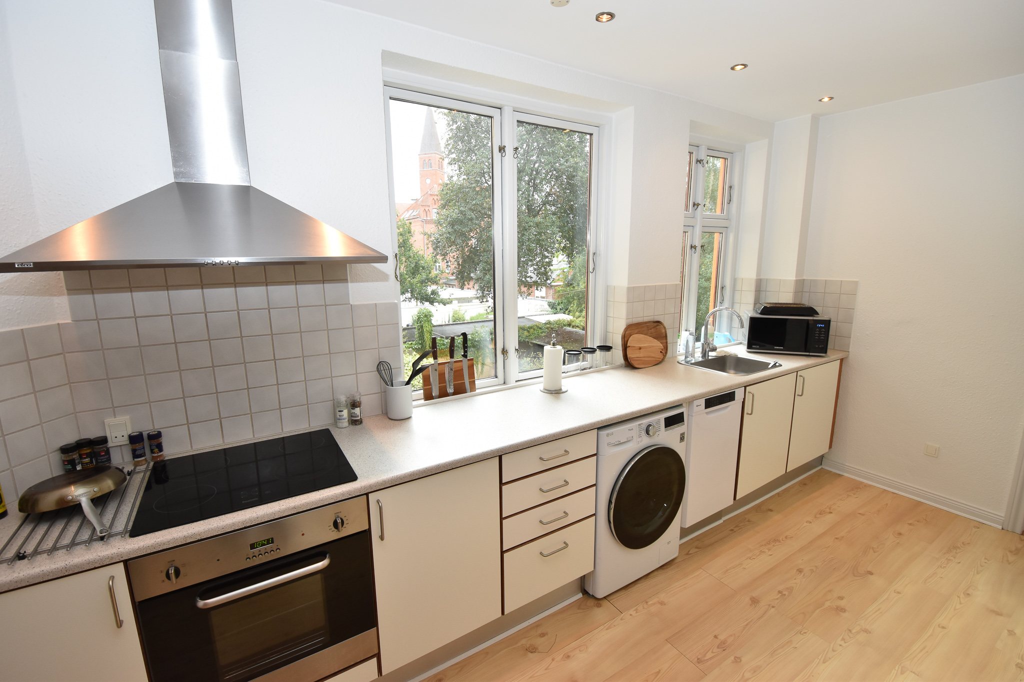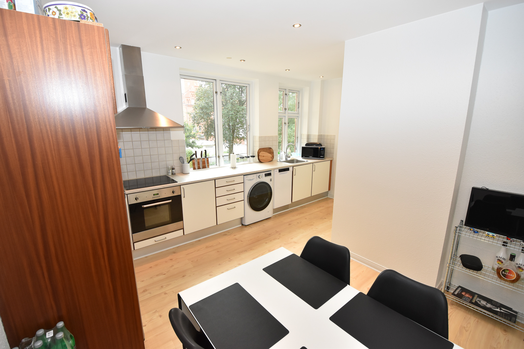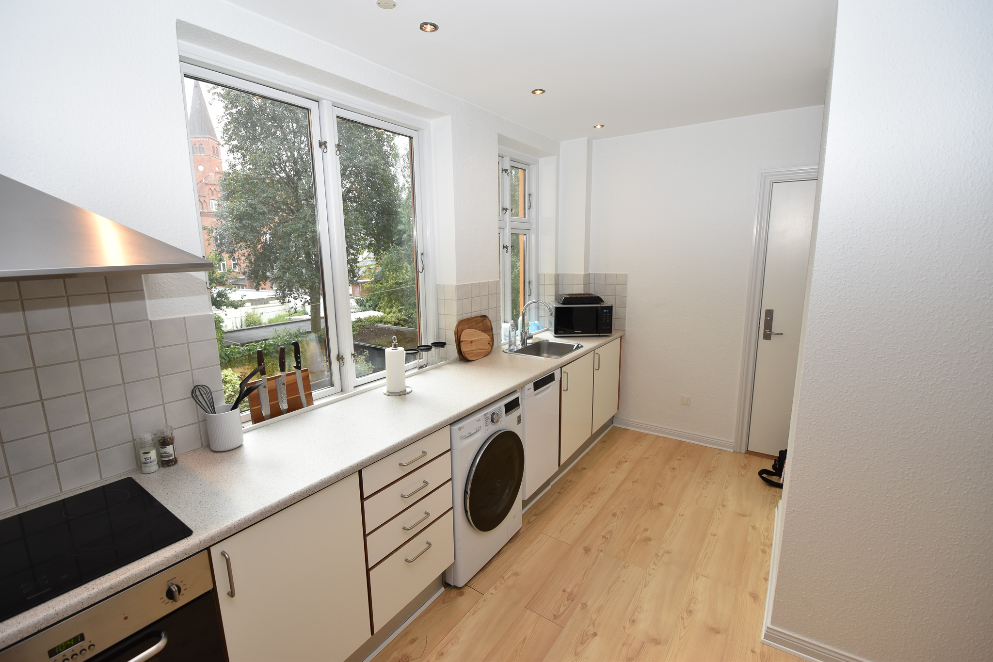 Lejligheden byder på en rummelig entré med trægulv og indbyggede spots i loftet, som leder dig ind til det store badeværelse, der er udstyret med moderne fliser, gulvvarme og en afskærmet bruseniche. Det velindrettede køkkenalrum, der ligger i åben forbindelse med stuen, skaber en indbydende ramme for både madlavning og samvær. Her finder du opvaskemaskine, køle-/fryseskab, vaskemaskine/kombitørretumbler samt en glaskeramisk kogeplade og indbygningsovn, alt sammen omfavnet af et lyst og åbent rum med godt lysindfald og stukloft.