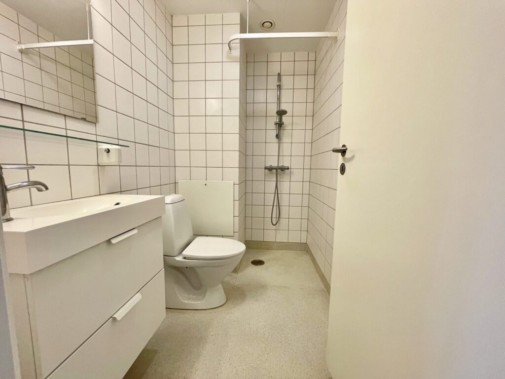 Så er der en gang med udgang til badeværelset, der har separat brus og egentlig er af en god størrelse.