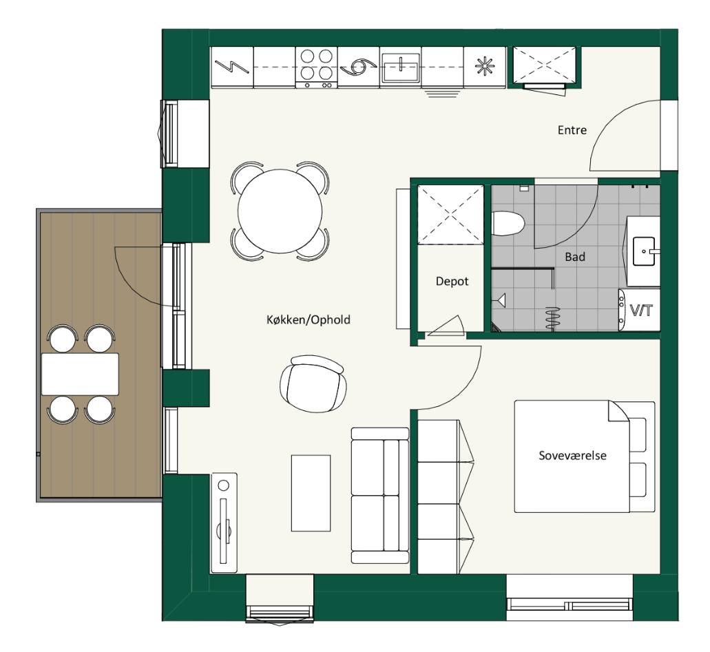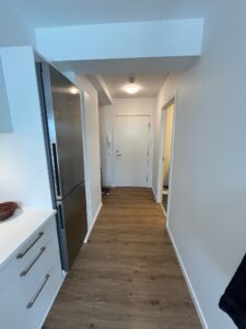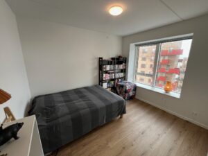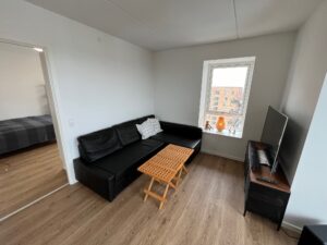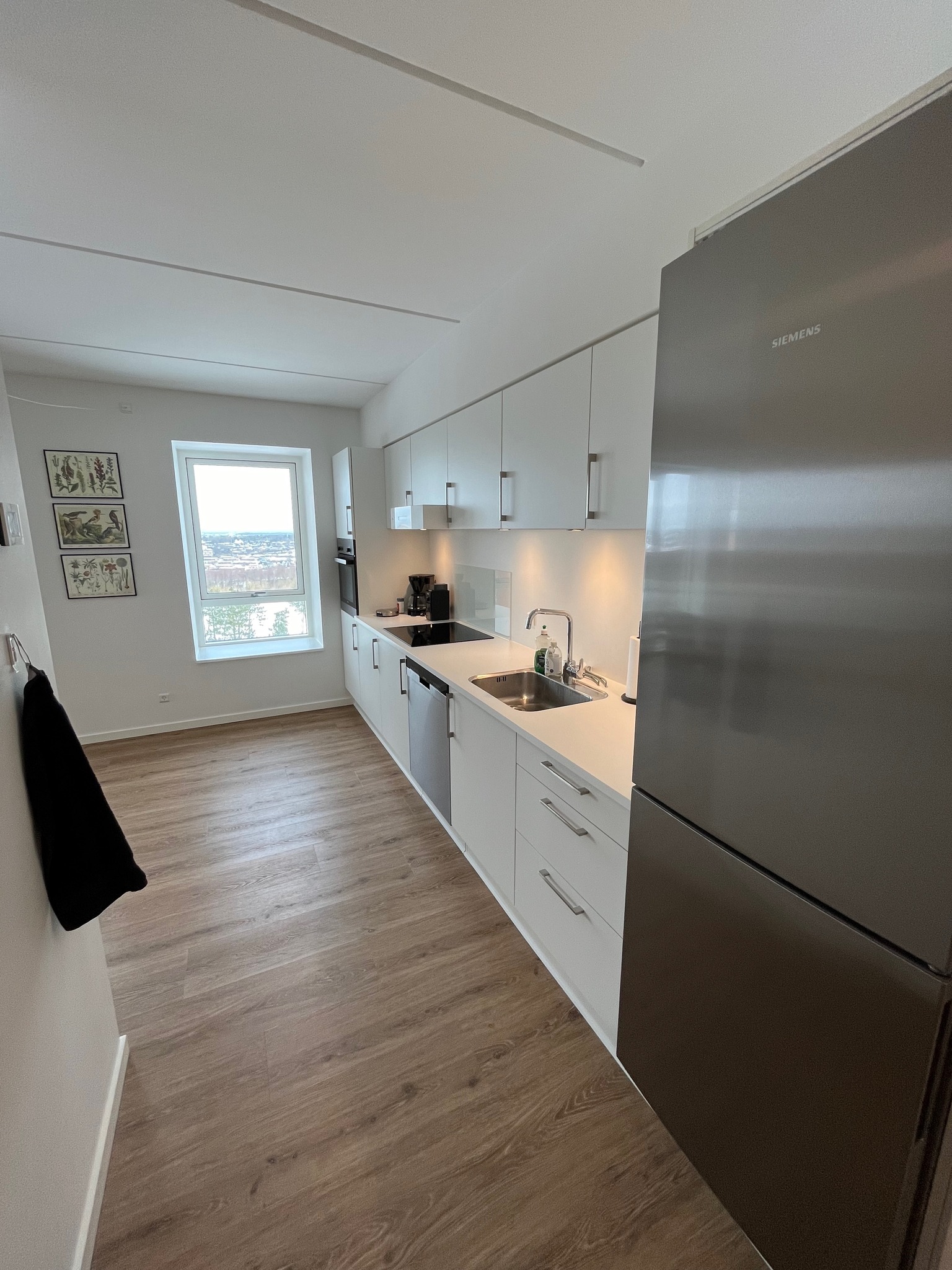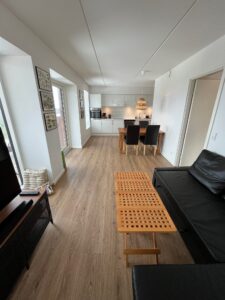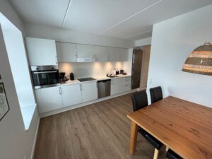 Fra entréen fortsætter du ind i det åbne køkken-alrum, som er lejlighedens hjerte. Her er der lyst og rummeligt med flotte, moderne elementer, der giver en stilren finish. Køkken-alrummet giver rigelig plads til både spisebord og sofaområde, hvilket gør det til et perfekt sted at samles med familie og venner.