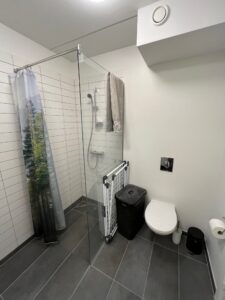 Når du træder ind ad døren, mødes du af en lille, praktisk entré. Til venstre finder du et lyst og moderne badeværelse, som indbyder til ro og velvære.