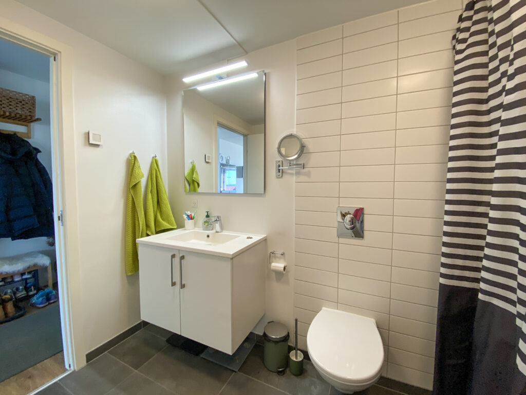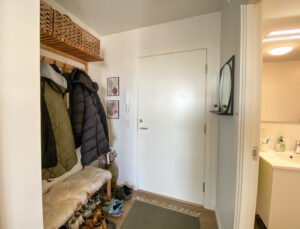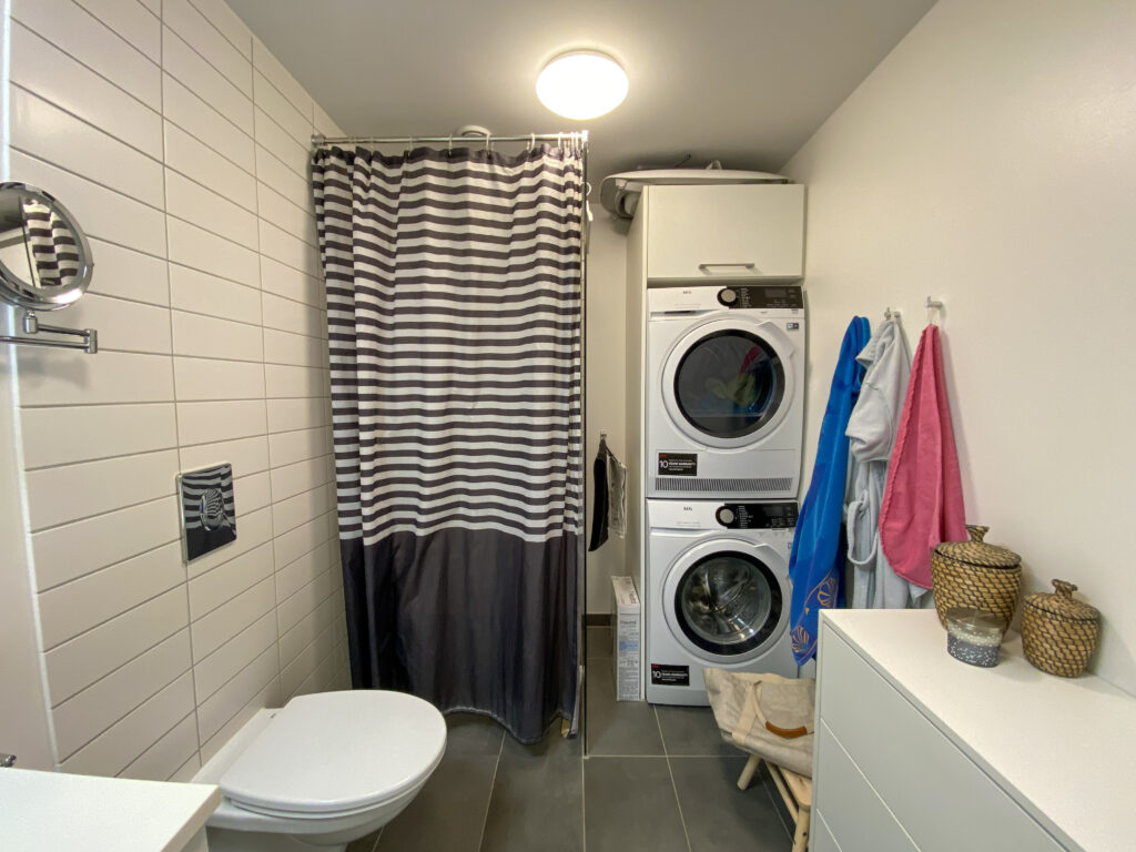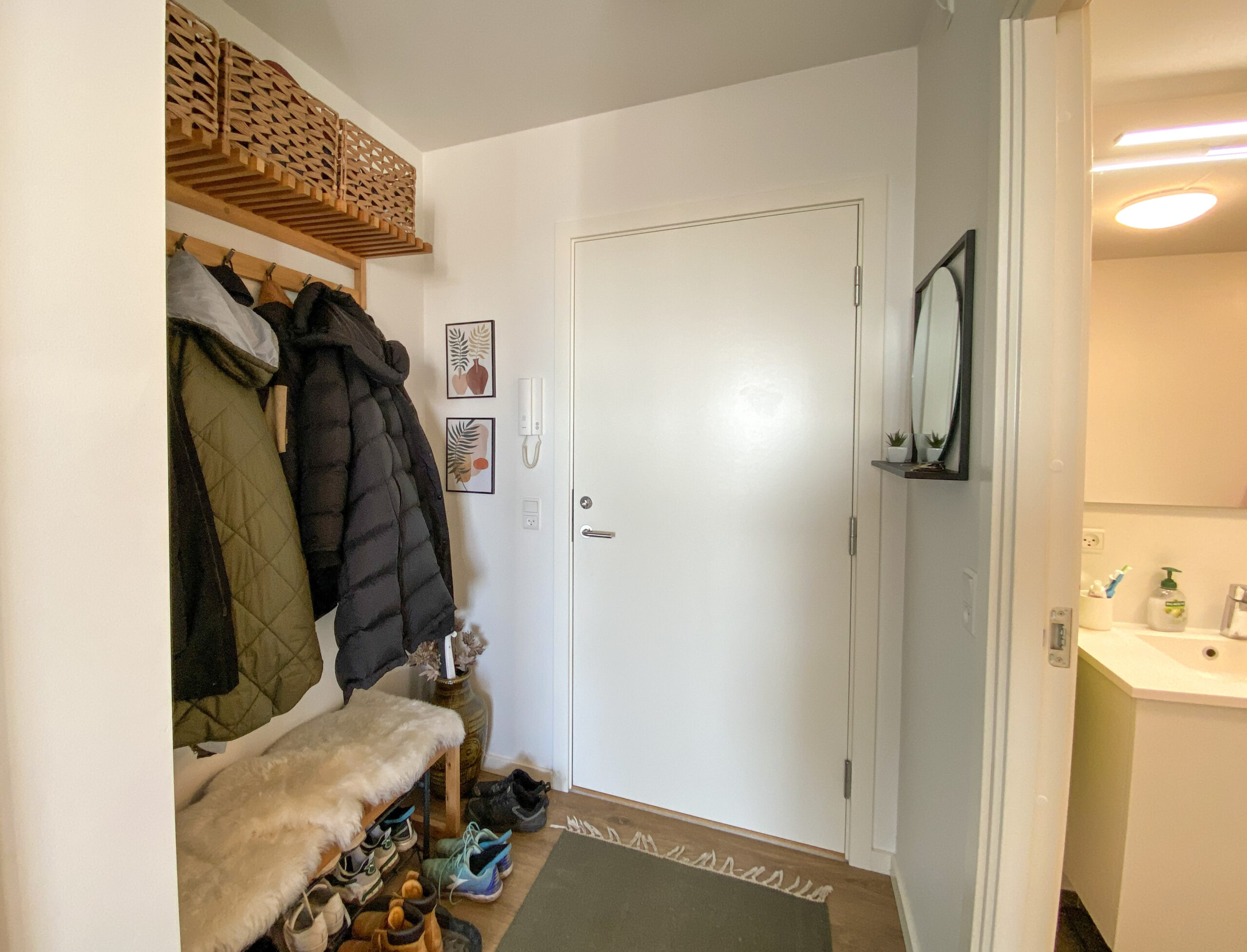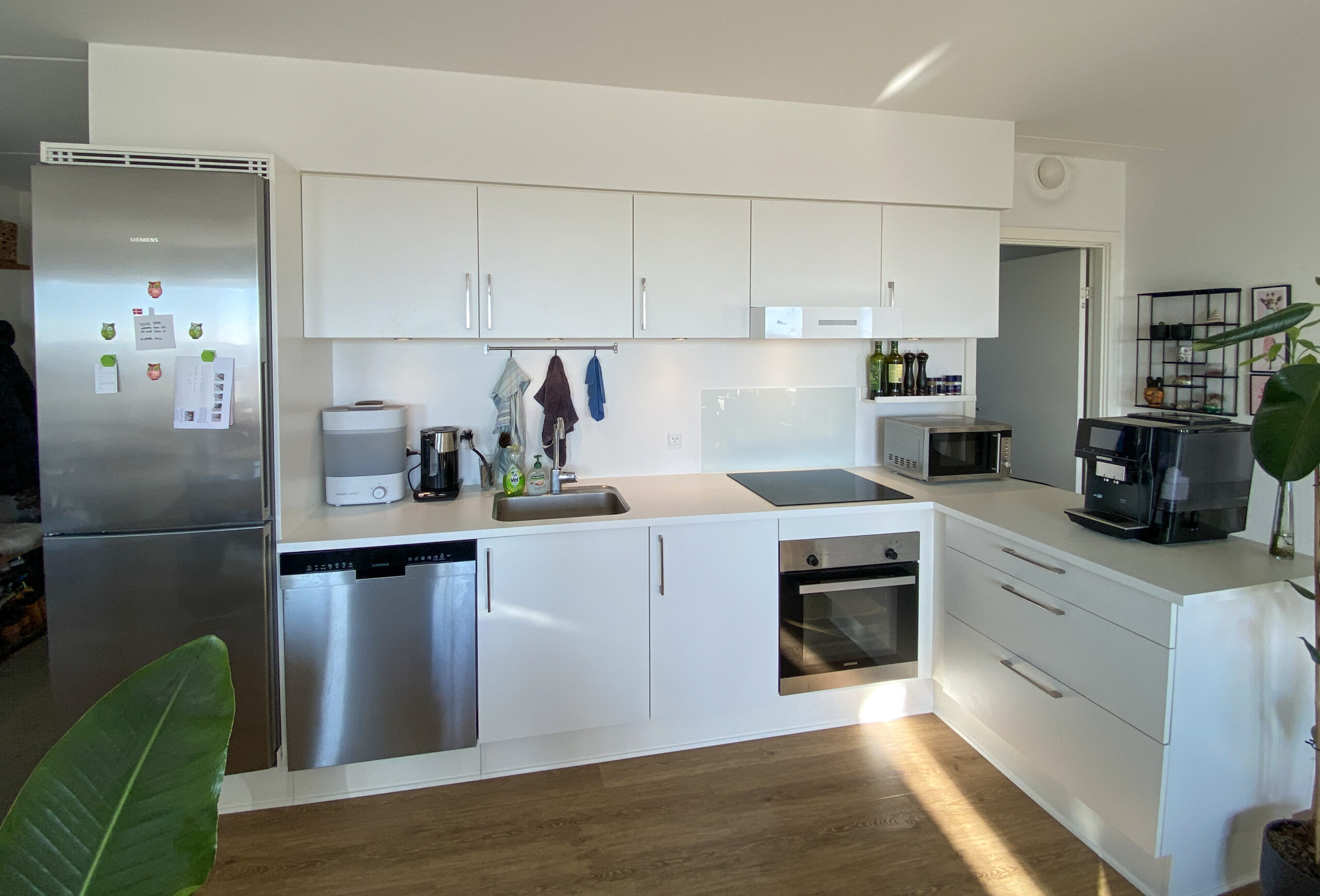 Lejligheden er indrettet med et eksklusivt Svanekøkken med topmoderne hvidevarer og åbent forbindelse til stuen, som indbyder til både afslapning og samvær. Det stilfulde badeværelse er klargjort til vaskesøjle og designet med fokus på funktionalitet og æstetik.