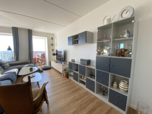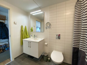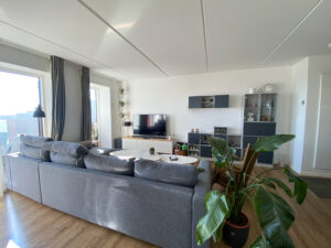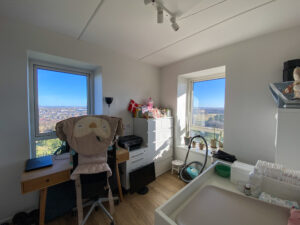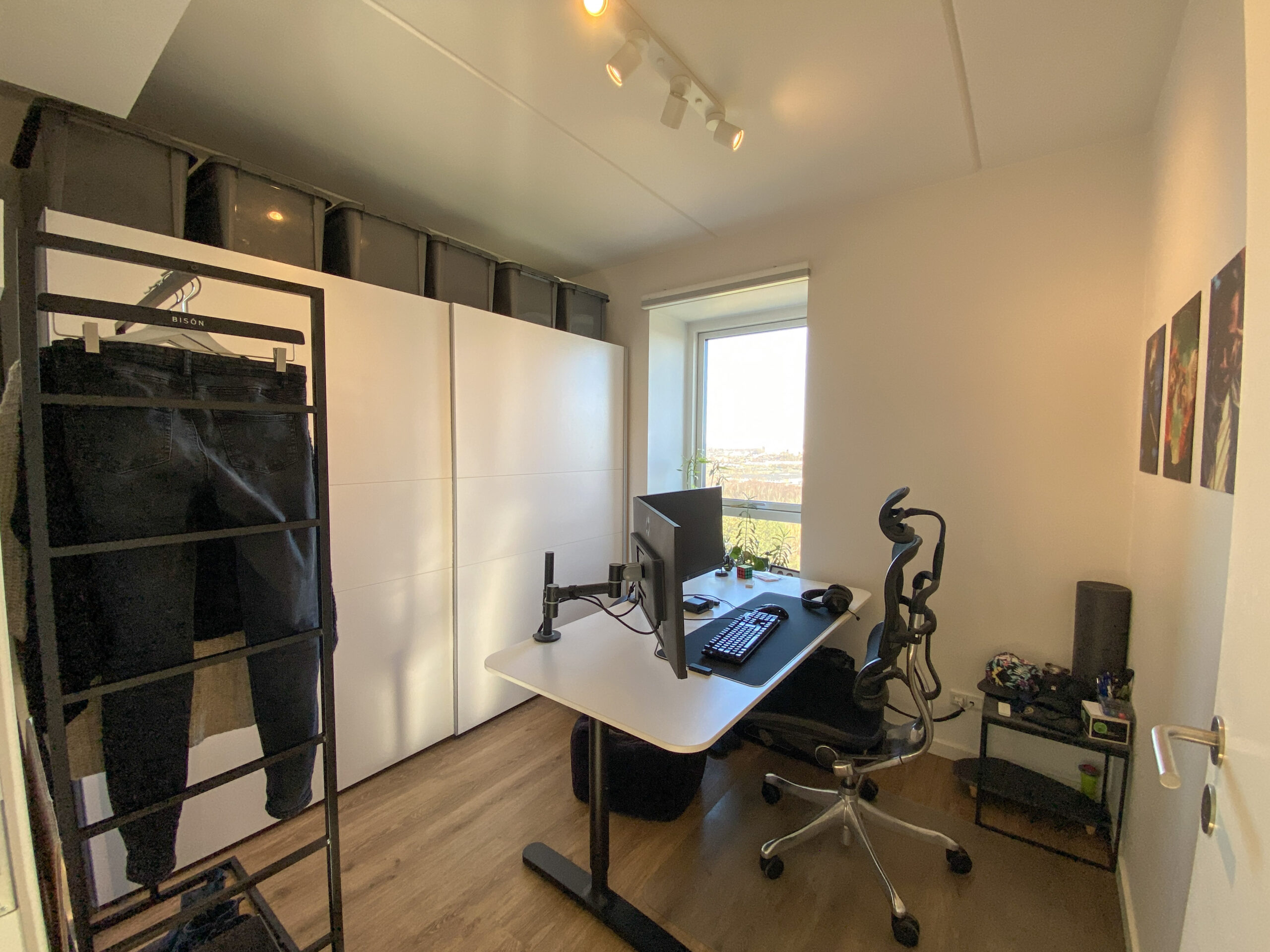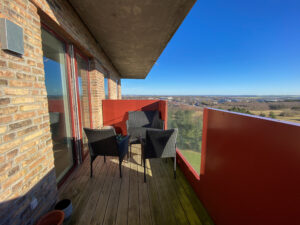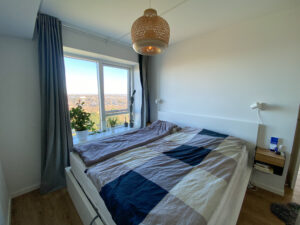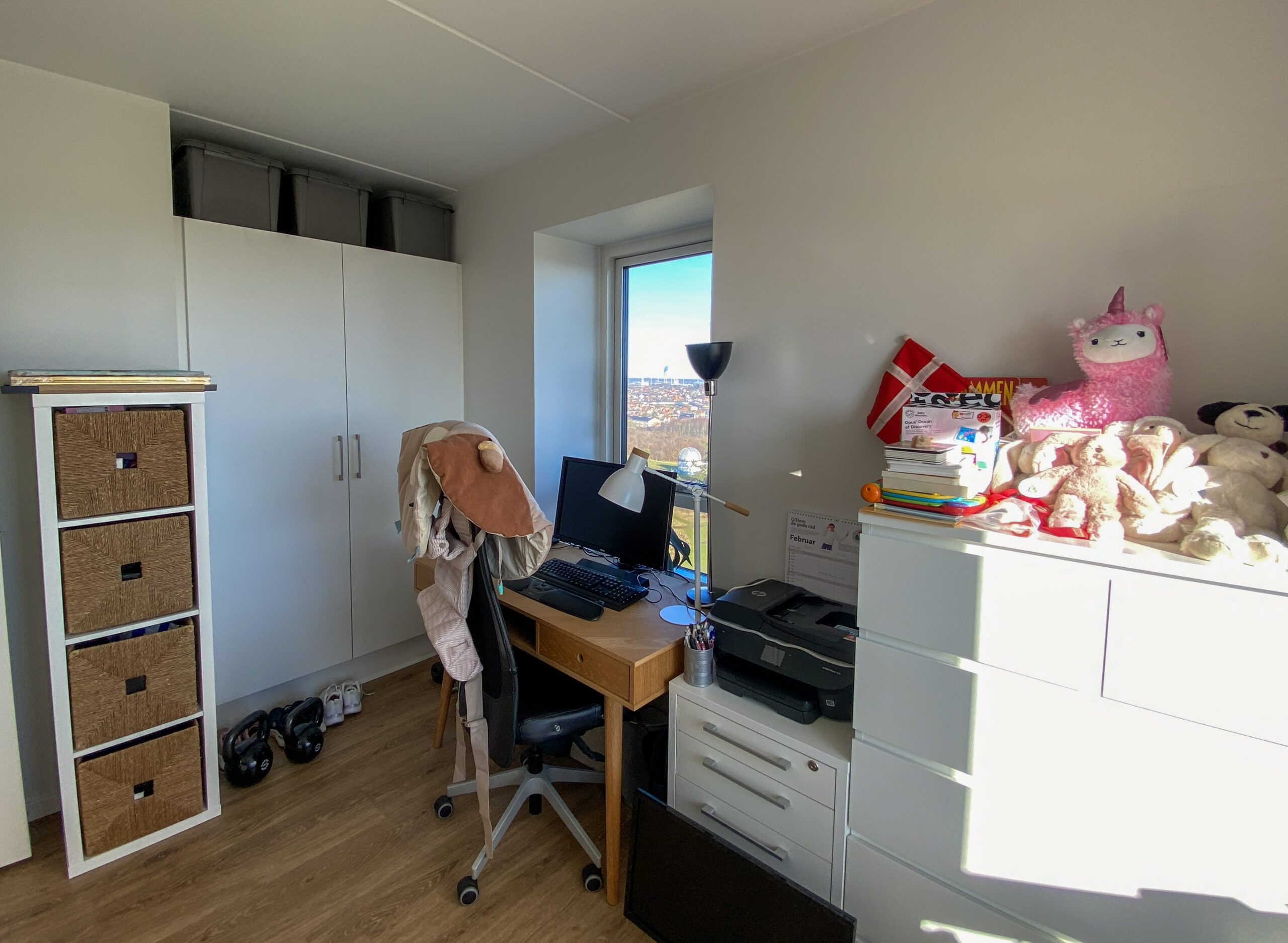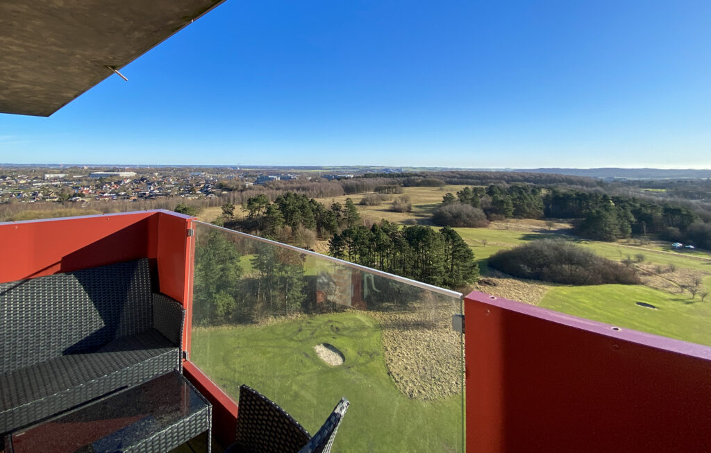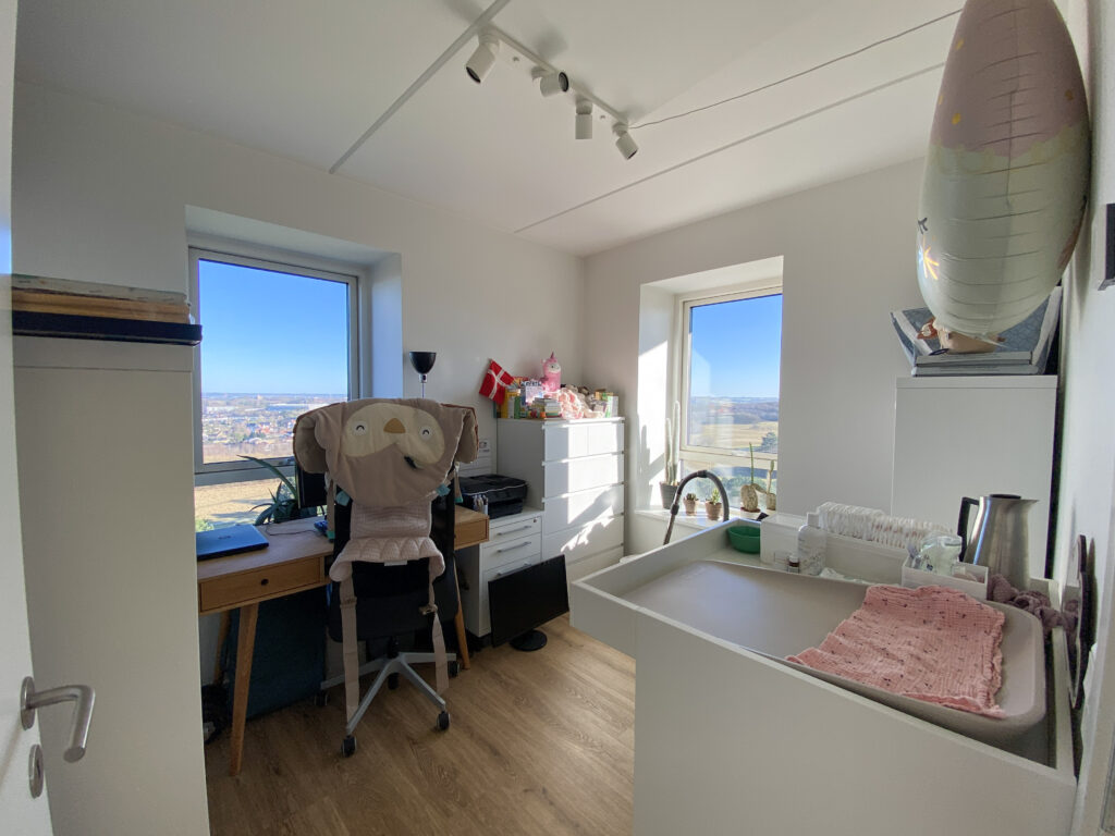 Alle værelser er lyse, rummelige og udstyret med indbyggede skabe, hvilket giver god opbevaringsplads og en rolig, indbydende atmosfære. Fra stuen er der direkte adgang til en lækker altan, hvor du kan nyde den storslåede udsigt over både Golfparken og Aalborg by – perfekt til at følge årets gang i naturen fra første parket.