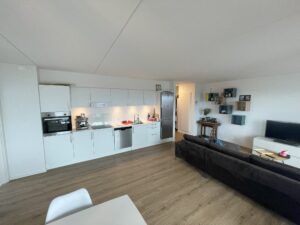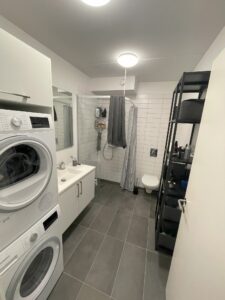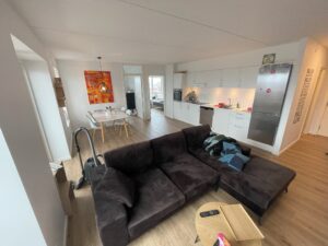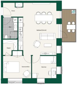 Lejligheden er indrettet med et eksklusivt Svanekøkken og et moderne badeværelse med alle nødvendige hvidevarer. Hele boligen er udstyret med gulvvarme og slidstærke, vedligeholdelsesfrie gulve, der både sikrer komfort og gør hverdagen nem.