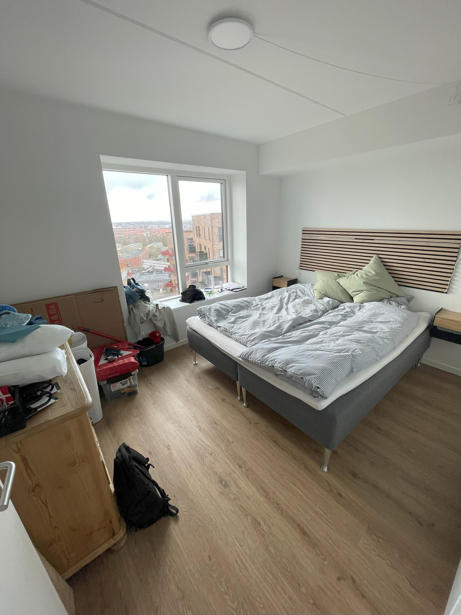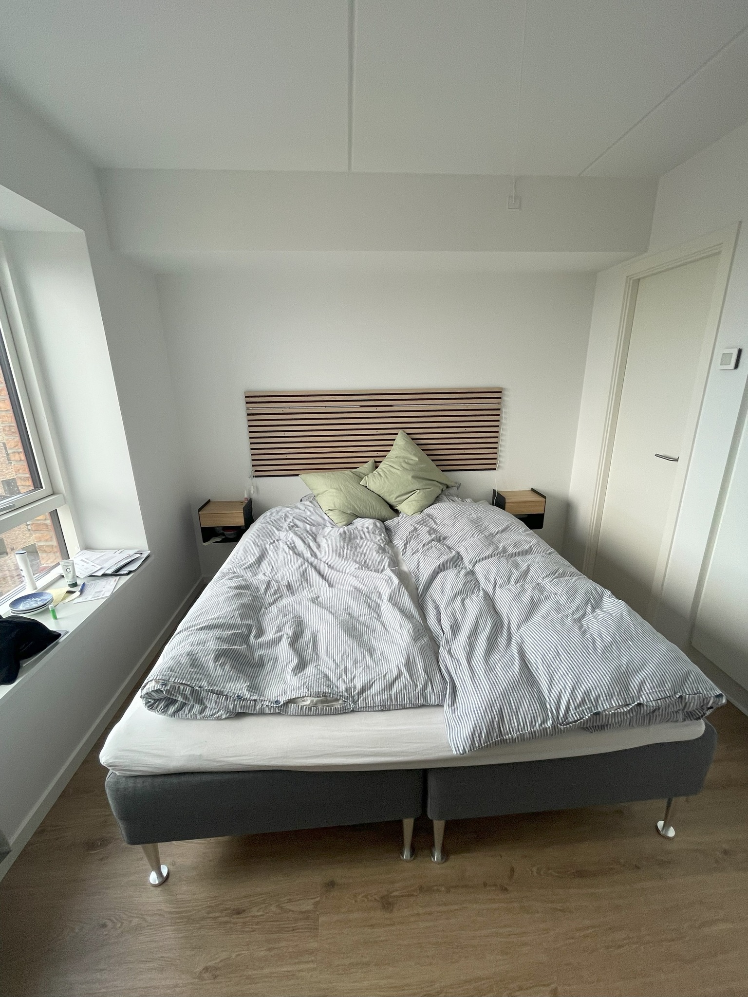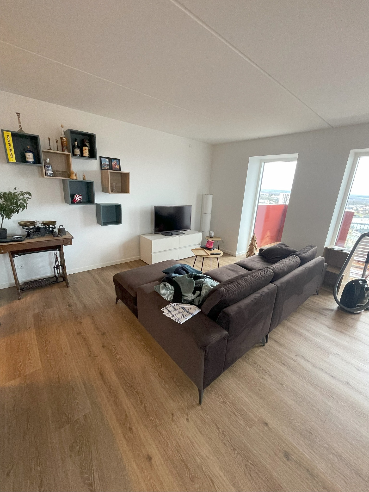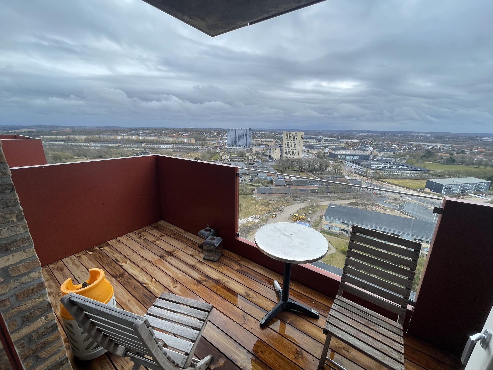 Planløsningen gør lejligheden ideel som delebolig, da de to store soveværelser er næsten identiske og begge har god plads til seng og garderobe. Den åbne og lyse stue har direkte adgang til en solrig altan, hvorfra du kan nyde både solskinstimerne og den flotte udsigt over byen og de grønne omgivelser.