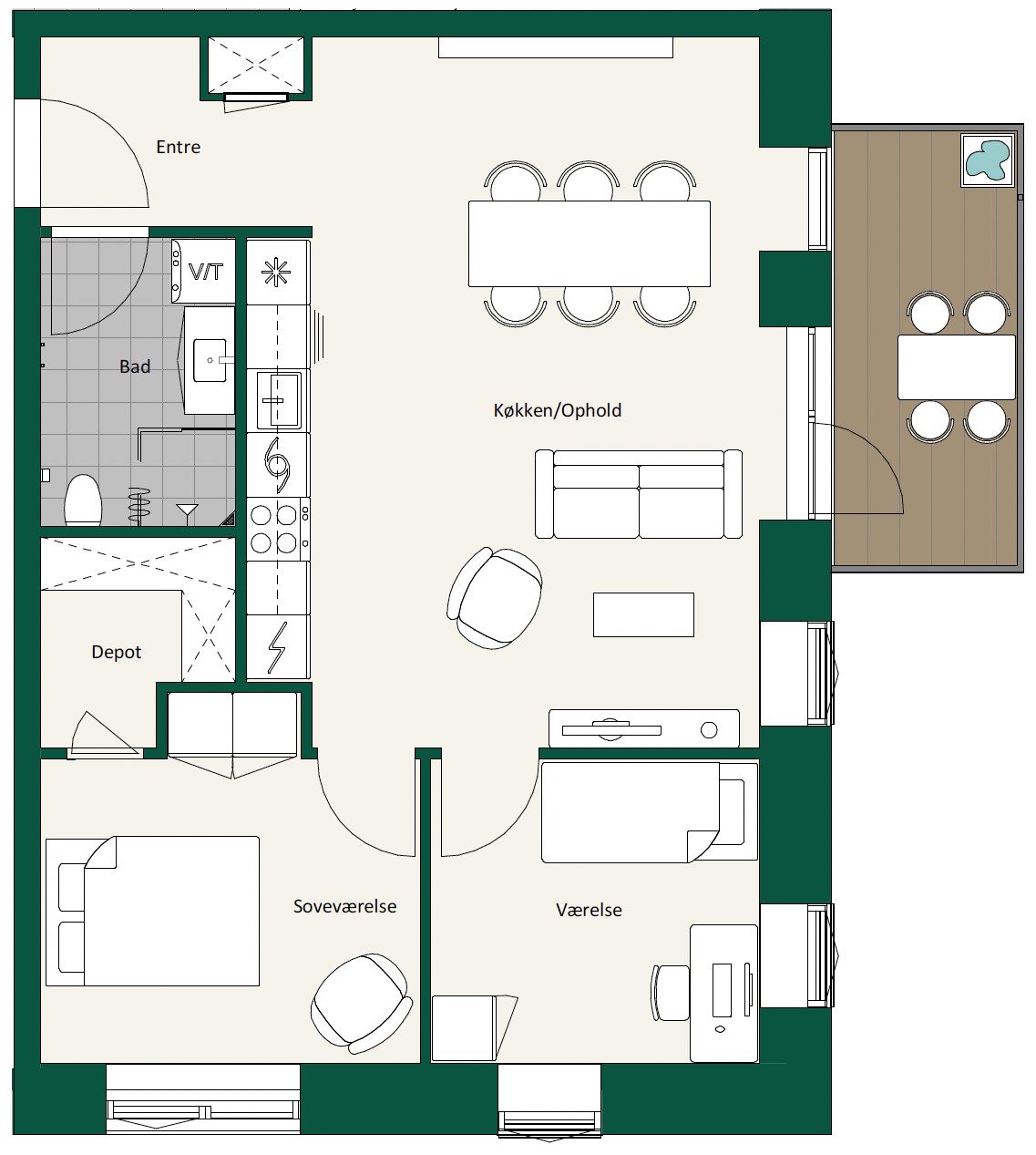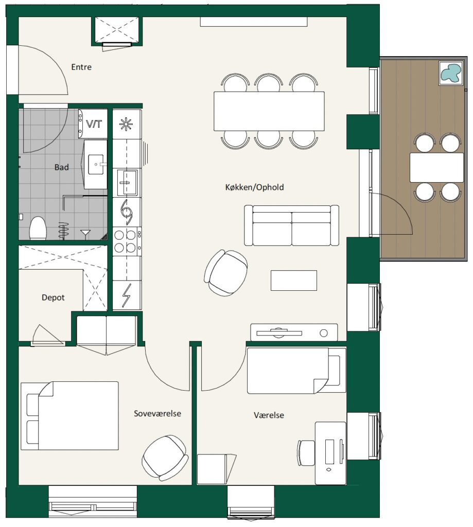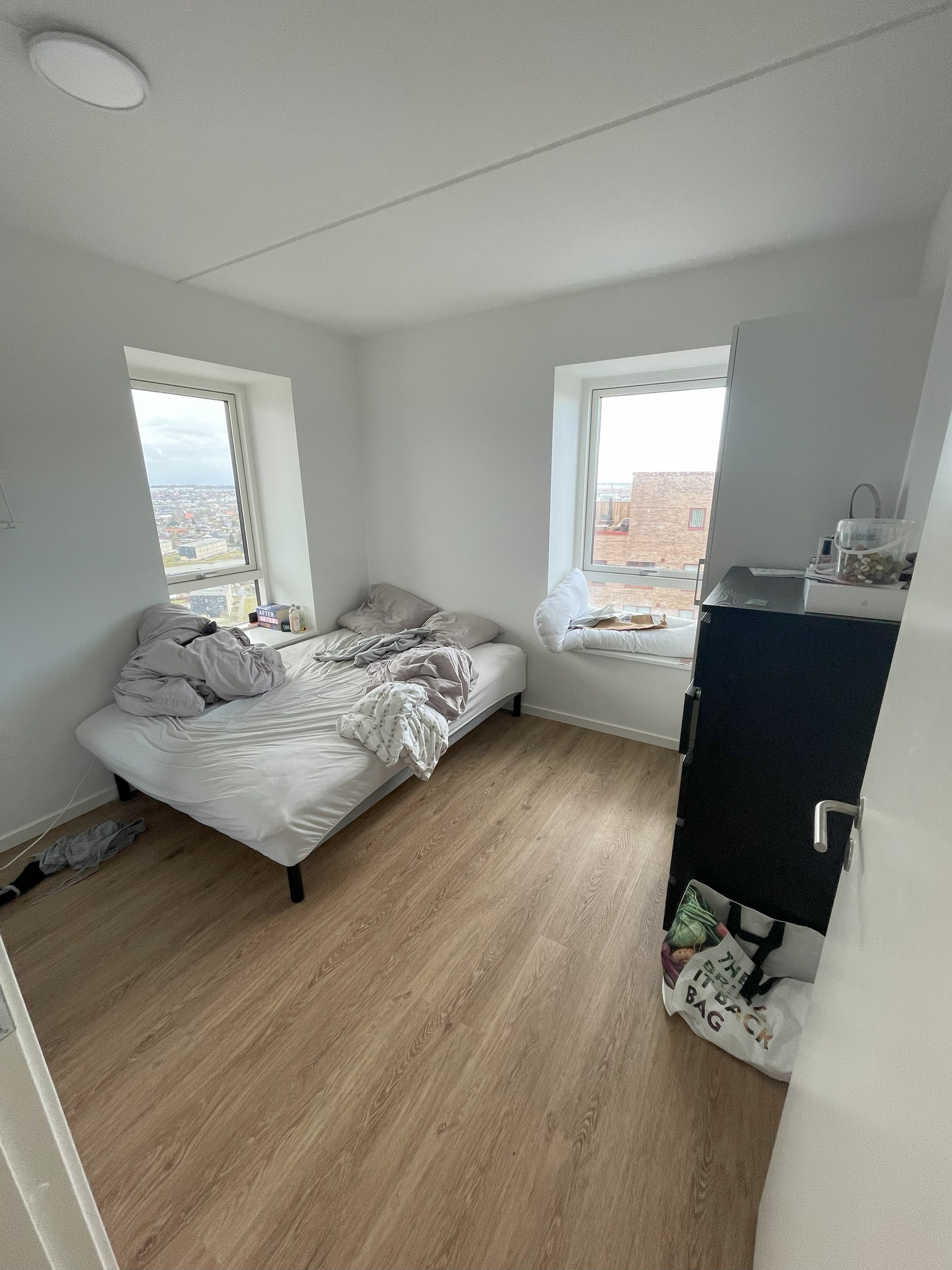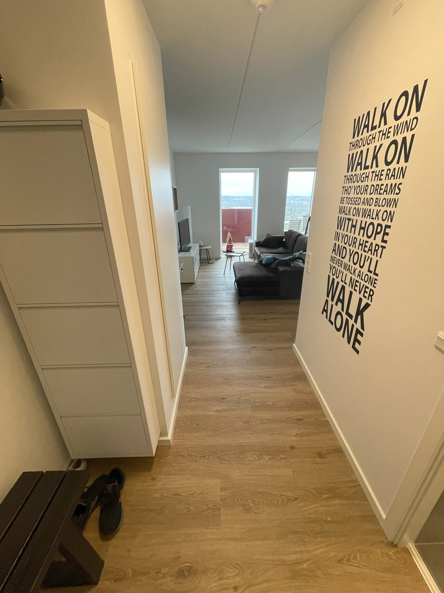 Planløsningen gør lejligheden ideel som delebolig, da de to store soveværelser er næsten identiske og begge har god plads til seng og garderobe. Den åbne og lyse stue har direkte adgang til en solrig altan, hvorfra du kan nyde både solskinstimerne og den flotte udsigt over byen og de grønne omgivelser.
