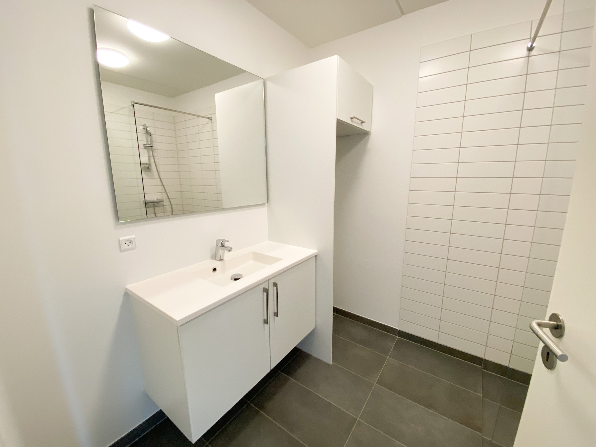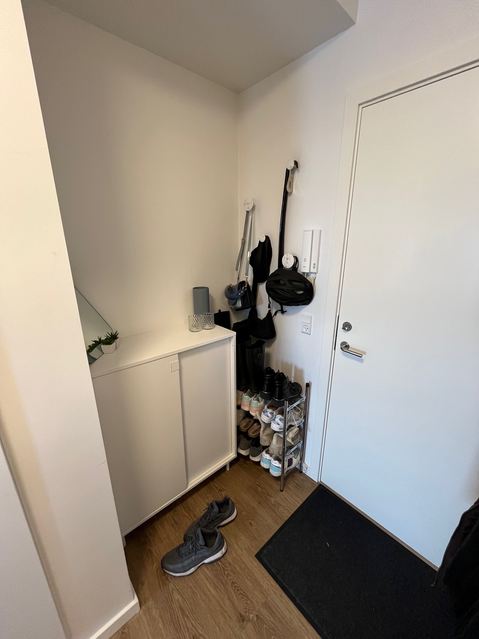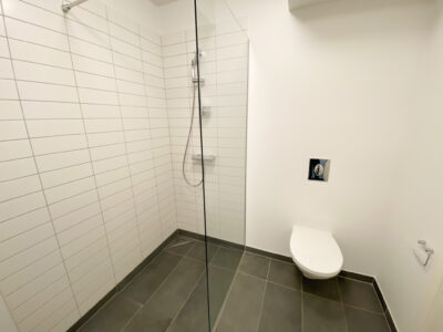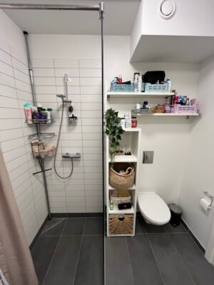 Når du træder ind ad døren, mødes du af en lille, praktisk entré. Til venstre finder du et lyst og moderne badeværelse, som indbyder til ro og velvære.