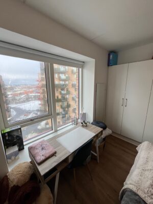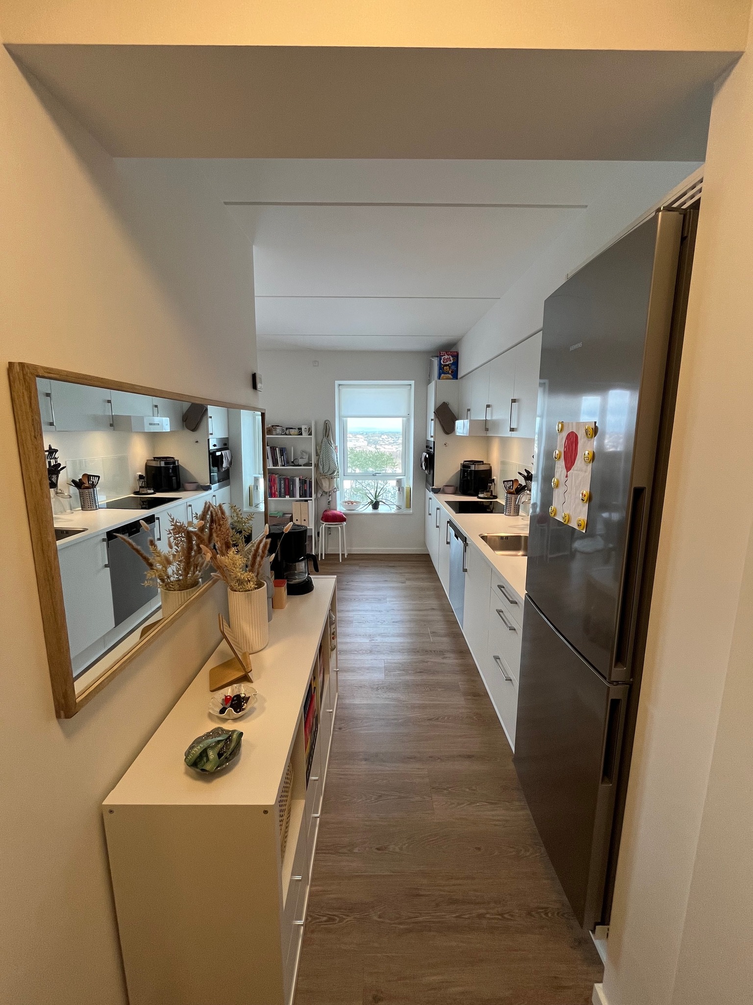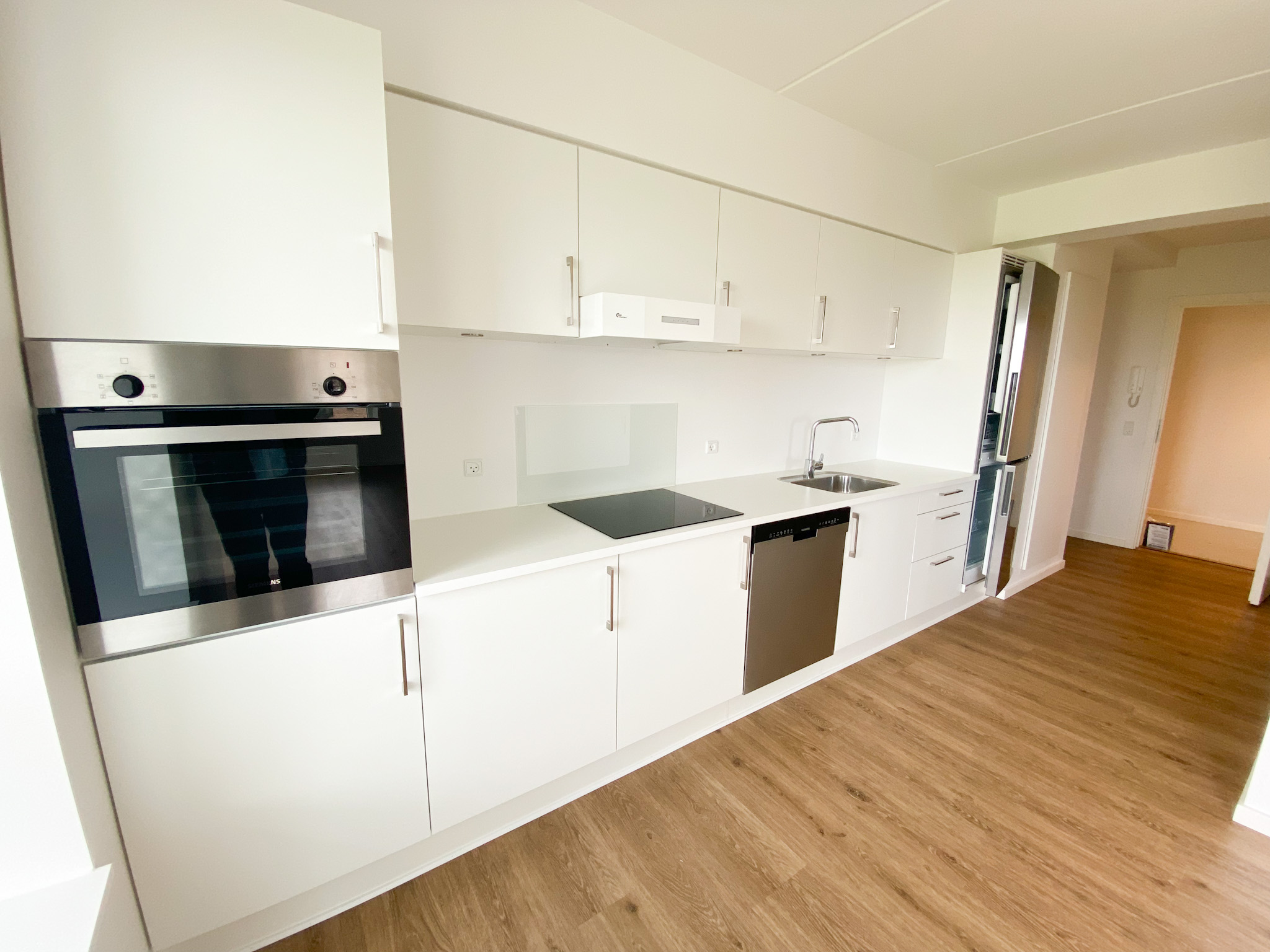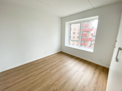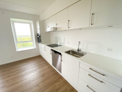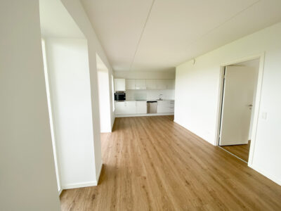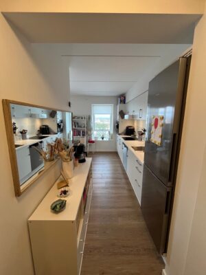 Fra entréen fortsætter du ind i det åbne køkken-alrum, som er lejlighedens hjerte. Her er der lyst og rummeligt med flotte, moderne elementer, der giver en stilren finish. Køkken-alrummet giver rigelig plads til både spisebord og sofaområde, hvilket gør det til et perfekt sted at samles med familie og venner.