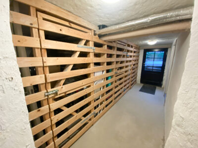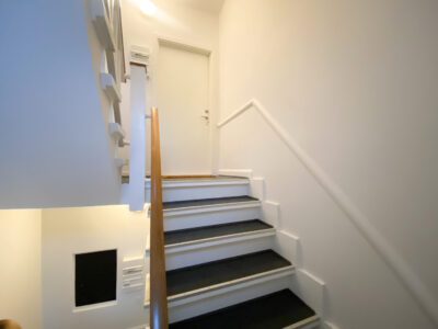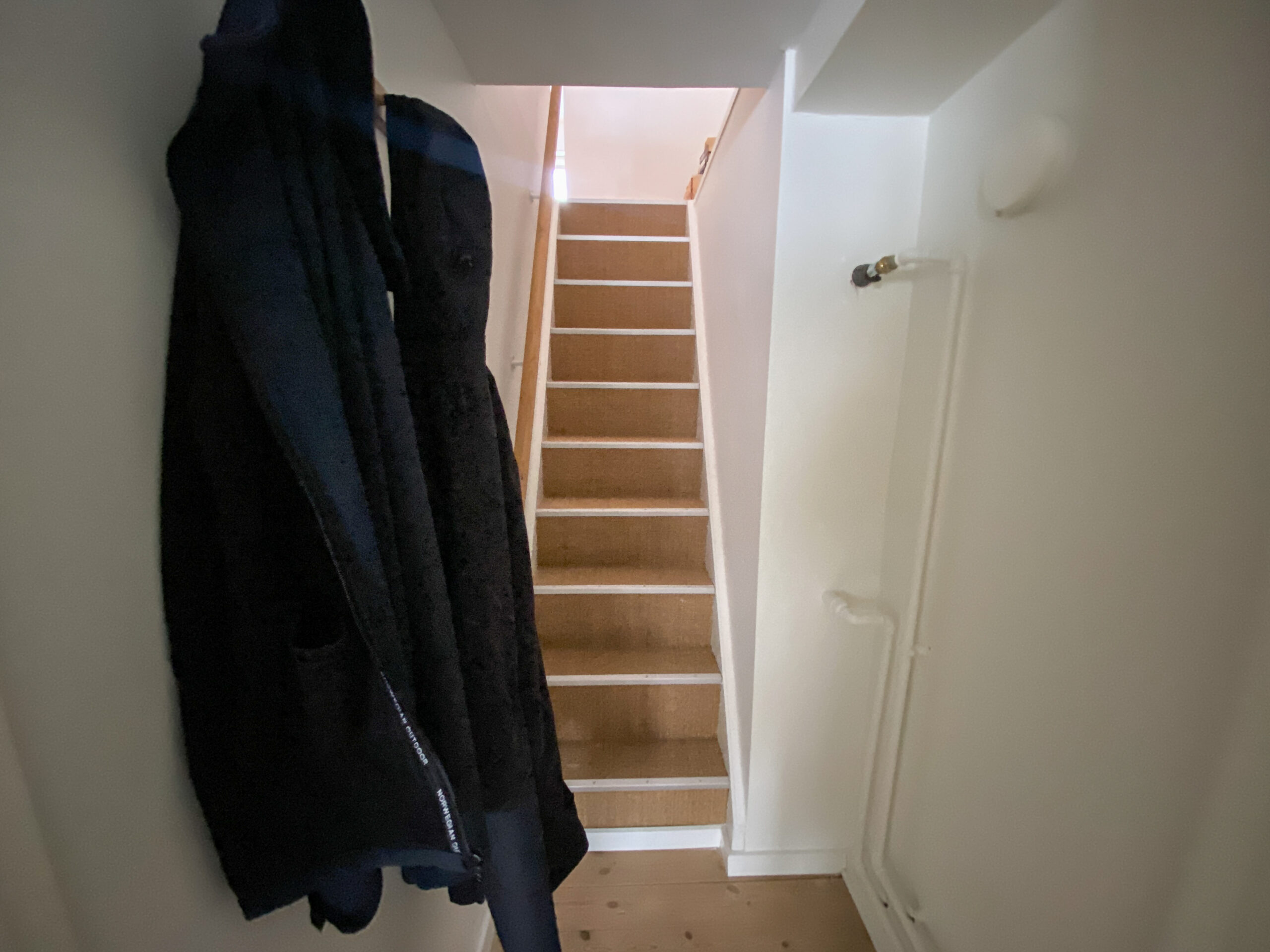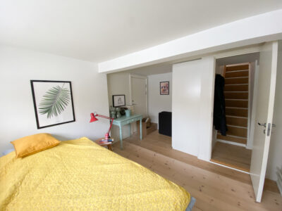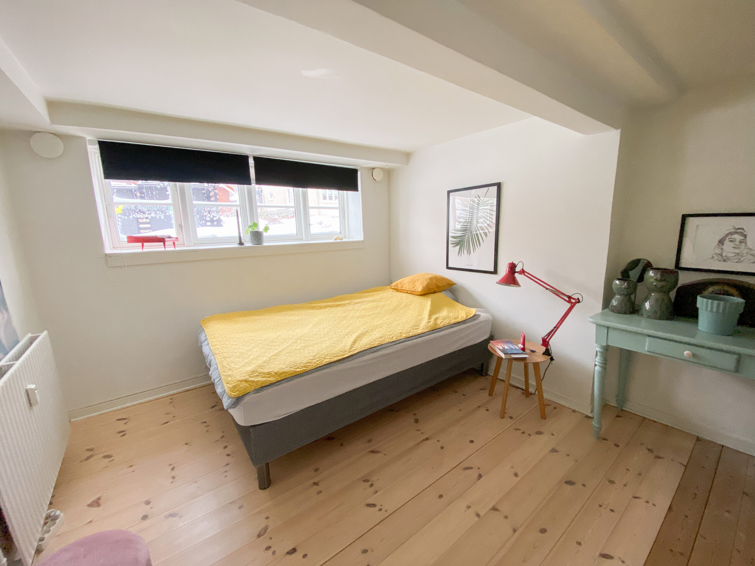 Fra stuen er der en trappe ned til et ekstra værelse. Det kan bruges til soveværelse eller kontor. Det rummer let en dobbeltseng og skrivebord m.m.