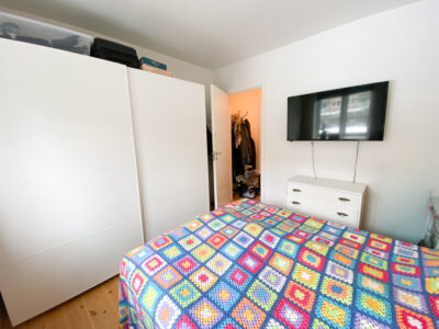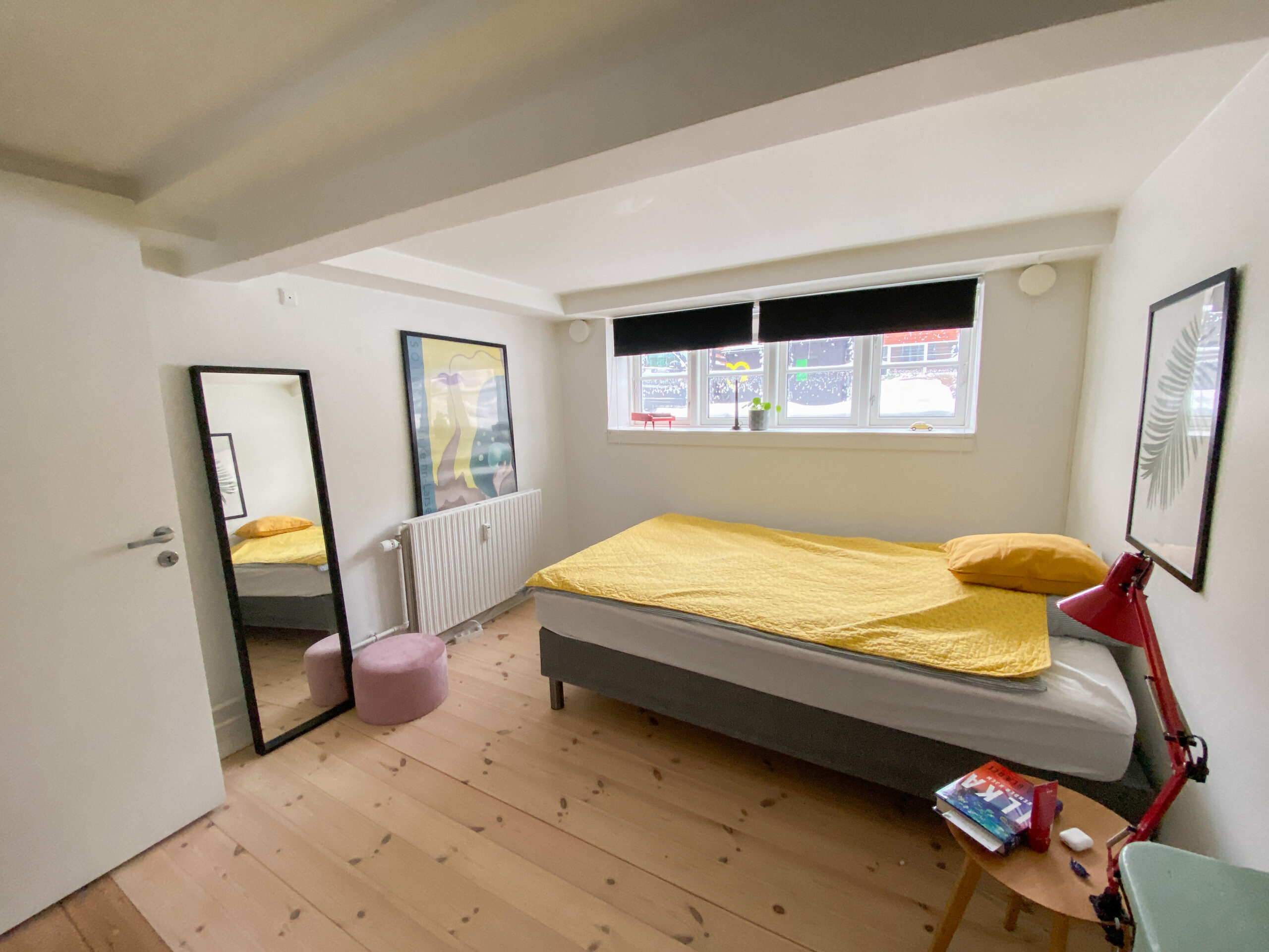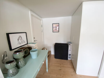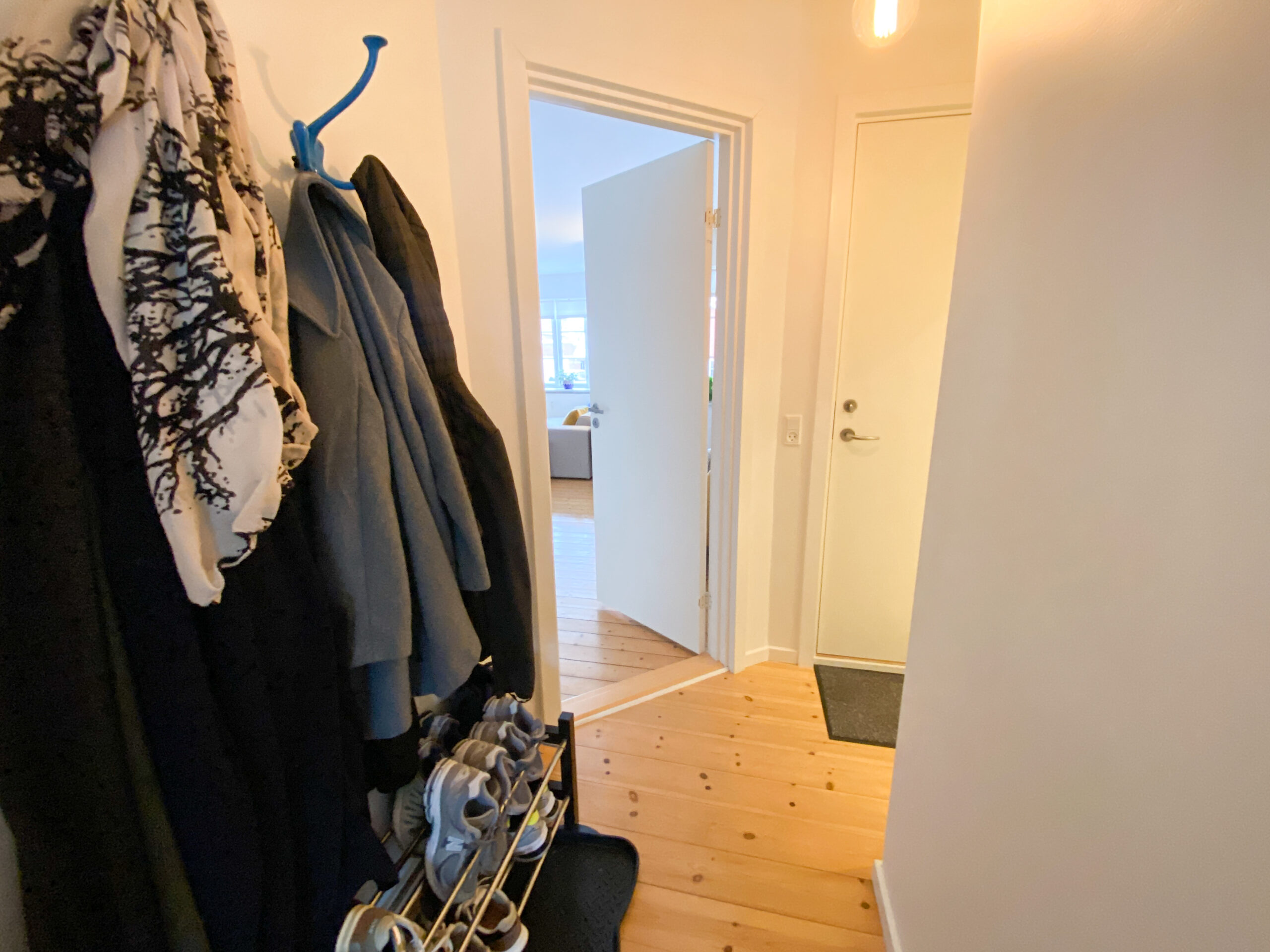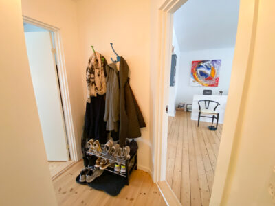 Velkommen til denne skønne lejlighed, som byder på både moderne komfort og hyggelige omgivelser. Når du træder ind, mødes du af en fordelingsgang, som giver adgang til lejlighedens forskellige rum. Lige fremme finder du det dejlige soveværelse, der vender ud mod det rolige havemiljø. Soveværelset er indrettet med et stort og elegant klædeskab, som sørger for rigelig opbevaringsplads.