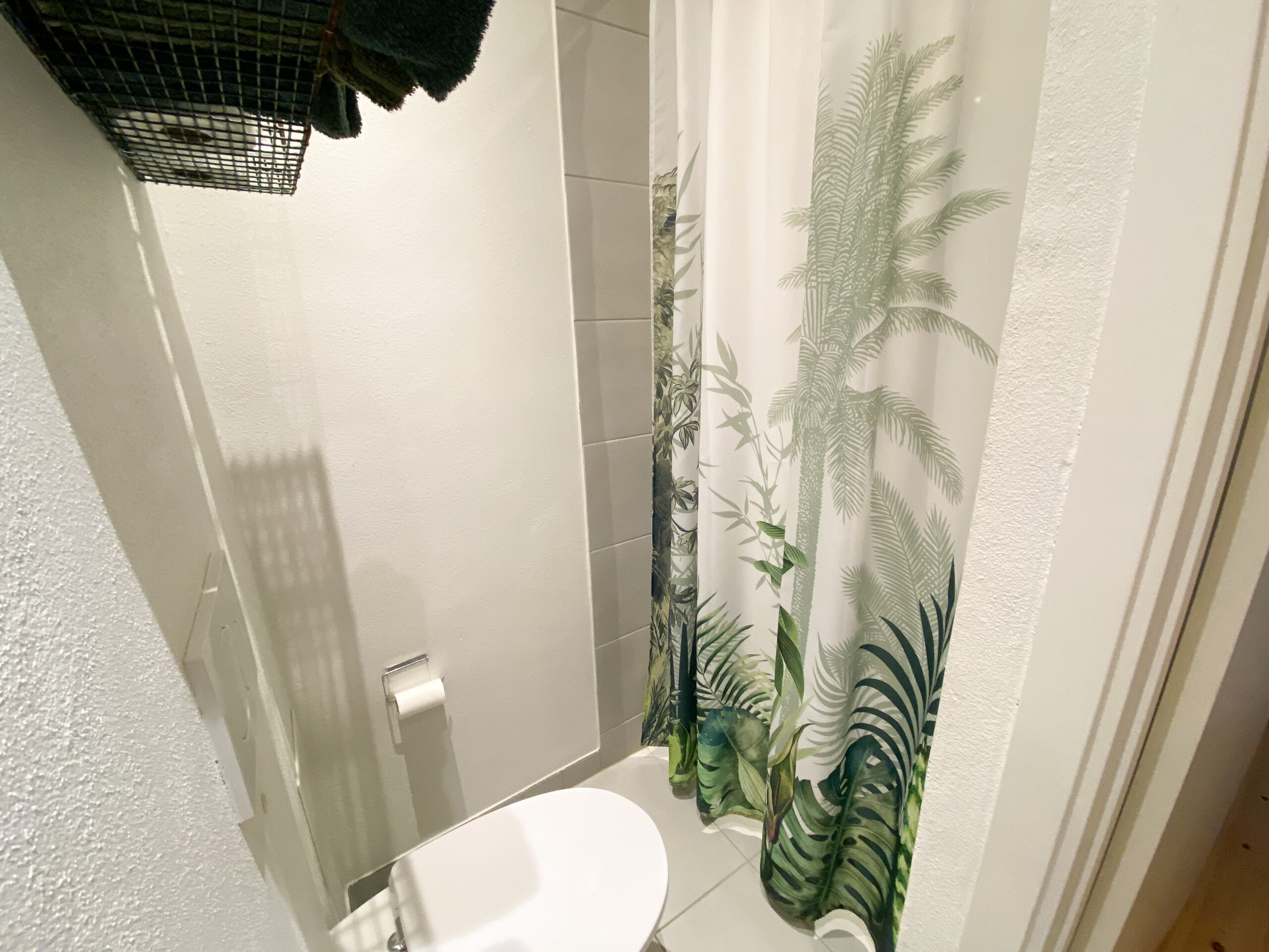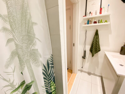 Badeværelset, som er totalrenoveret, fremstår moderne og stilrent med sine hvide og lysegrå fliser. Her er en indbygget bruseniche, der giver et minimalistisk udtryk, og den store håndvask med god bordplads gør rummet både praktisk og elegant.