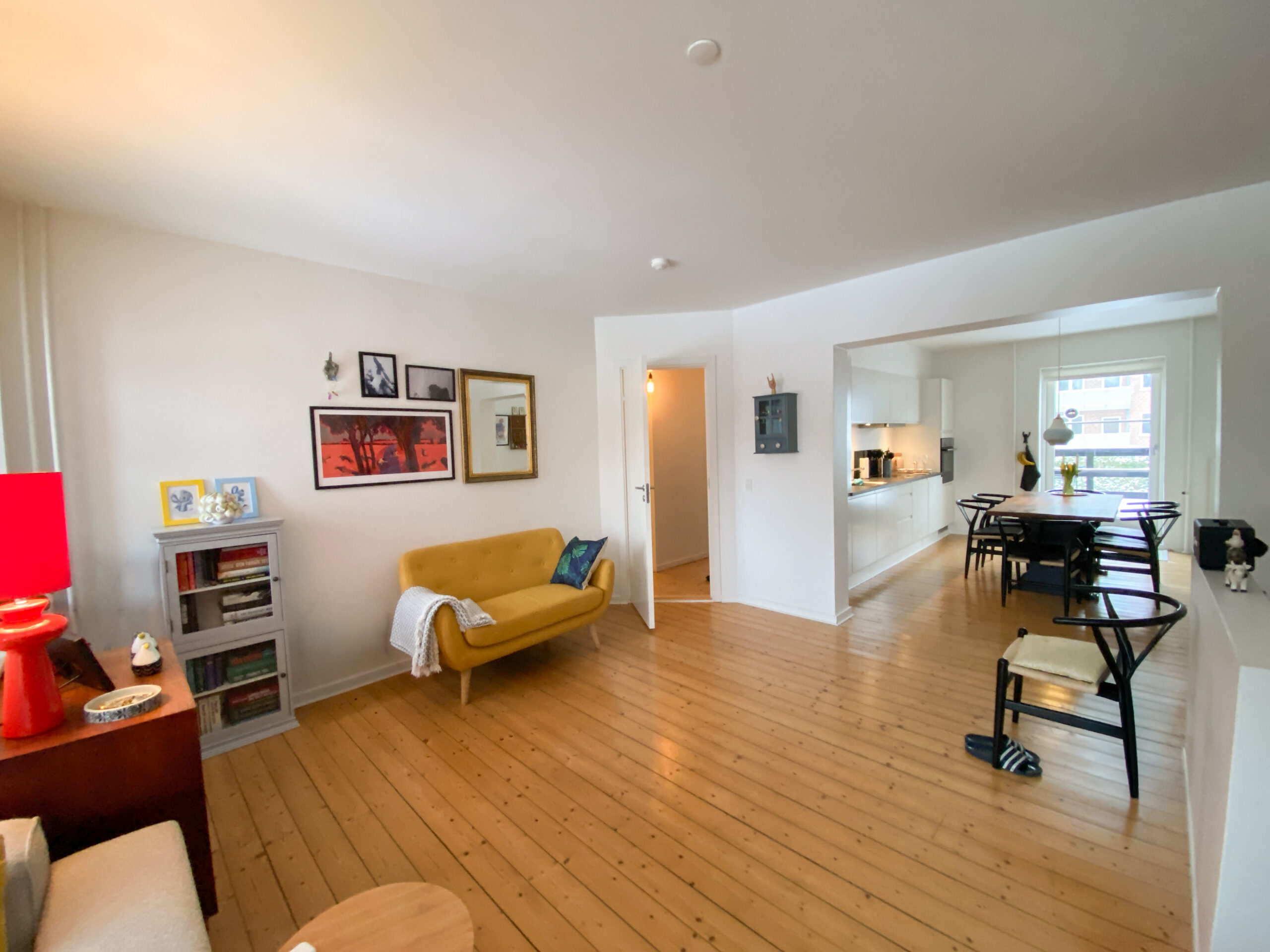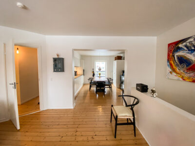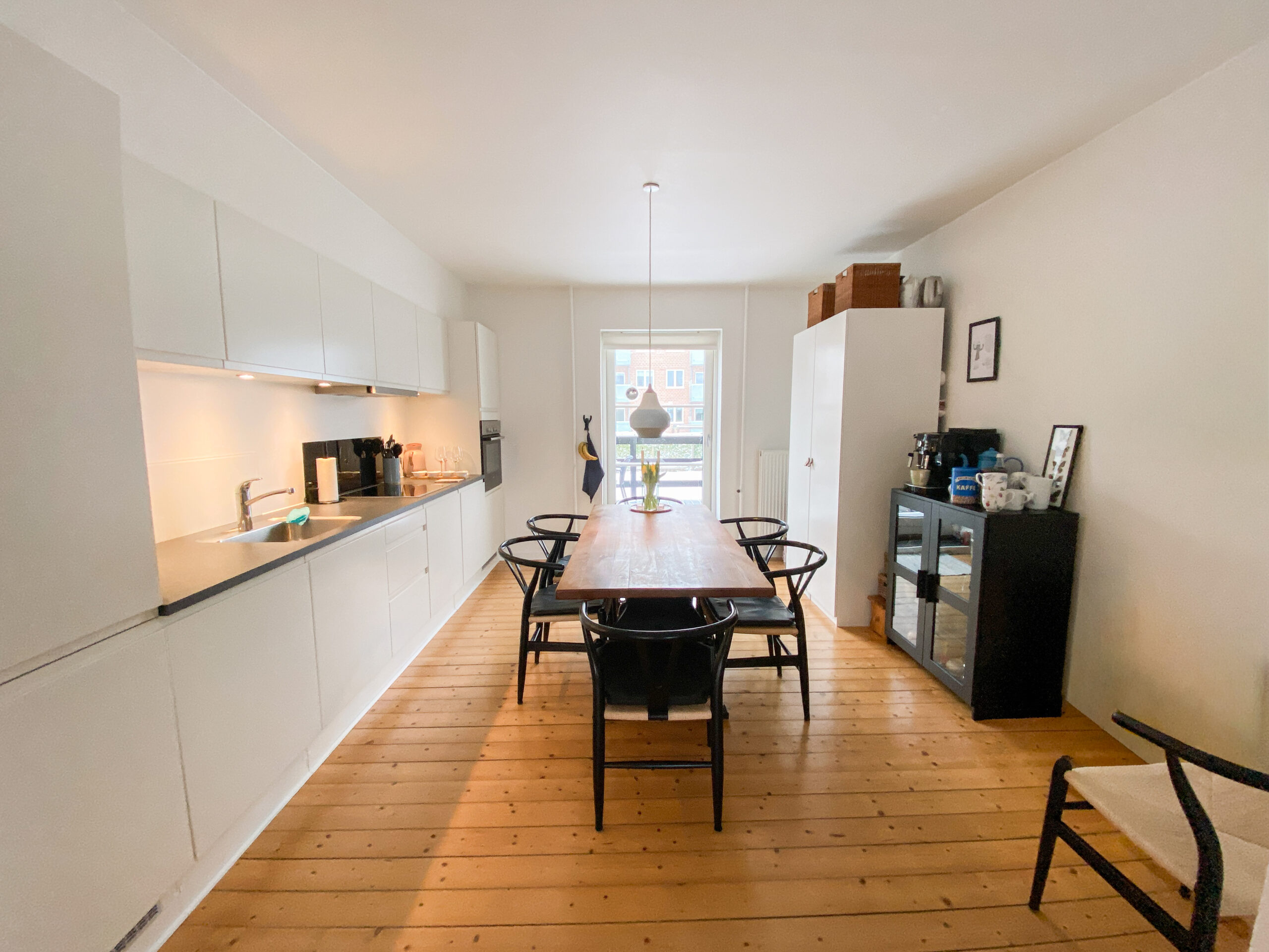 Til højre for indgangen åbner lejligheden sig op i store, åbne opholdsrum. Opholdsstuen er lys og rummelig og har direkte udgang til en privat altan, hvor du kan nyde udelivet. I den anden ende af rummet finder du et moderne køkkenalrum med hvide elementer og alt i hårde hvidevarer, herunder både opvaskemaskine og vaskemaskine. Køkkenet er stilfuldt indrettet med fokus på funktionalitet og har plads til et stort spisebord, hvilket gør det oplagt til hyggelige middage med familie og venner.
