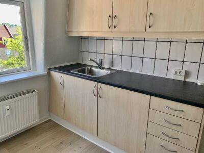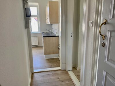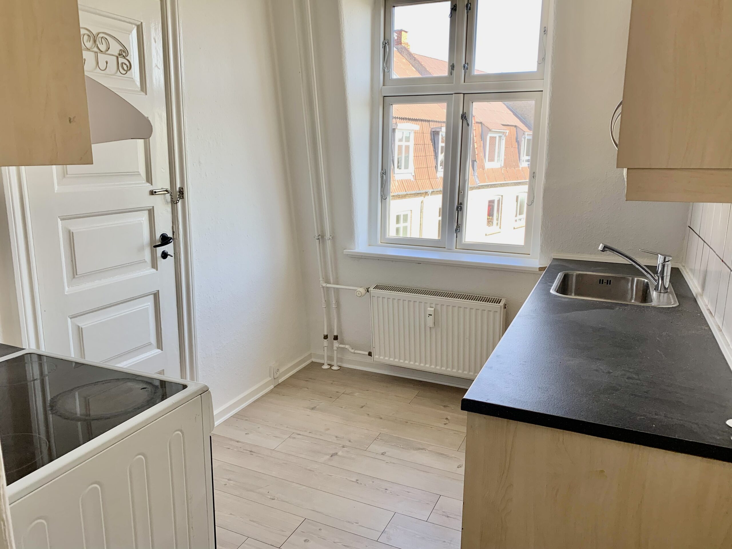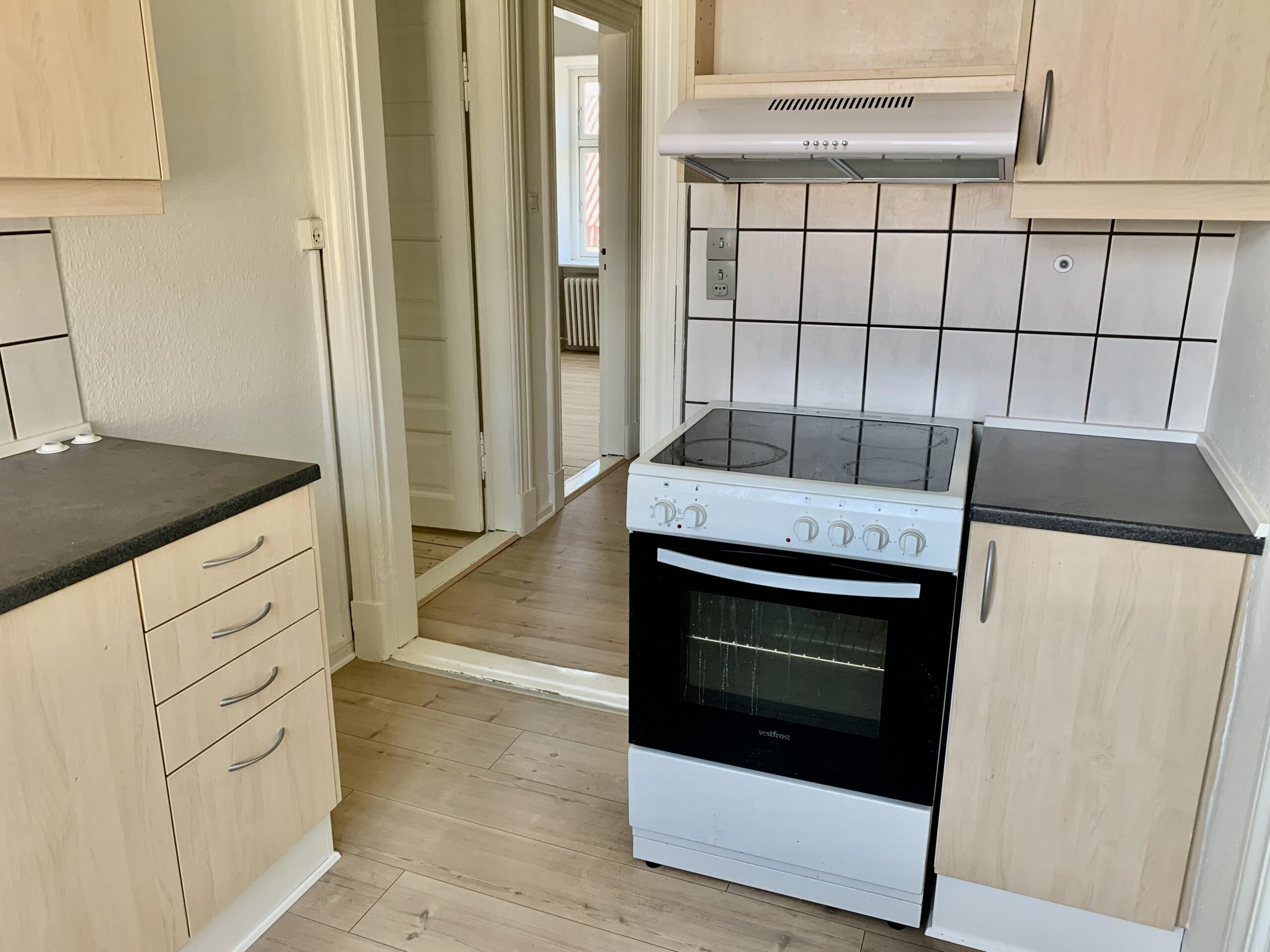 Lejligheden er flot og lys med en entré, der først fører ud i køkkenet. Det er fint i lyst træ og godt med gulvplads.