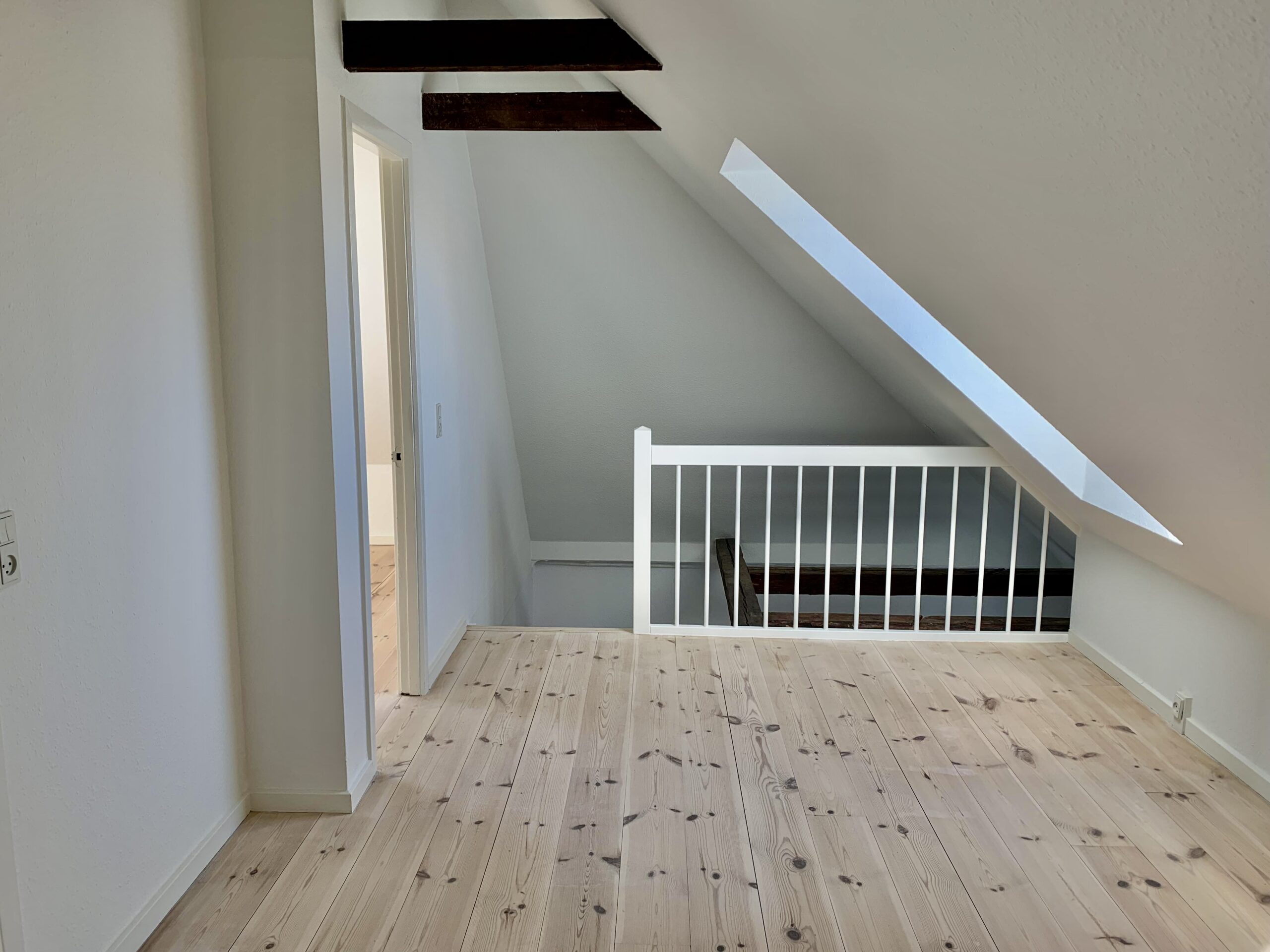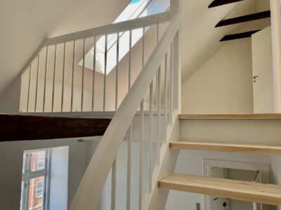 Næst har vi stuen. Det kan eventuelt bruges til spisestue, for der er en trappe op til 1. salen, hvor man eventuelt kan have noget stue-areal. I forbindelse med det, er der indgang til et mindre værelse. Dette kan bruges til værelse eller kontor. Ved siden af værelset har vi endnu et badeværelse.