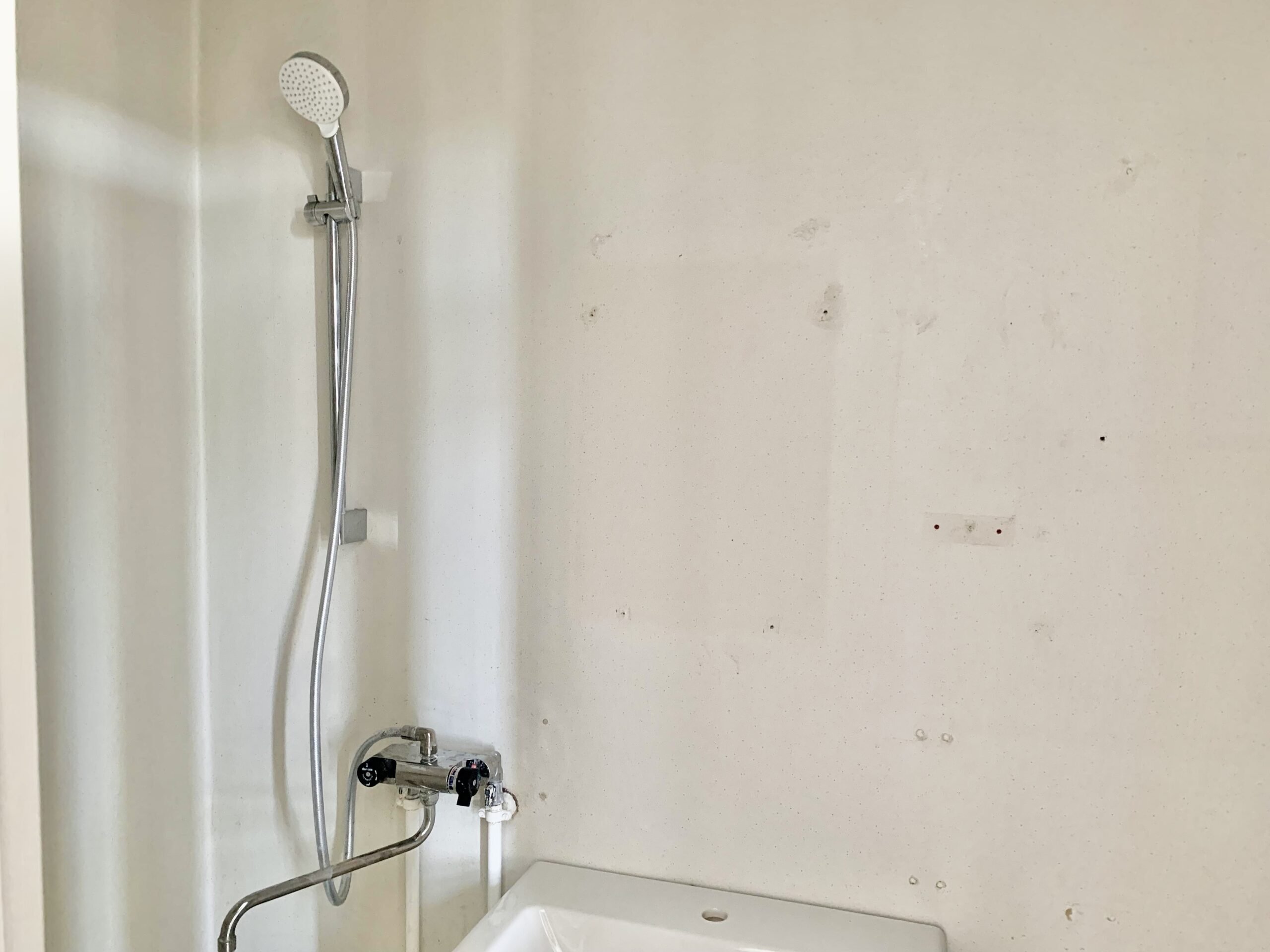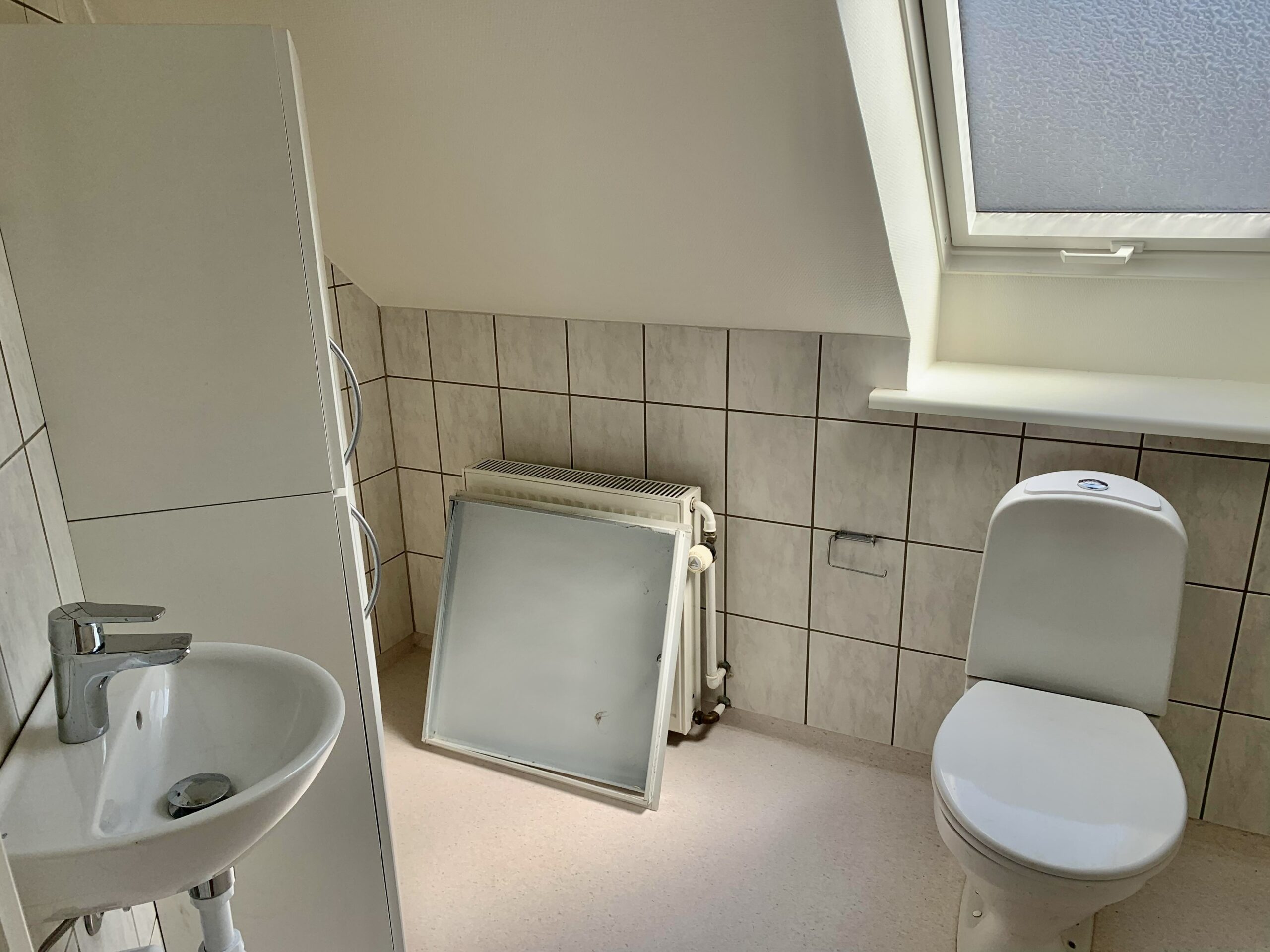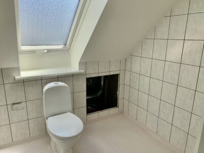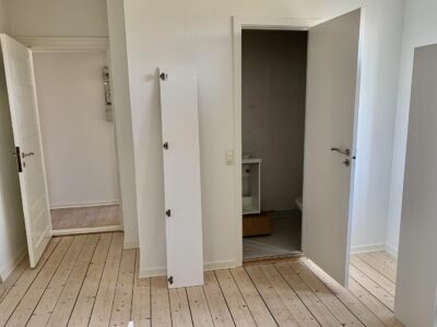 Så har vi soveværelset, som er et stort rum med et lækkert skabsparti. Fra værelset er der indgang til et rum med bad, håndvask og toilet.