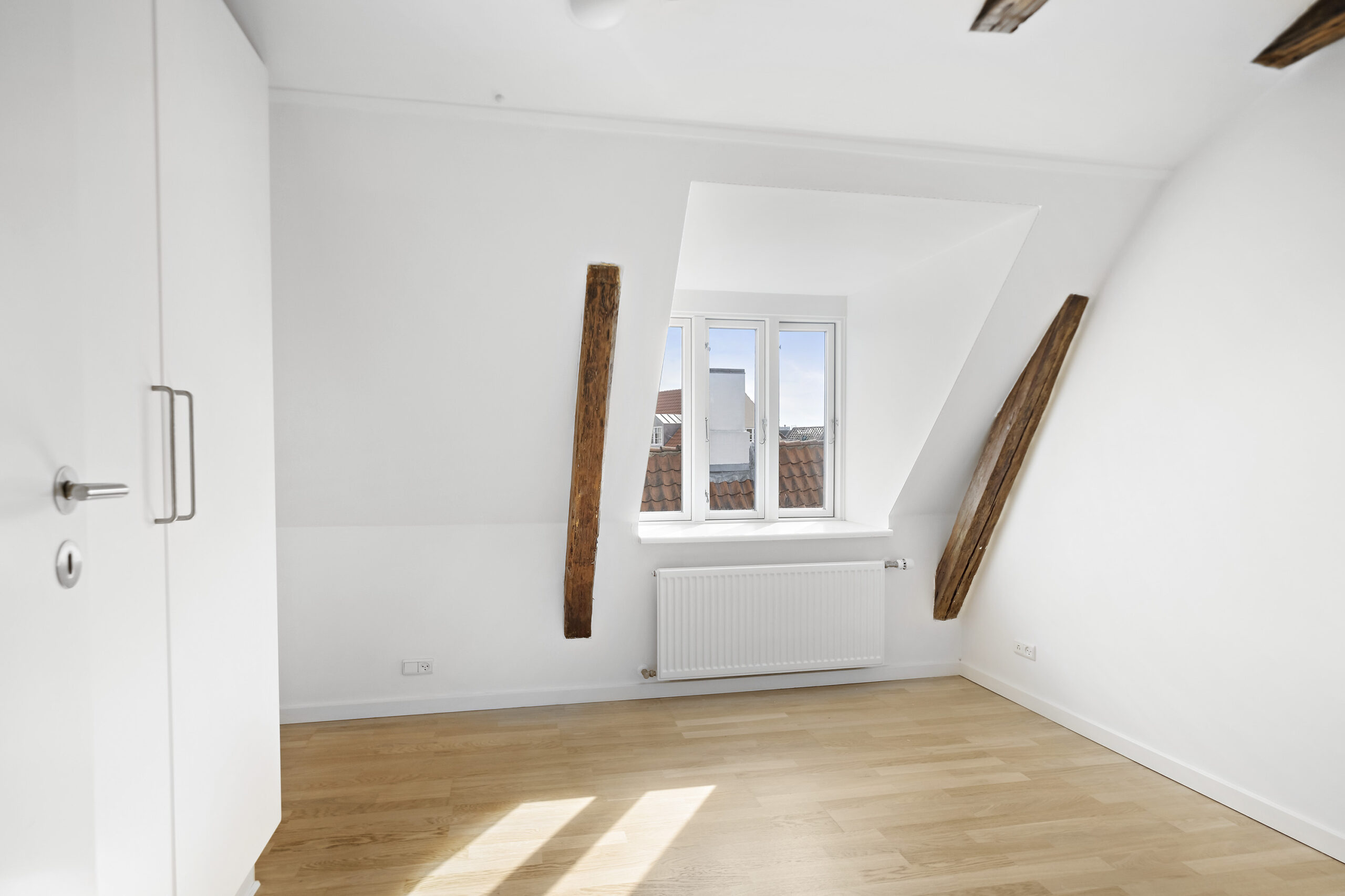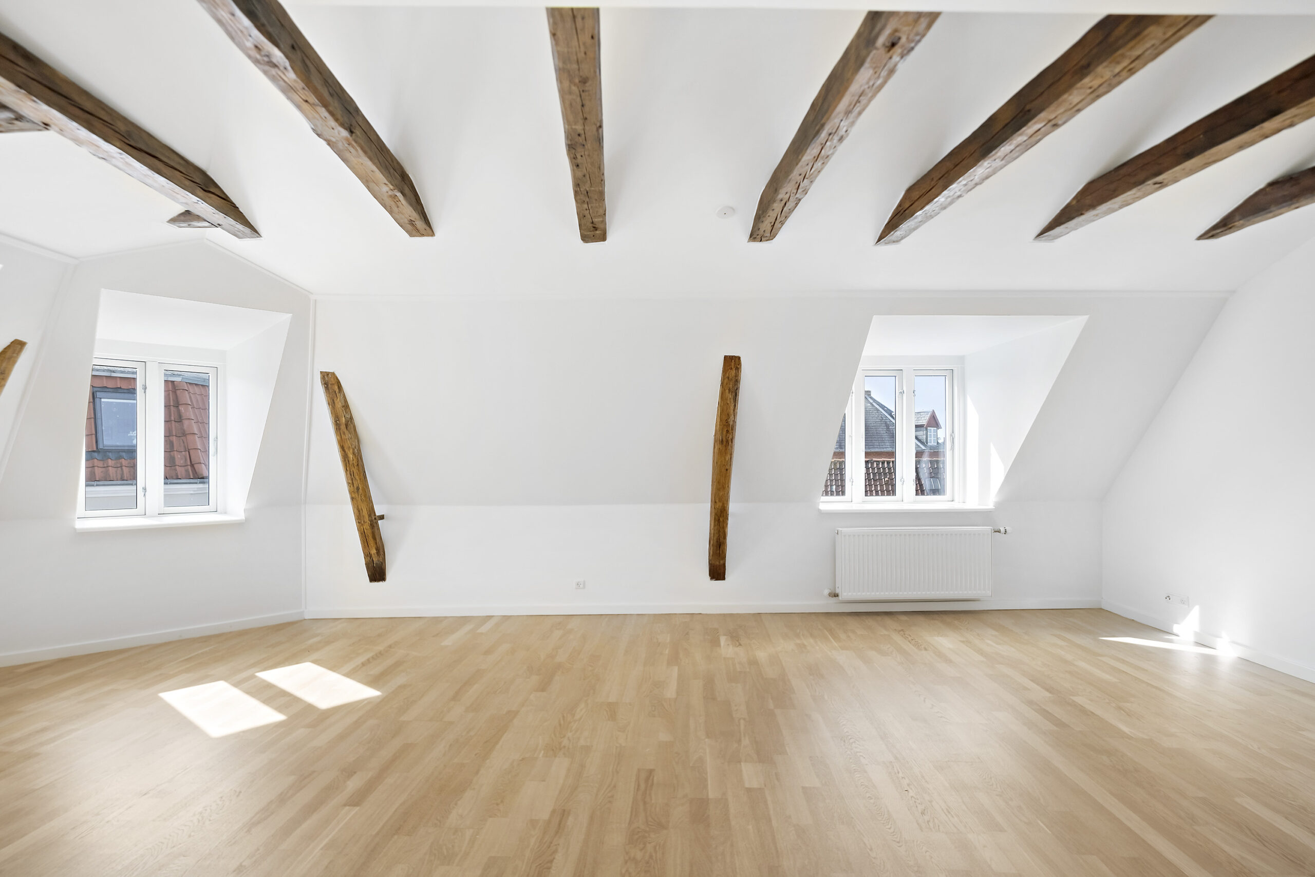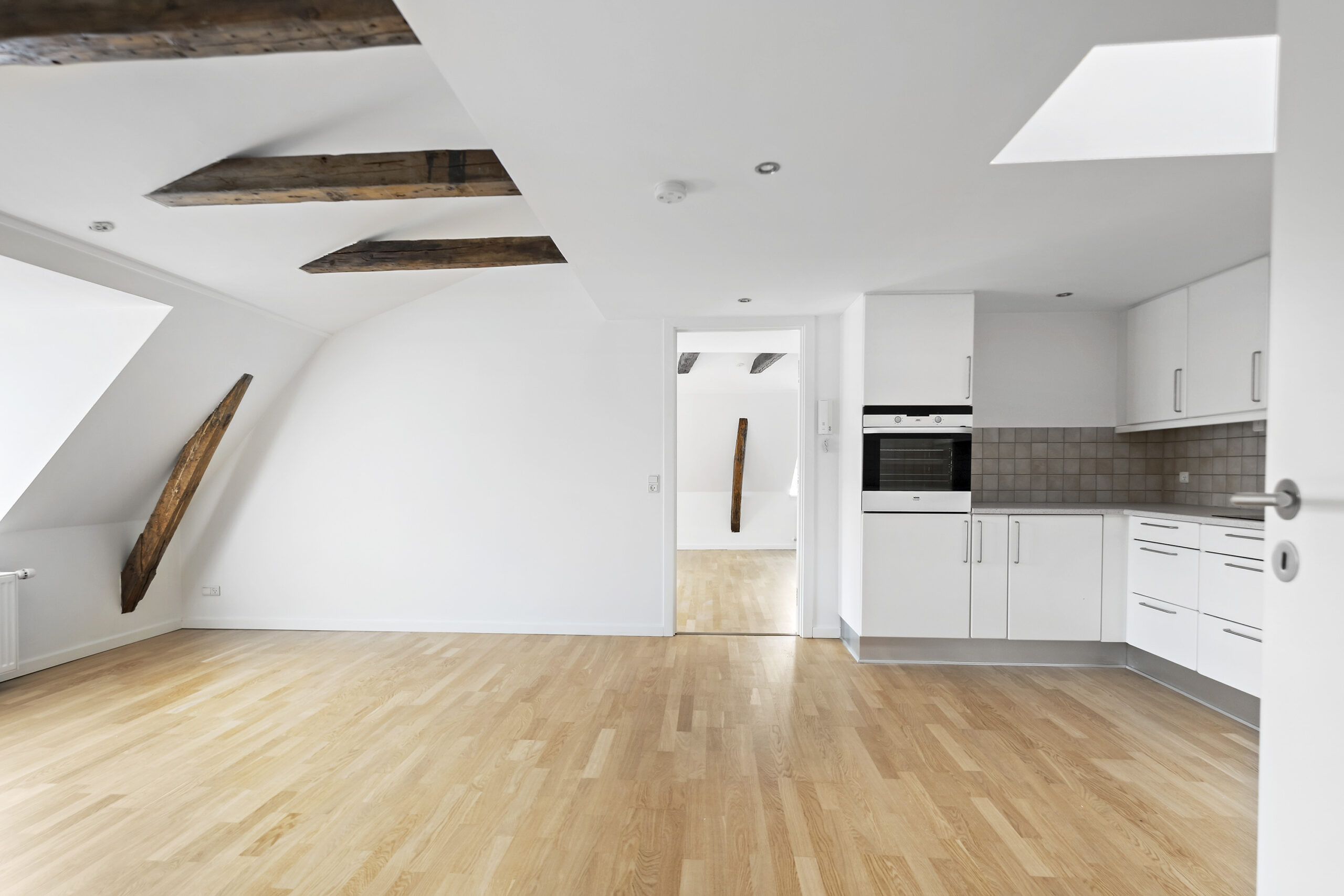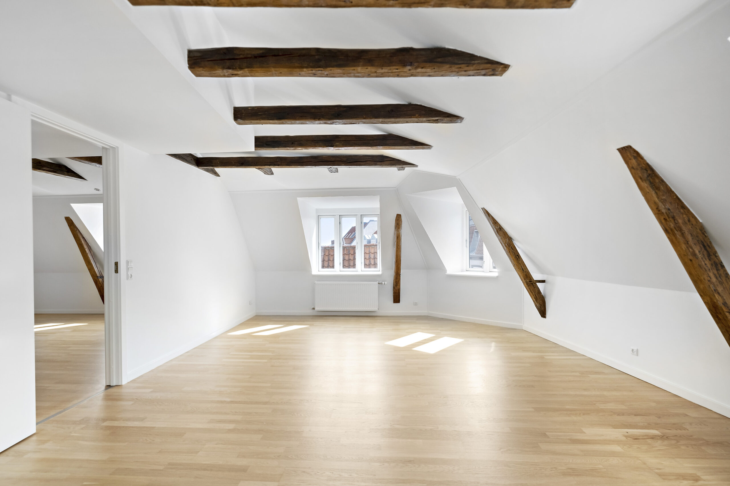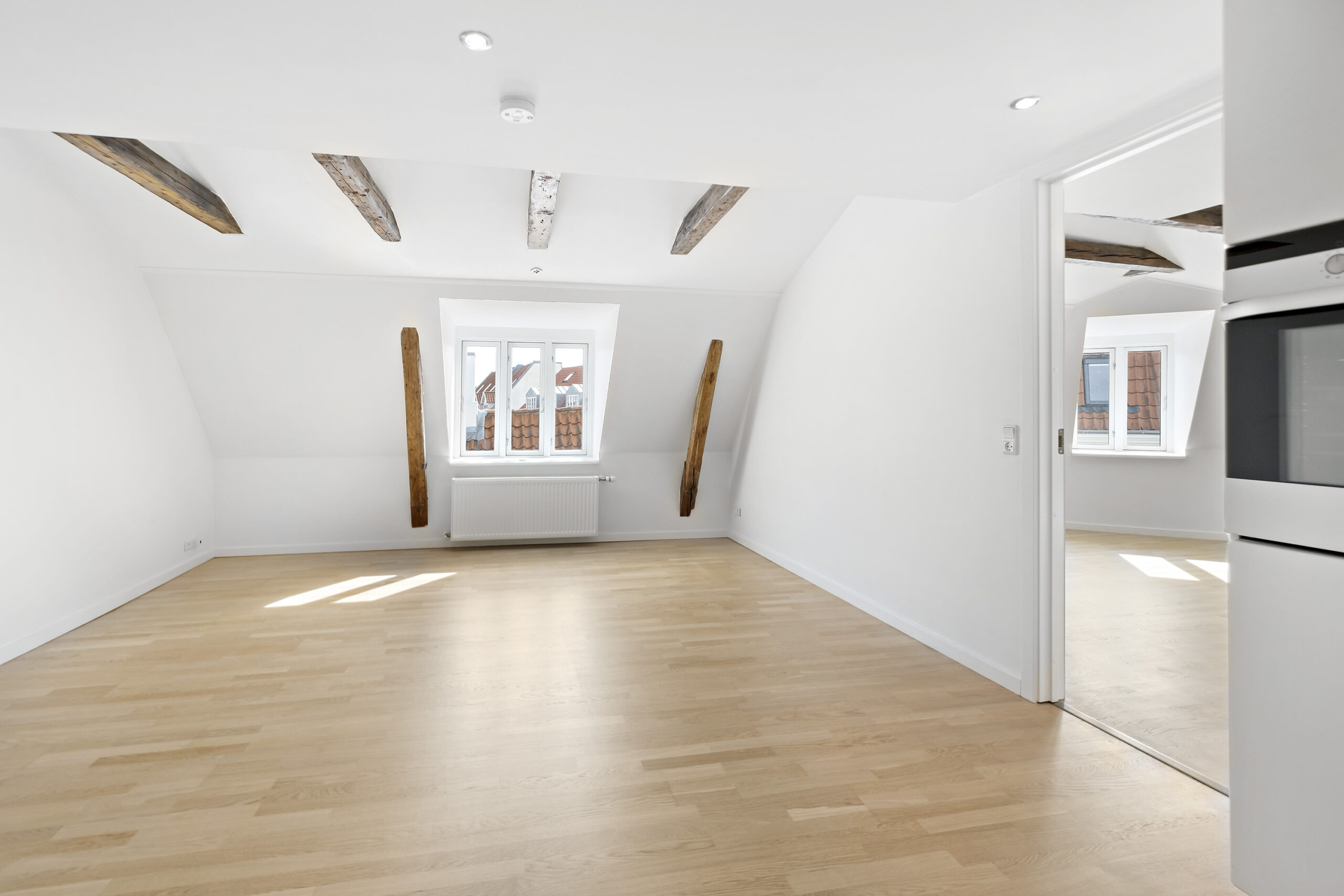 Lejligheden byder på en lys og rummelig entré, der fører ind til et flot badeværelse med bruseniche og en kombineret vaskemaskine og tørretumbler, der giver dig al den komfort, du har brug for. Det lyse soveværelse er indrettet med garderobeskabe, mens det lækre køkkenalrum inviterer til samvær med sine mange skabs- og bordplads. Den store opholdsstue med flotte trægulve og smukke fritlagte bjælker skaber en varm og indbydende stemning, og fra vinduerne er der et skønt udsyn til gågaden og over byens tage.