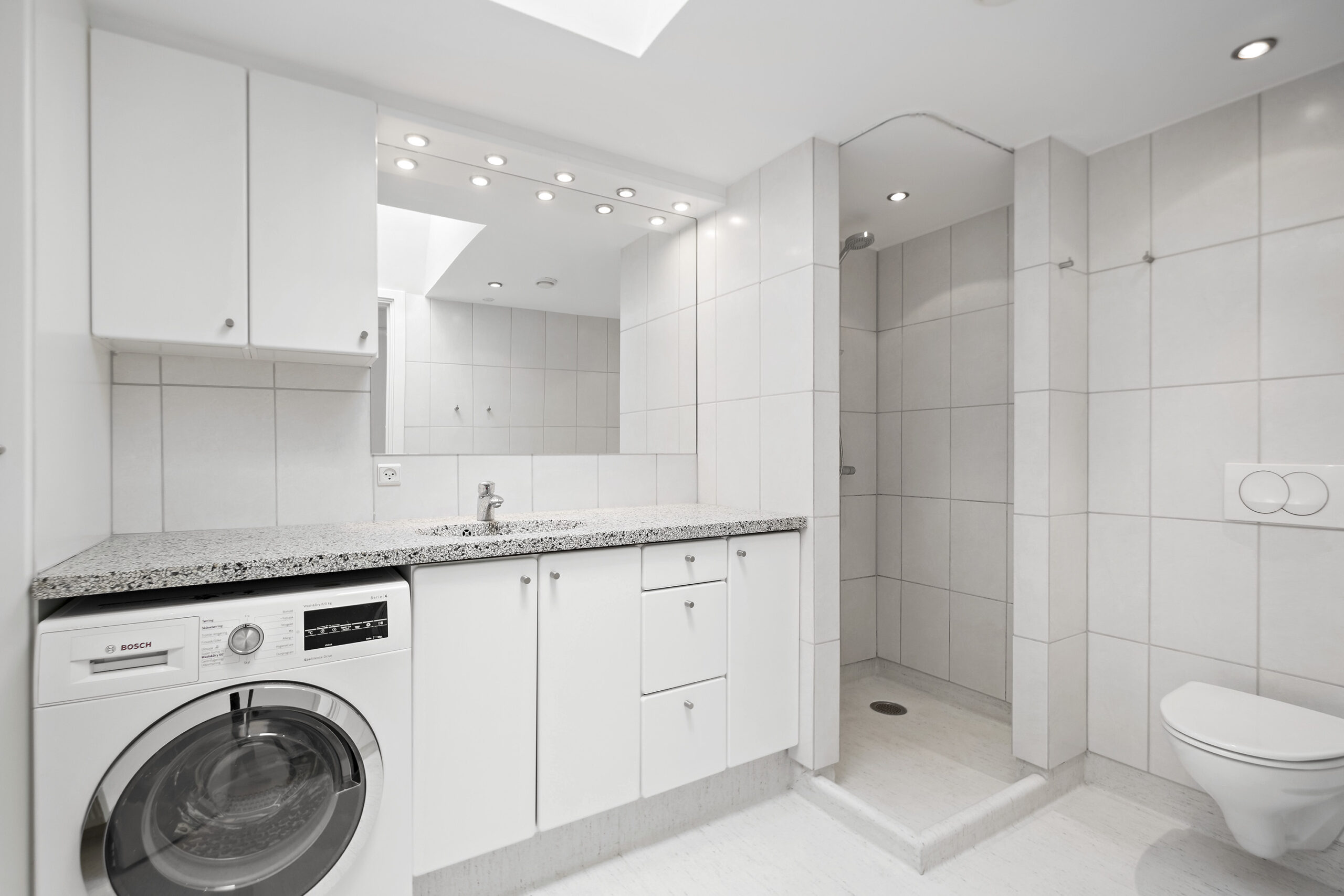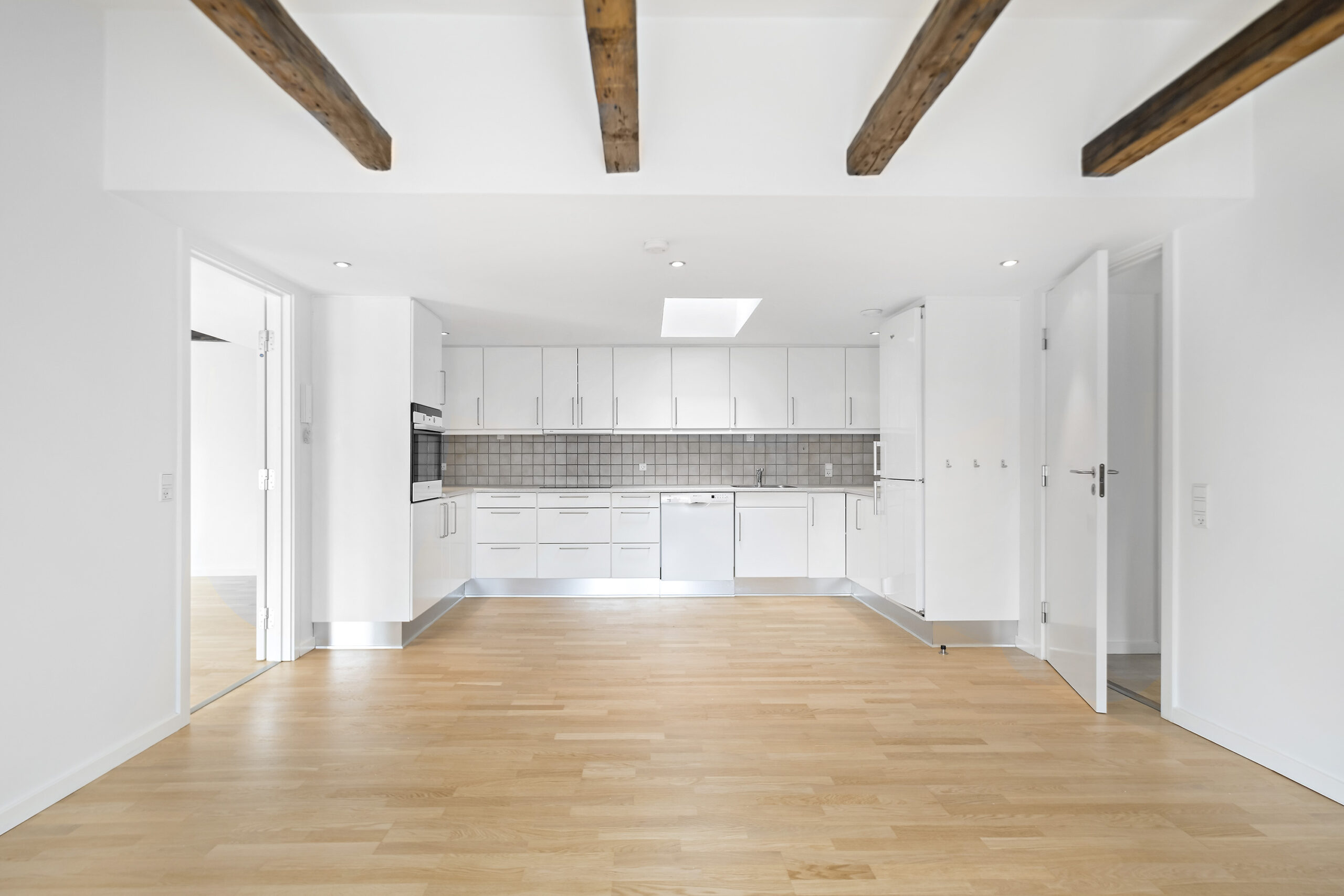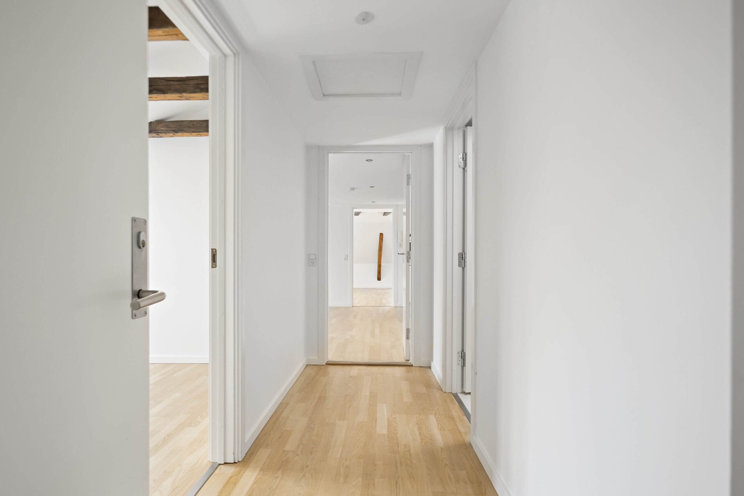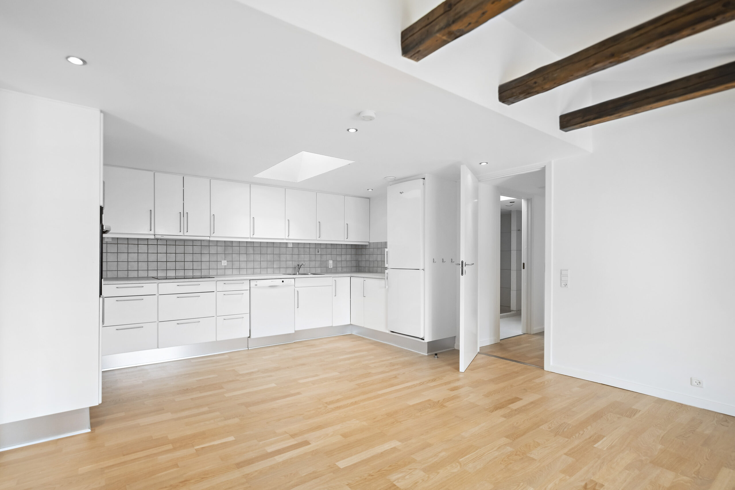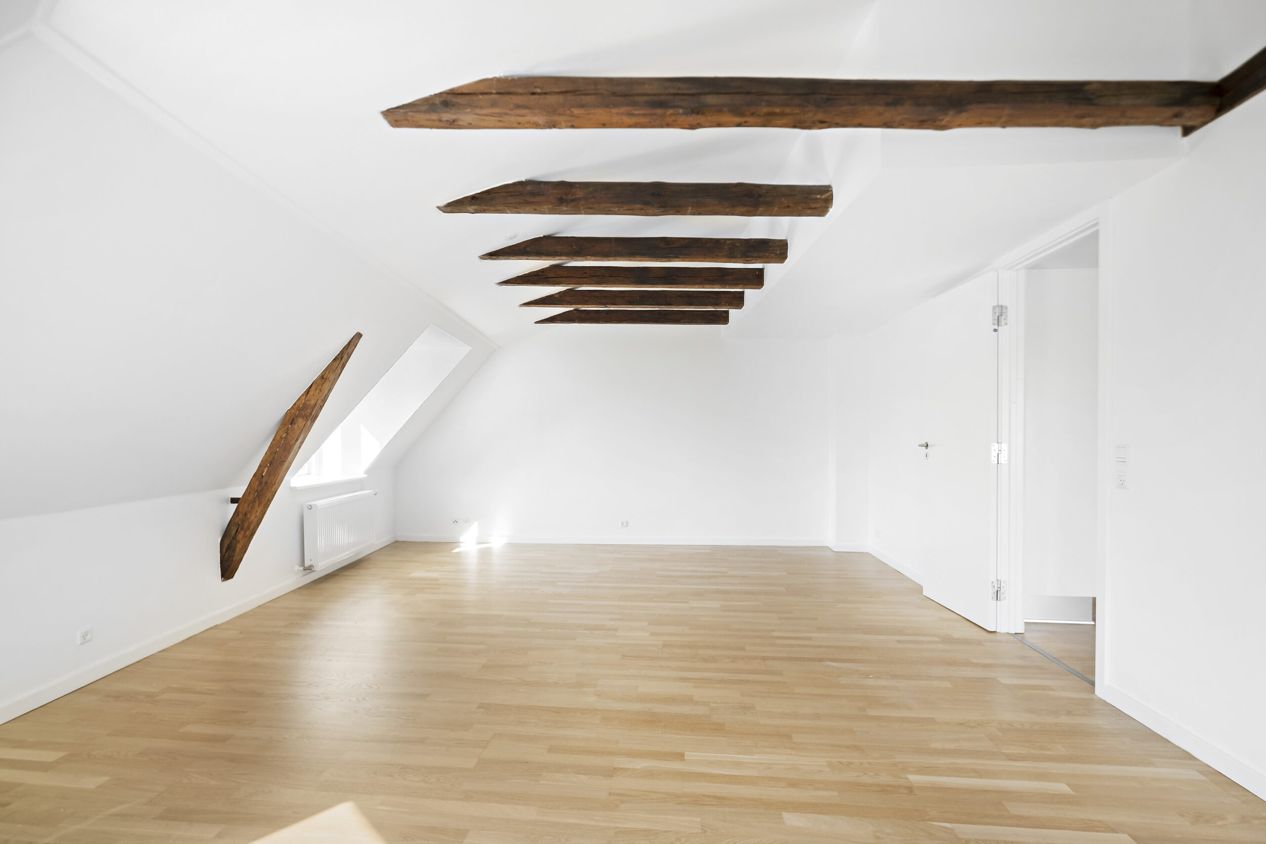 Lejligheden byder på en lys og rummelig entré, der fører ind til et flot badeværelse med bruseniche og en kombineret vaskemaskine og tørretumbler, der giver dig al den komfort, du har brug for. Det lyse soveværelse er indrettet med garderobeskabe, mens det lækre køkkenalrum inviterer til samvær med sine mange skabs- og bordplads. Den store opholdsstue med flotte trægulve og smukke fritlagte bjælker skaber en varm og indbydende stemning, og fra vinduerne er der et skønt udsyn til gågaden og over byens tage.