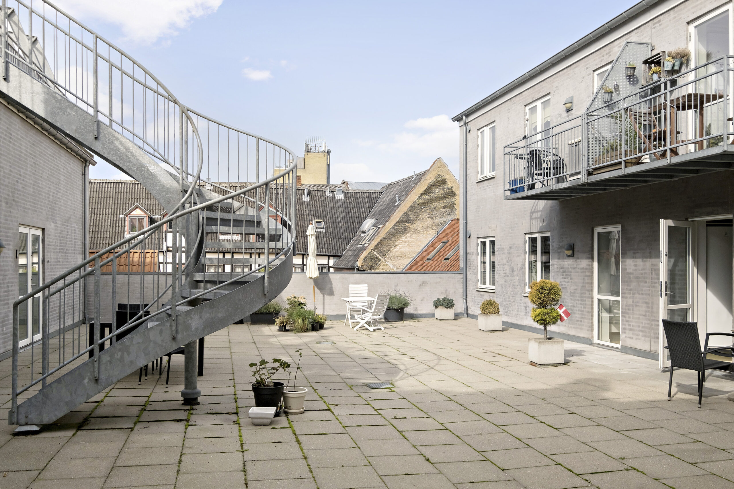 Ejendommen rummer en elevator, der nemt fører dig op til 2. sal, hvor lejligheden ligger. Den store fælles tagterrasse er en stille oase, hvor du kan nyde solen og byens liv i fred og ro.