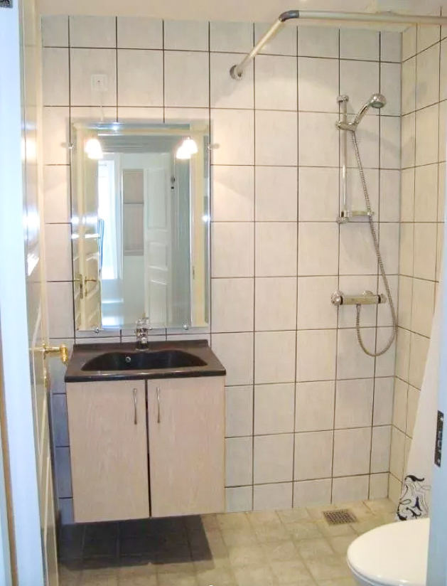 Badeværelset er udført med fliser på både gulv og vægge, hvilket giver et moderne og funktionelt udtryk.