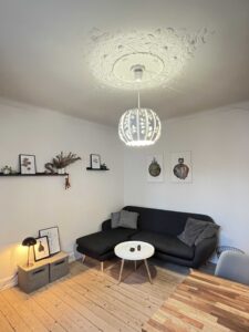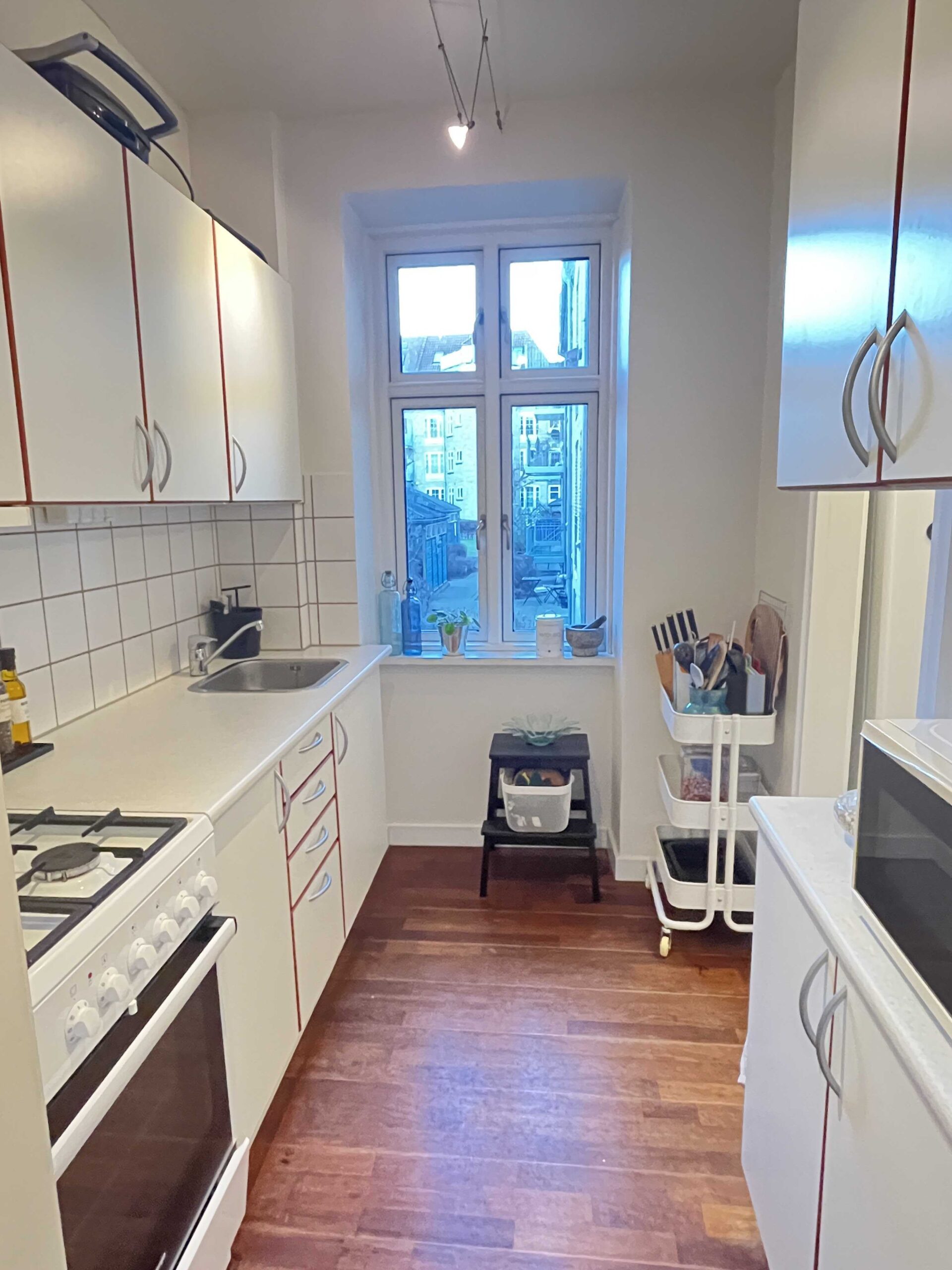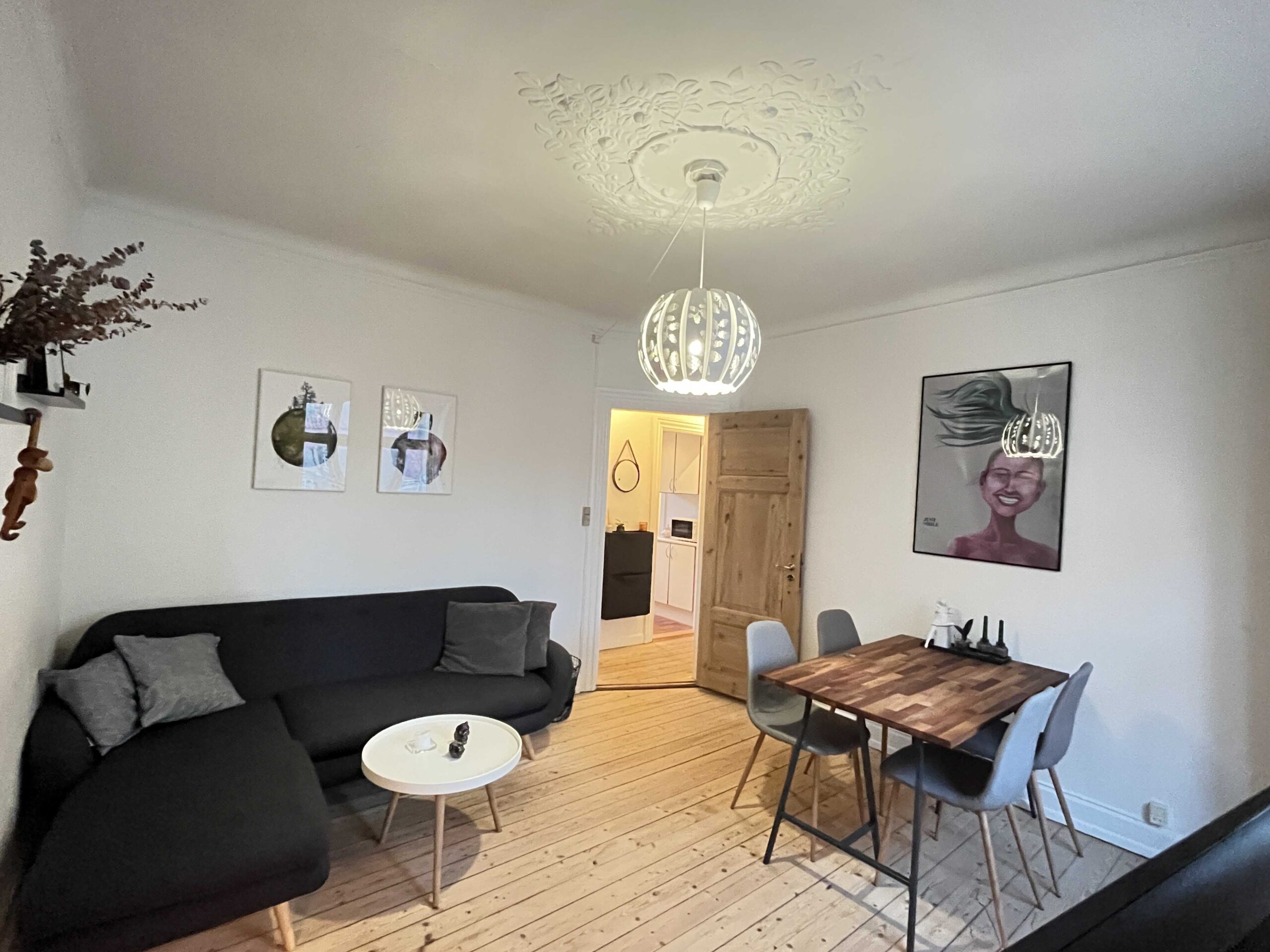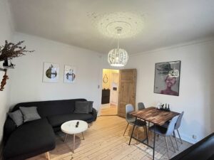I en høj stueetage (hvor man ikke kan kigge ind, finder du denne nyistandsatte, lyse og velindrettede lejlighed med fordelingsentre, hyggeligt køkken, et flot badeværelse samt 2 værelser med stuklofter og flotte lyse nyhøvlede plankegulve. I soveværelset er der fransk altan og godt med skabsplads.