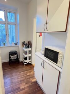 Der er vaske- og tørremulighed i kælderen og parkeringsmulighed for bil lige uden for ejendommen.