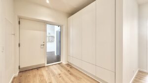 Du træder ind i entre med spots og faste skabe – god opbevaringsplads.