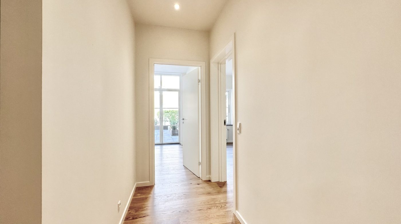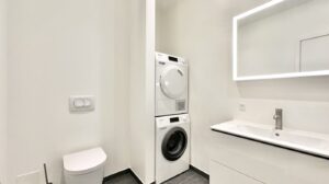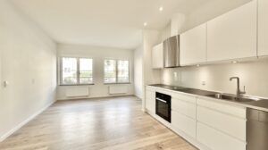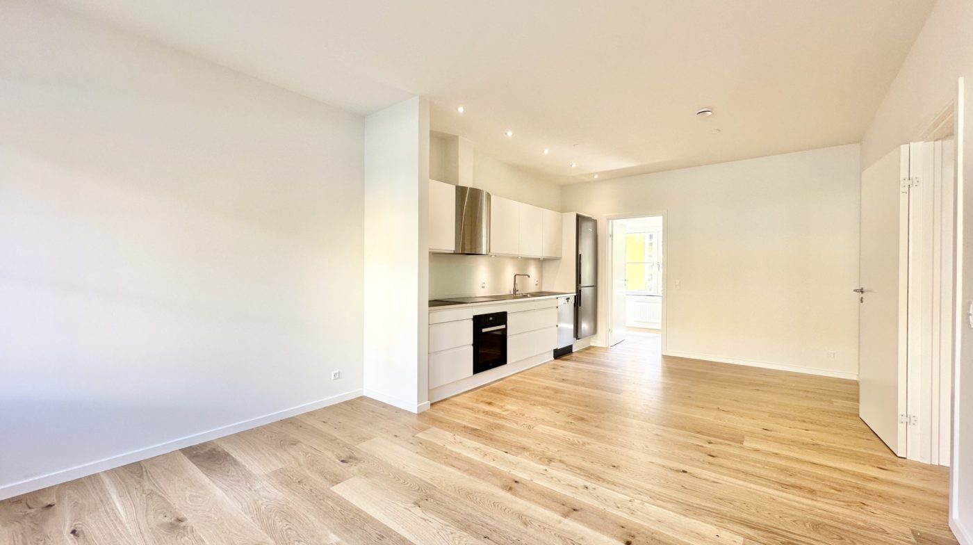 Lejligheden er udstyret med et lyst, moderne køkken med hvide fronter og alle hårde hvidevarer fra Miele, herunder opvaskemaskine. Køkken og stue hænger sammen i ét åbent rum. Der er udgang til din egen terrasse – ideelt til hygge og socialt samvær
