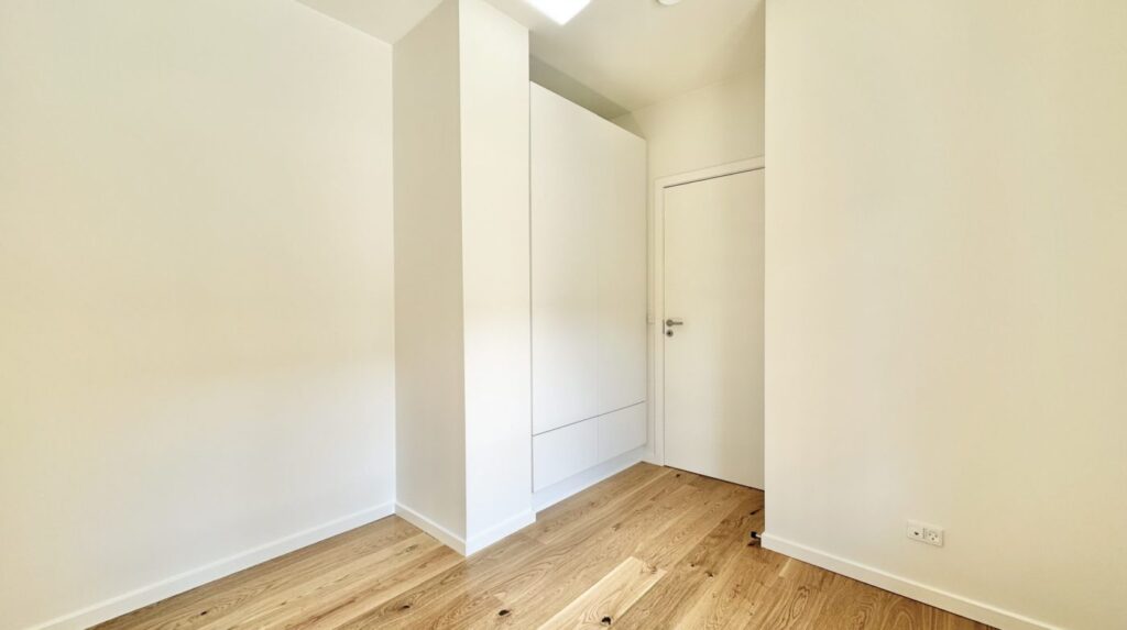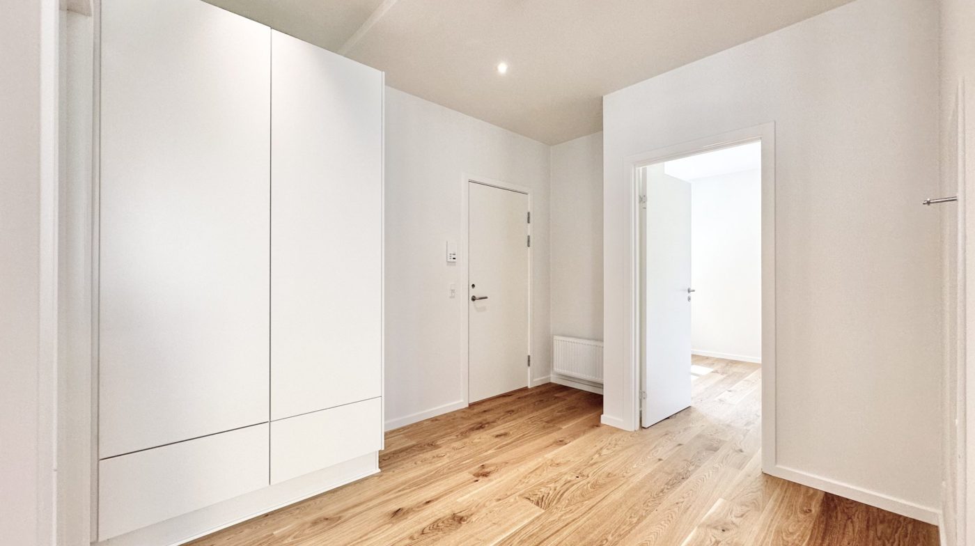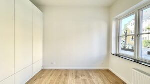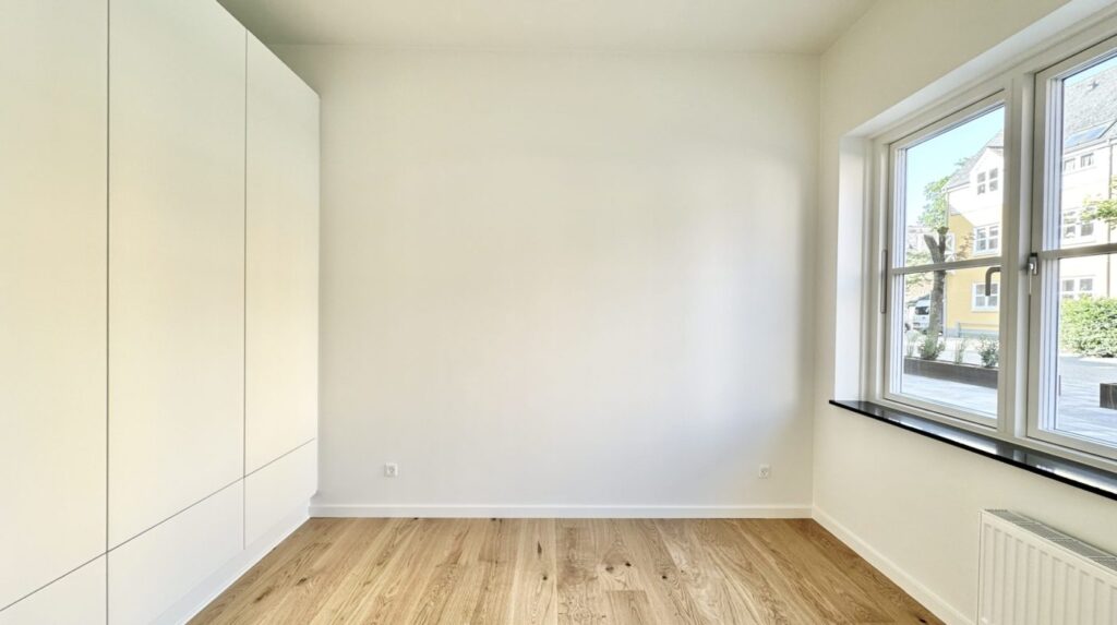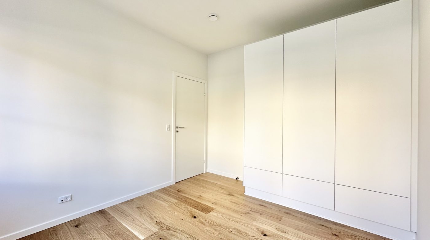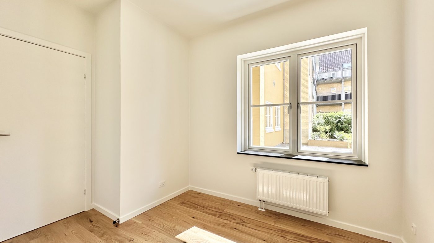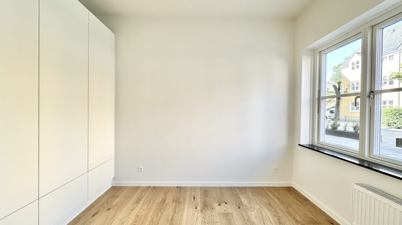 Der er et godt børneværelse med faste skabe samt et ekstra stort soveværelse med faste skabe. Overalt i lejligheden er der elegante egetræsgulve med gulvvarme, som bidrager til en varm og indbydende atmosfære.