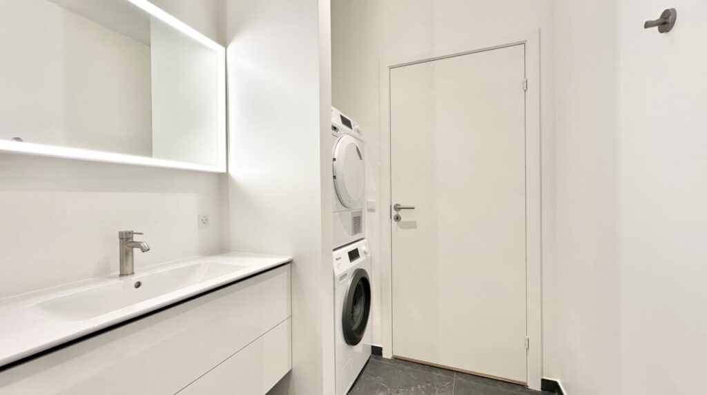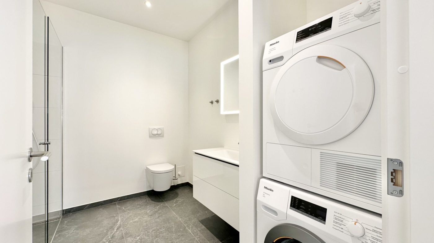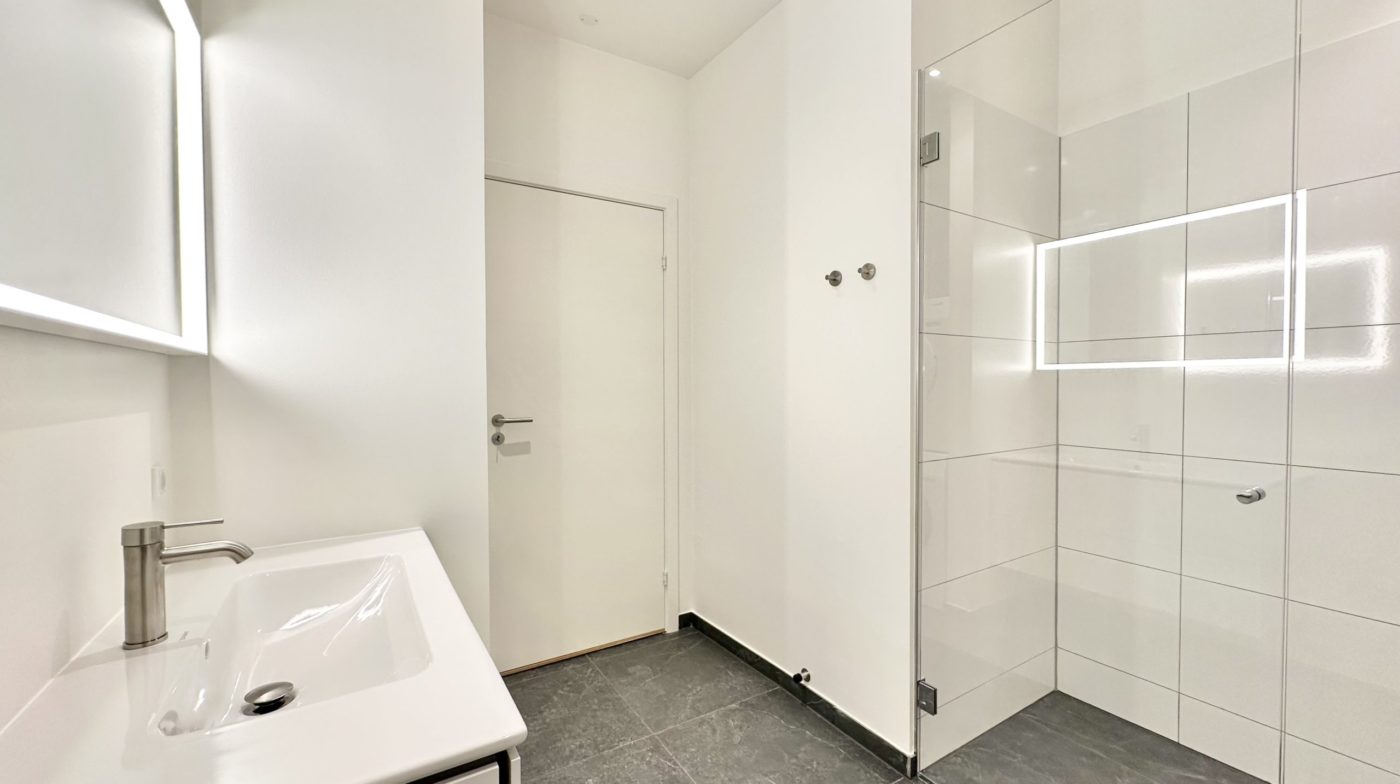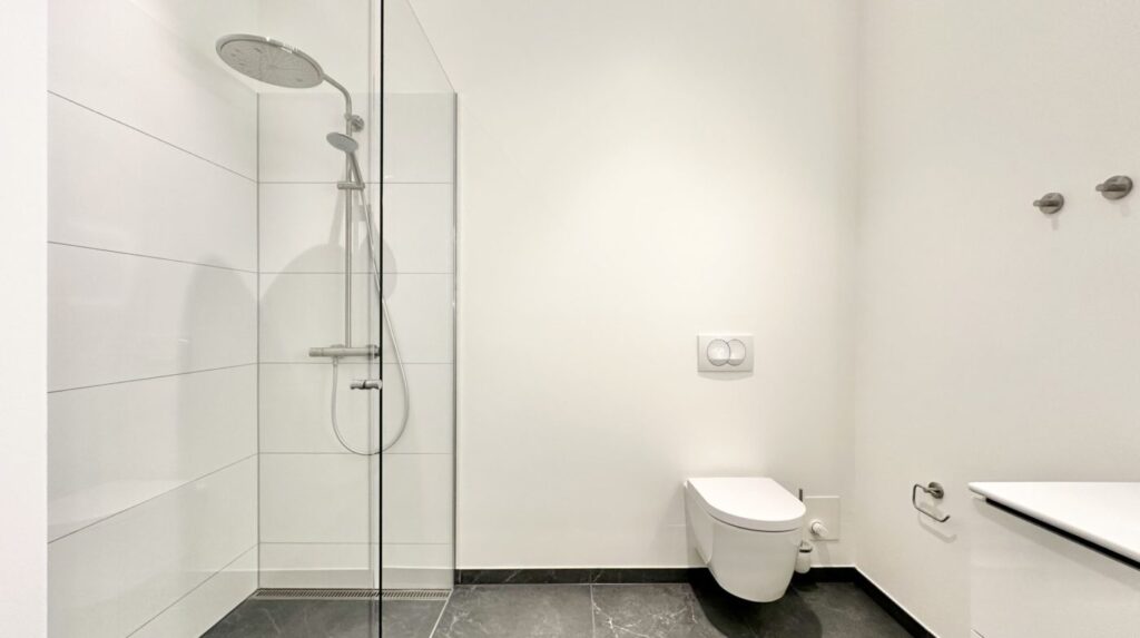 Badeværelset er rummeligt og lækkert med bruseniche, væghængt toilet, interiør fra Duravit, gulvvarme samt vaskemaskine og tørretumbler, hvilket sikrer moderne komfort.