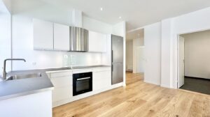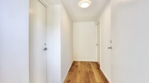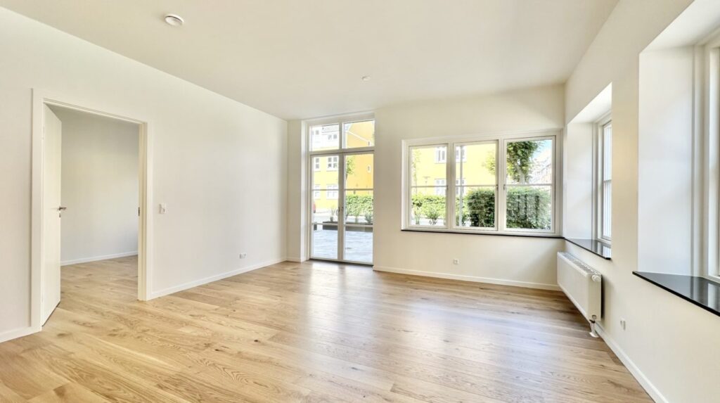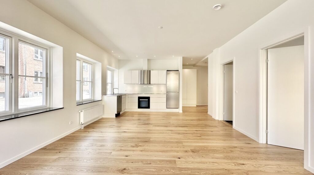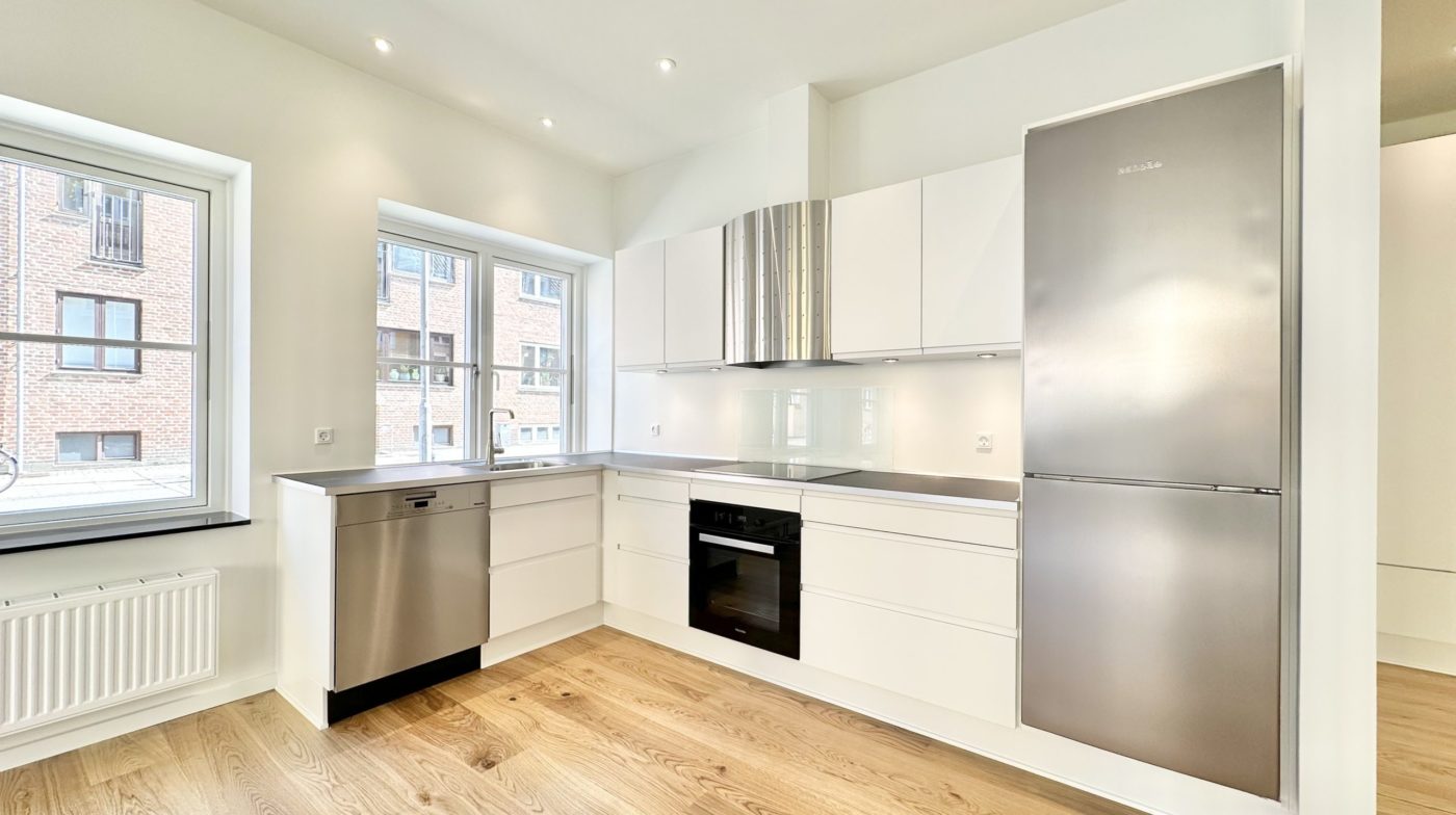Lejligheden byder på en rummelig entré med faste skabe, samt et lyst værelse eller kontor med indbyggede skabe – ideelt til hjemmekontor eller gæsteværelse. Det åbne køkken og stue i ét stort rum har udgang til den store terrasse, perfekt til afslapning og hyggelige stunder. Køkkenet er et stilfuldt mat hvidt Designa-køkken med alle hårde hvidevarer fra Miele, herunder opvaskemaskine.