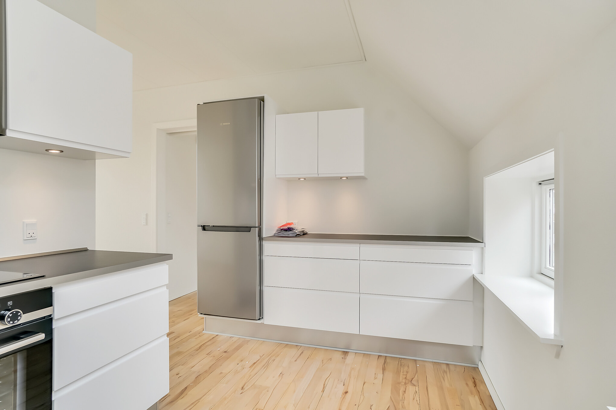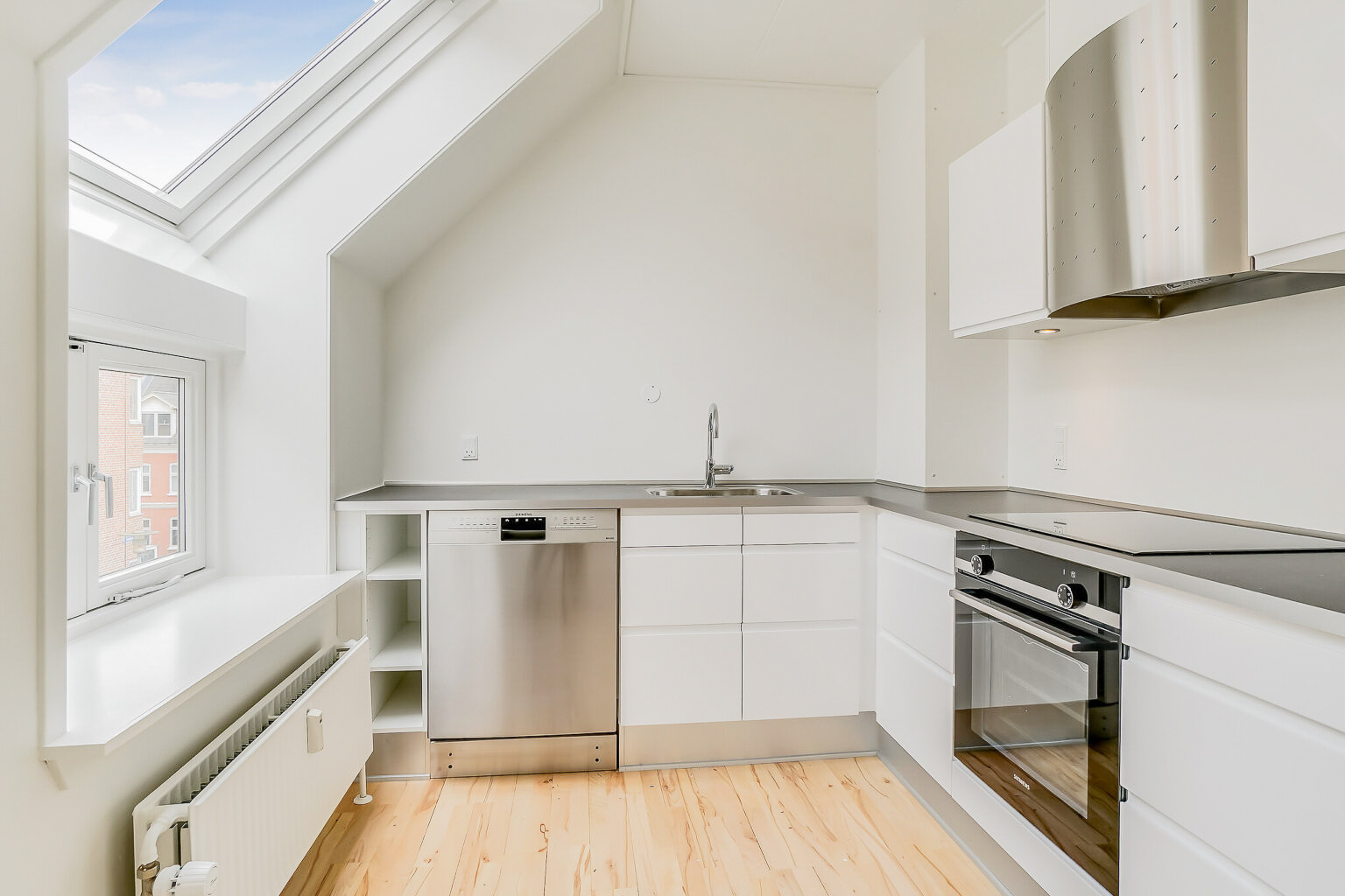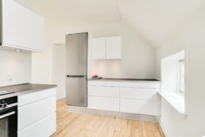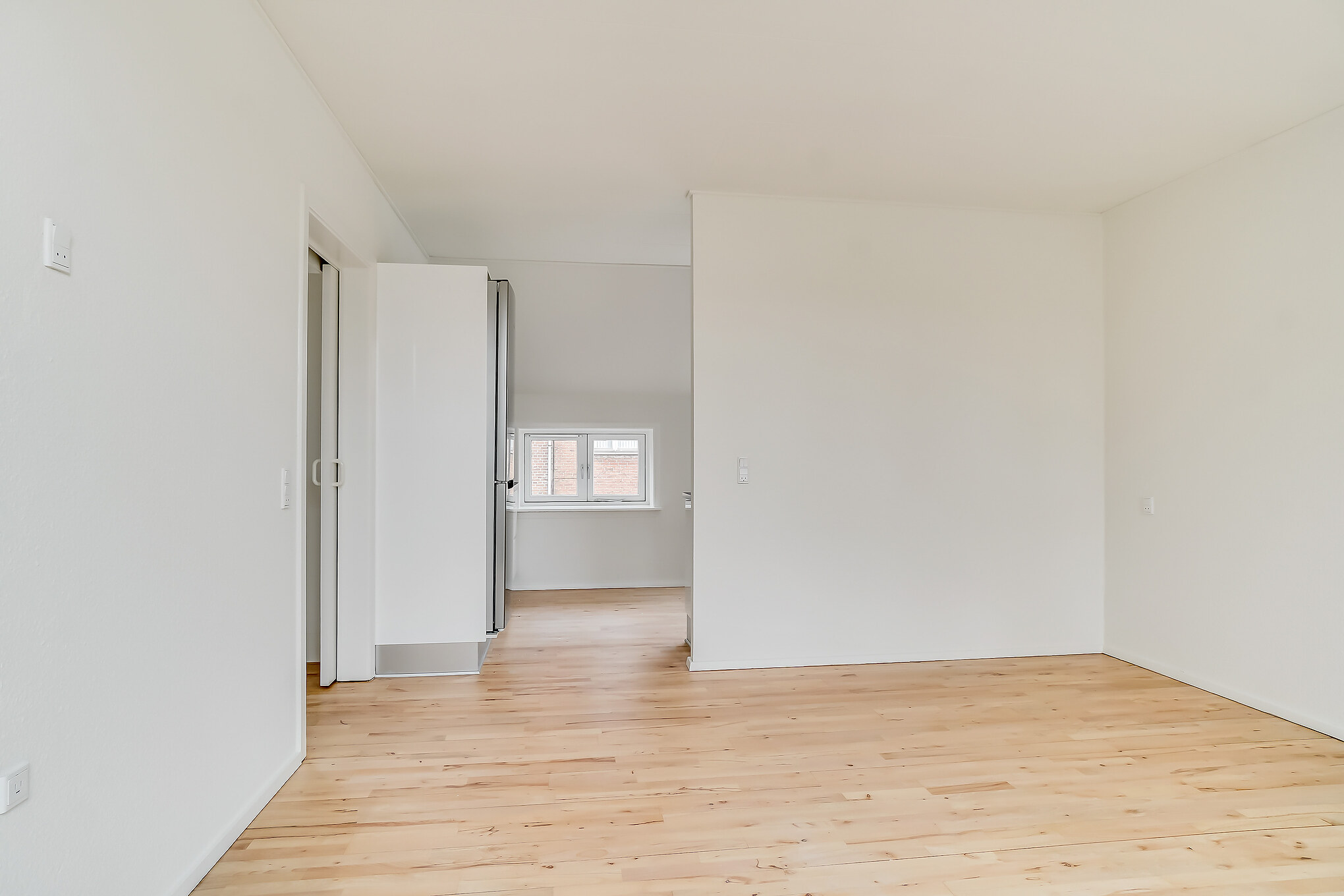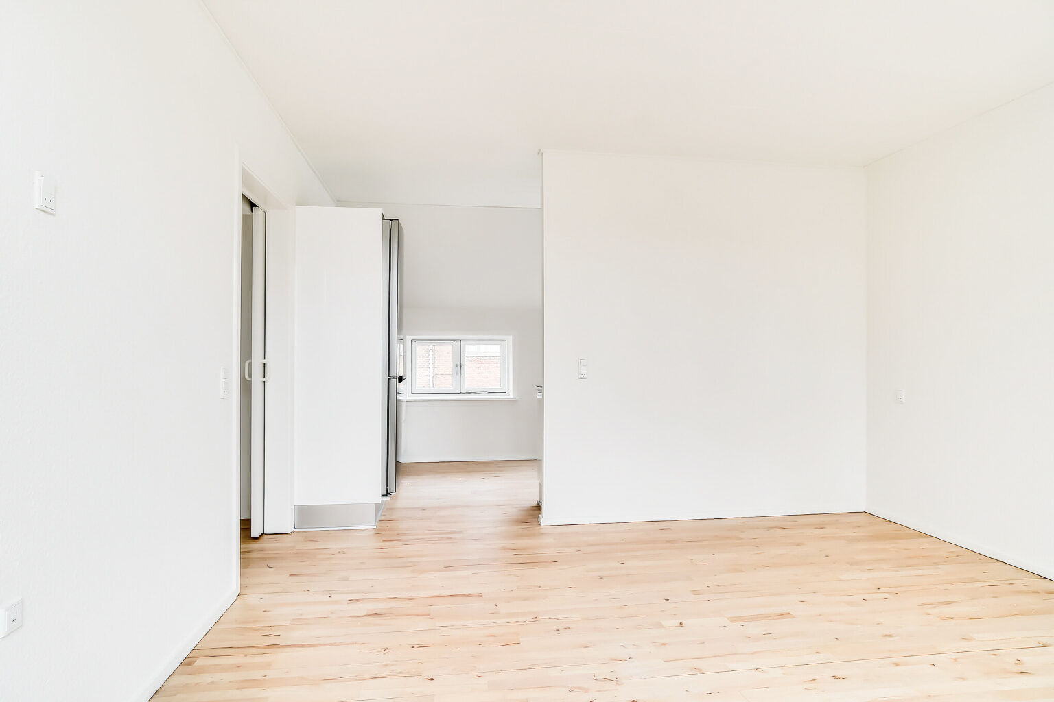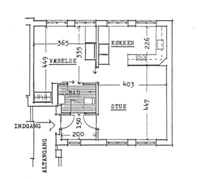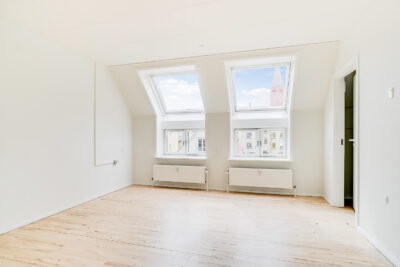 Denne lejlighed er bestående af en separat entré, hvor du kan have knager og skohylder. Herfra træder du ind i stuen, hvor du kan have spisebord og tv-område. Der er store vinduer, hvorfra der strømmer en masse godt lys ind. Køkkenet er super lækkert, og er i forlængelse med stuen. Det putter sig lidt ind i et hjørne af lejligheden, som gør det meget hyggeligt. Samtidig er det stadig tydeligt integreret med stuen, så det kan kaldes et køkken-alrum.