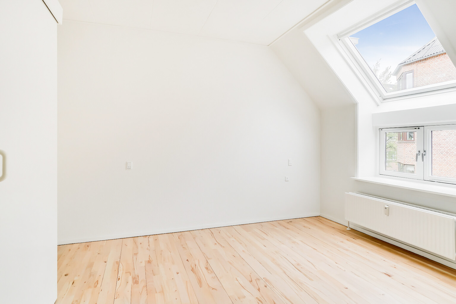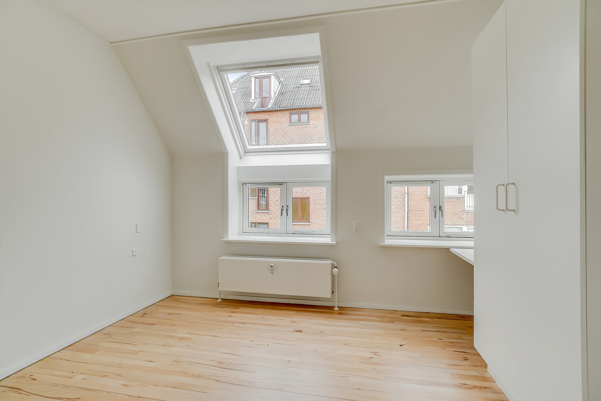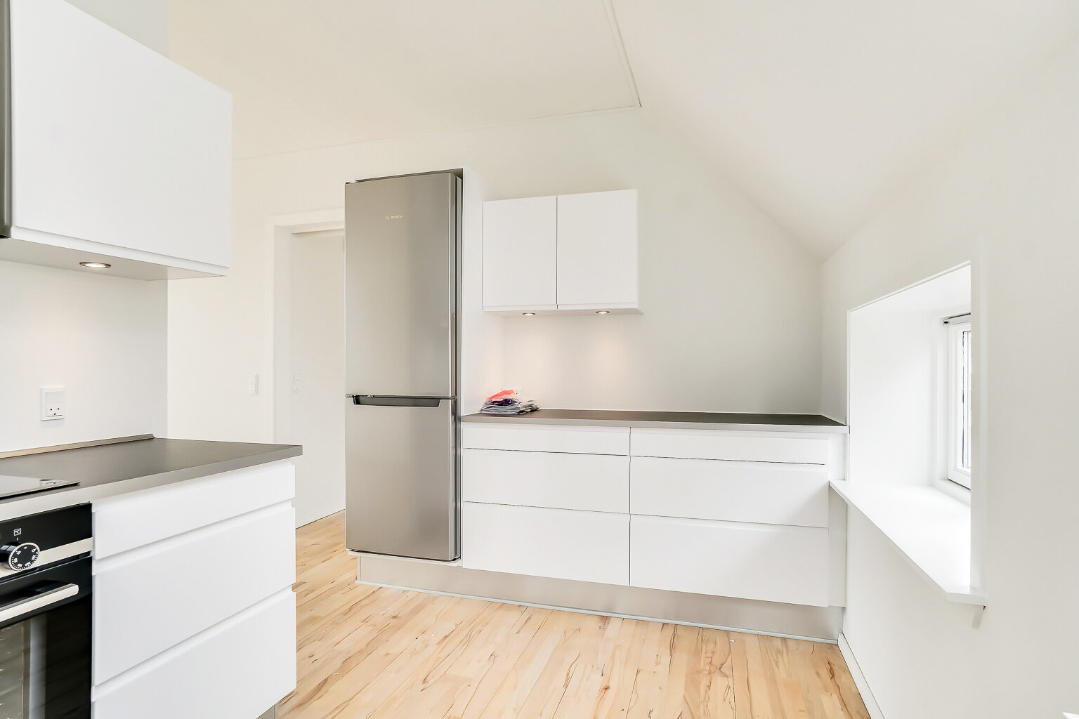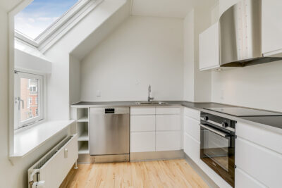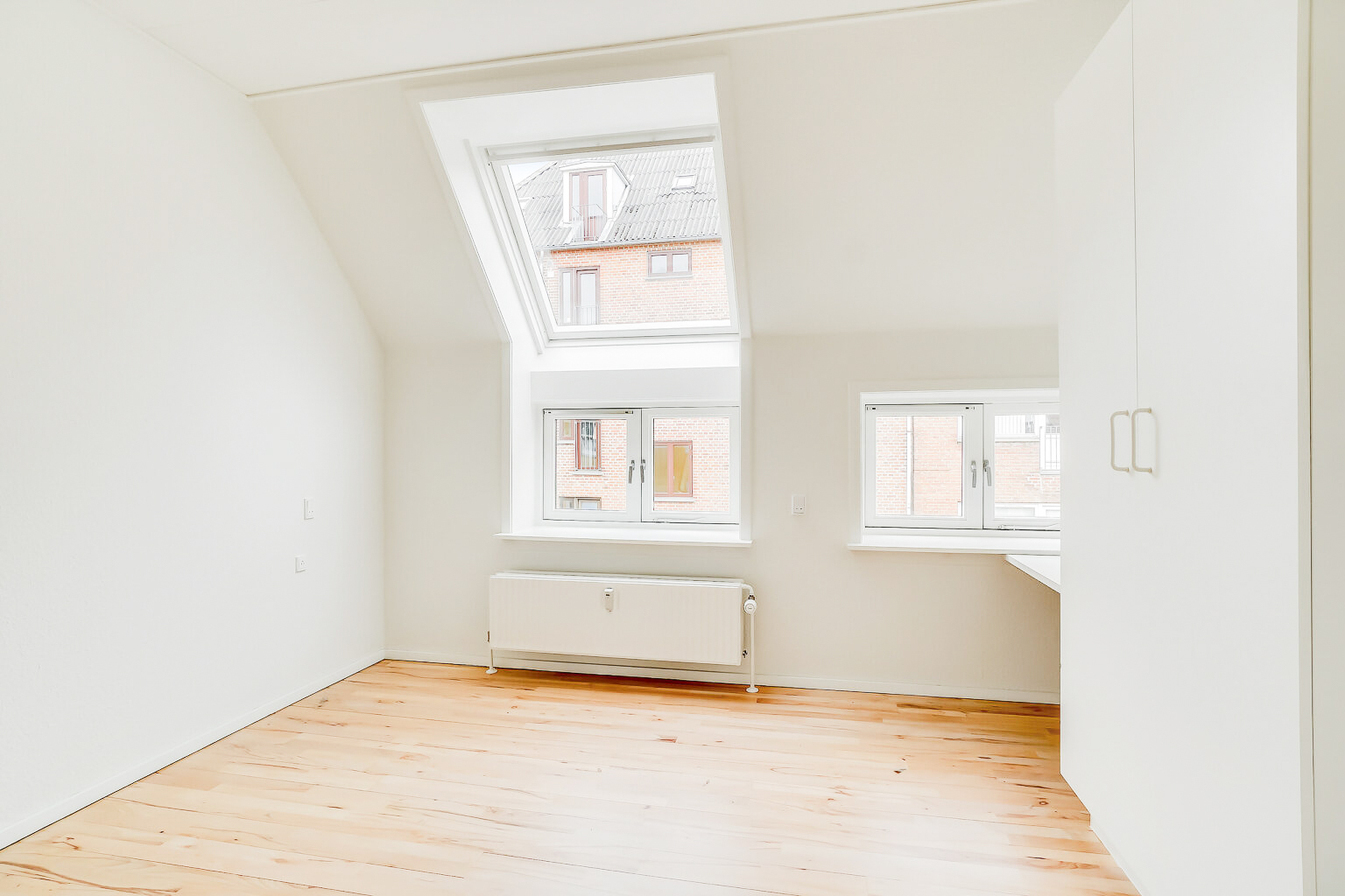 Denne lejlighed er bestående af en separat entré, hvor du kan have knager og skohylder. Herfra træder du ind i stuen, hvor du kan have spisebord og tv-område. Der er store vinduer, hvorfra der strømmer en masse godt lys ind. Køkkenet er super lækkert, og er i forlængelse med stuen. Det putter sig lidt ind i et hjørne af lejligheden, som gør det meget hyggeligt. Samtidig er det stadig tydeligt integreret med stuen, så det kan kaldes et køkken-alrum.