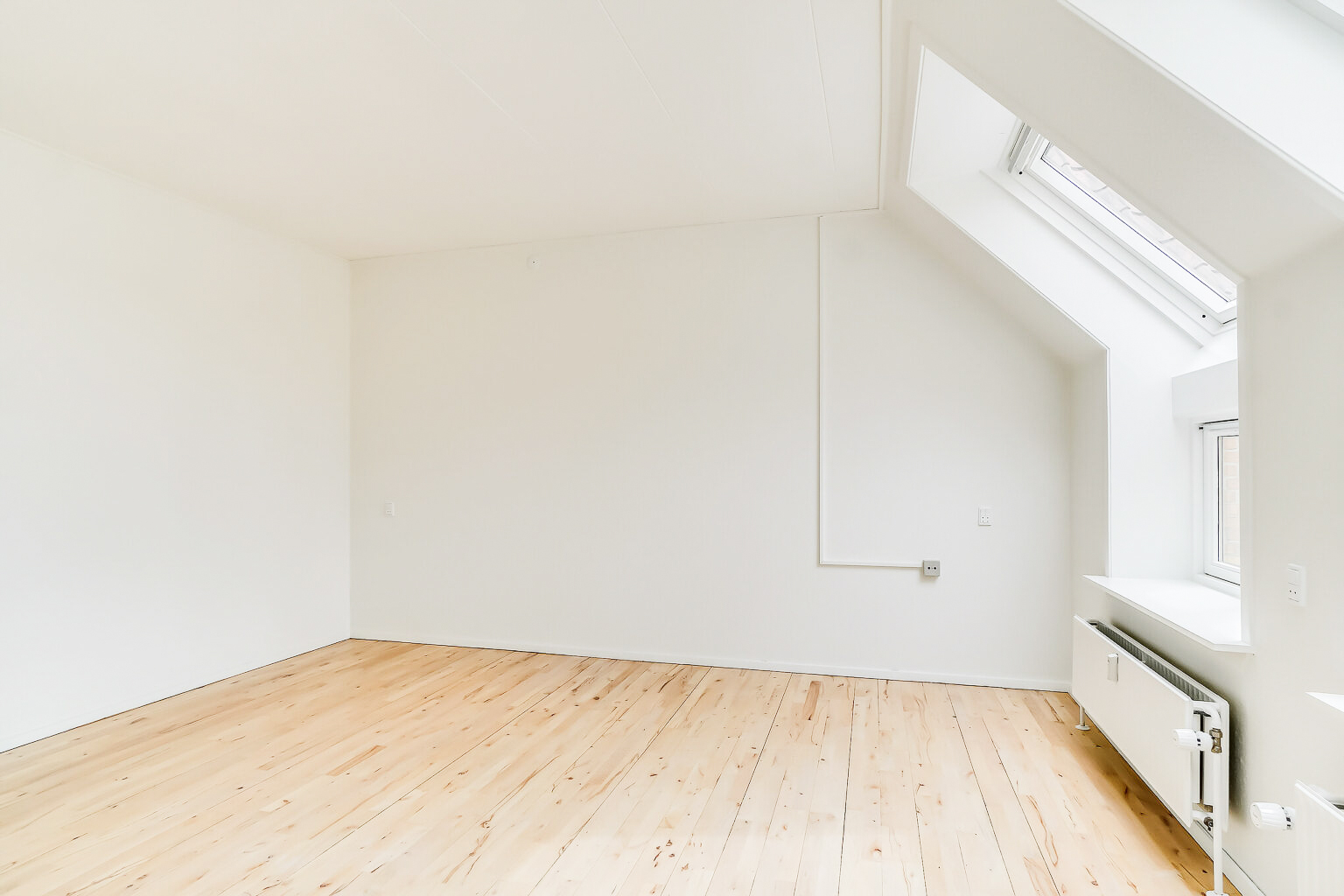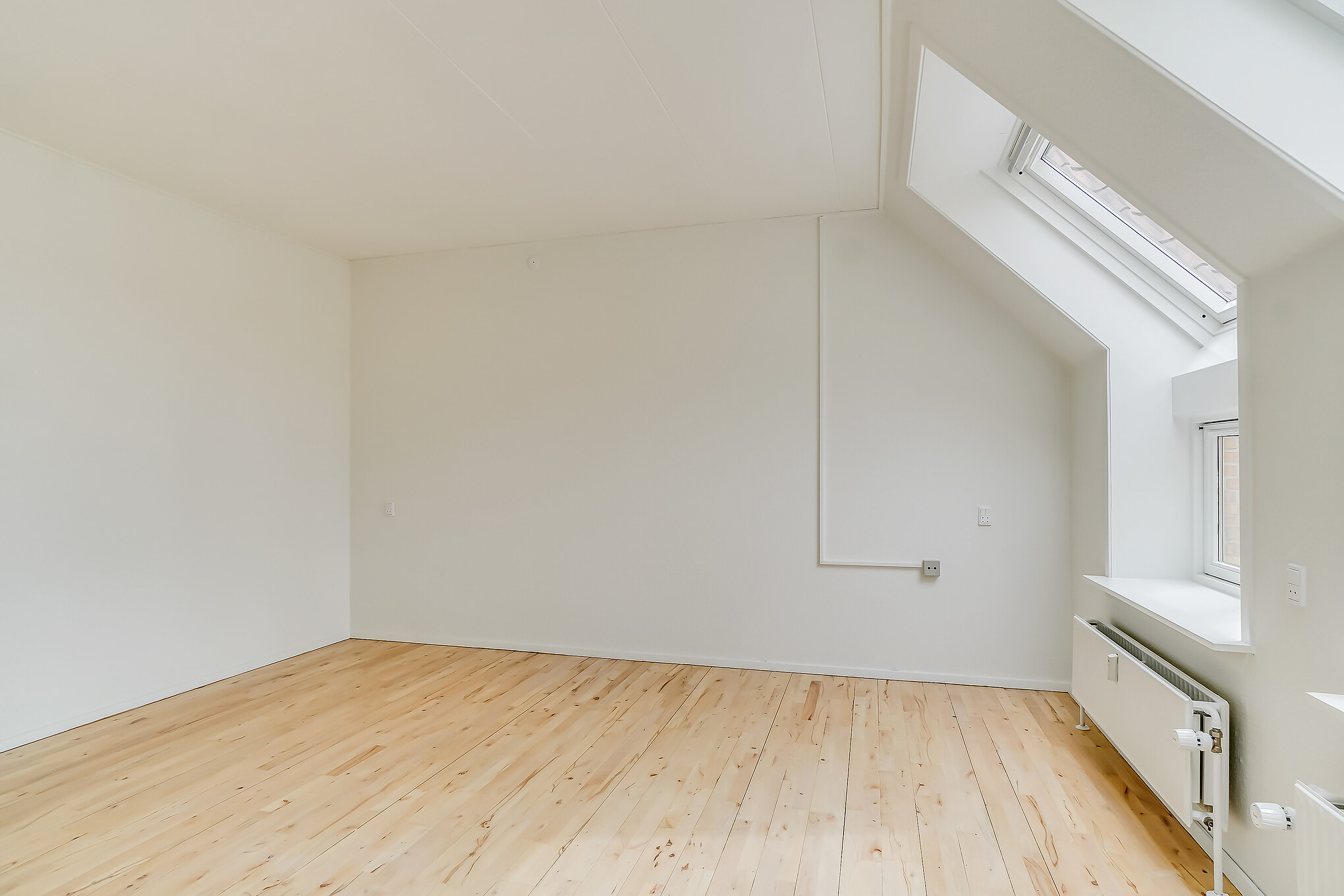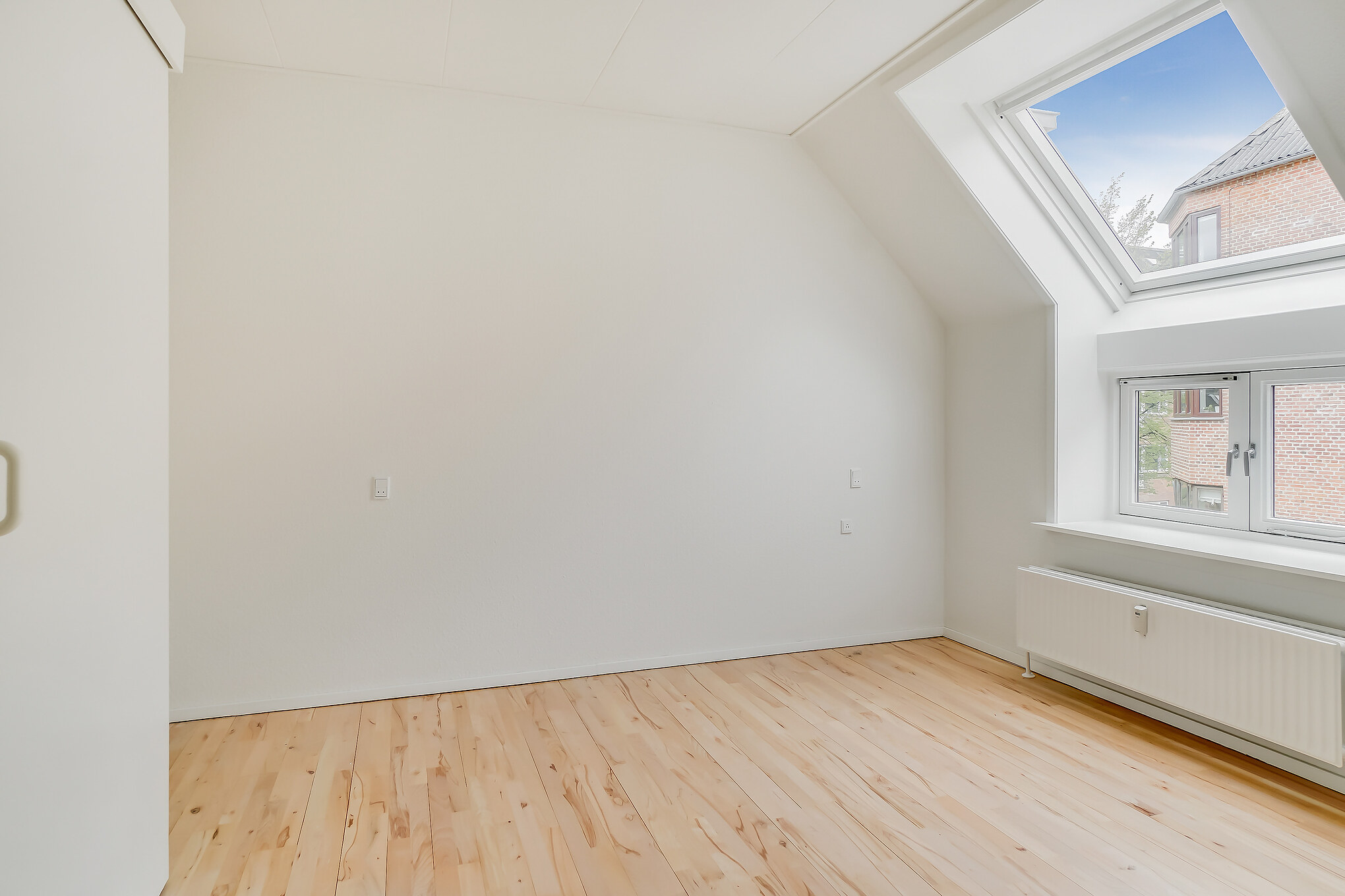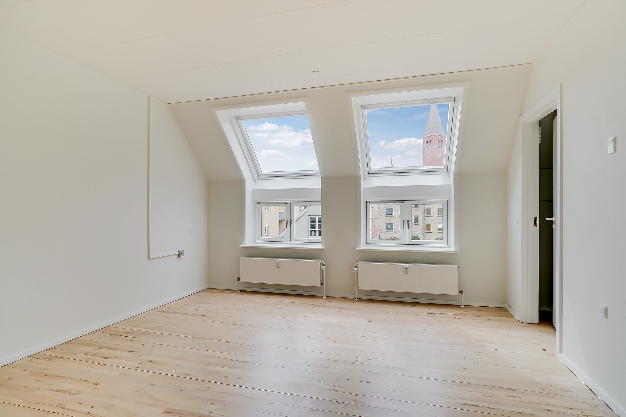 Denne lejlighed er bestående af en separat entré, hvor du kan have knager og skohylder. Herfra træder du ind i stuen, hvor du kan have spisebord og tv-område. Der er store vinduer, hvorfra der strømmer en masse godt lys ind. Køkkenet er super lækkert, og er i forlængelse med stuen. Det putter sig lidt ind i et hjørne af lejligheden, som gør det meget hyggeligt. Samtidig er det stadig tydeligt integreret med stuen, så det kan kaldes et køkken-alrum.