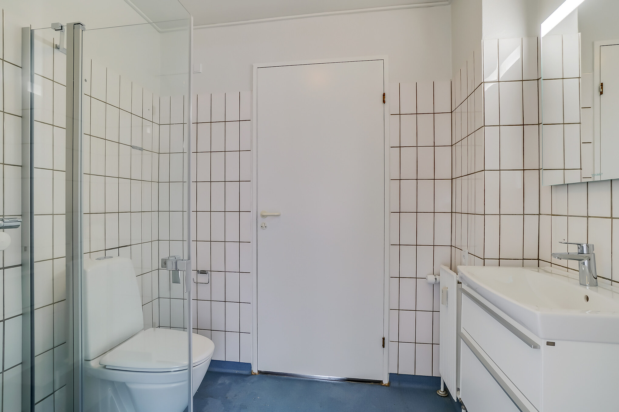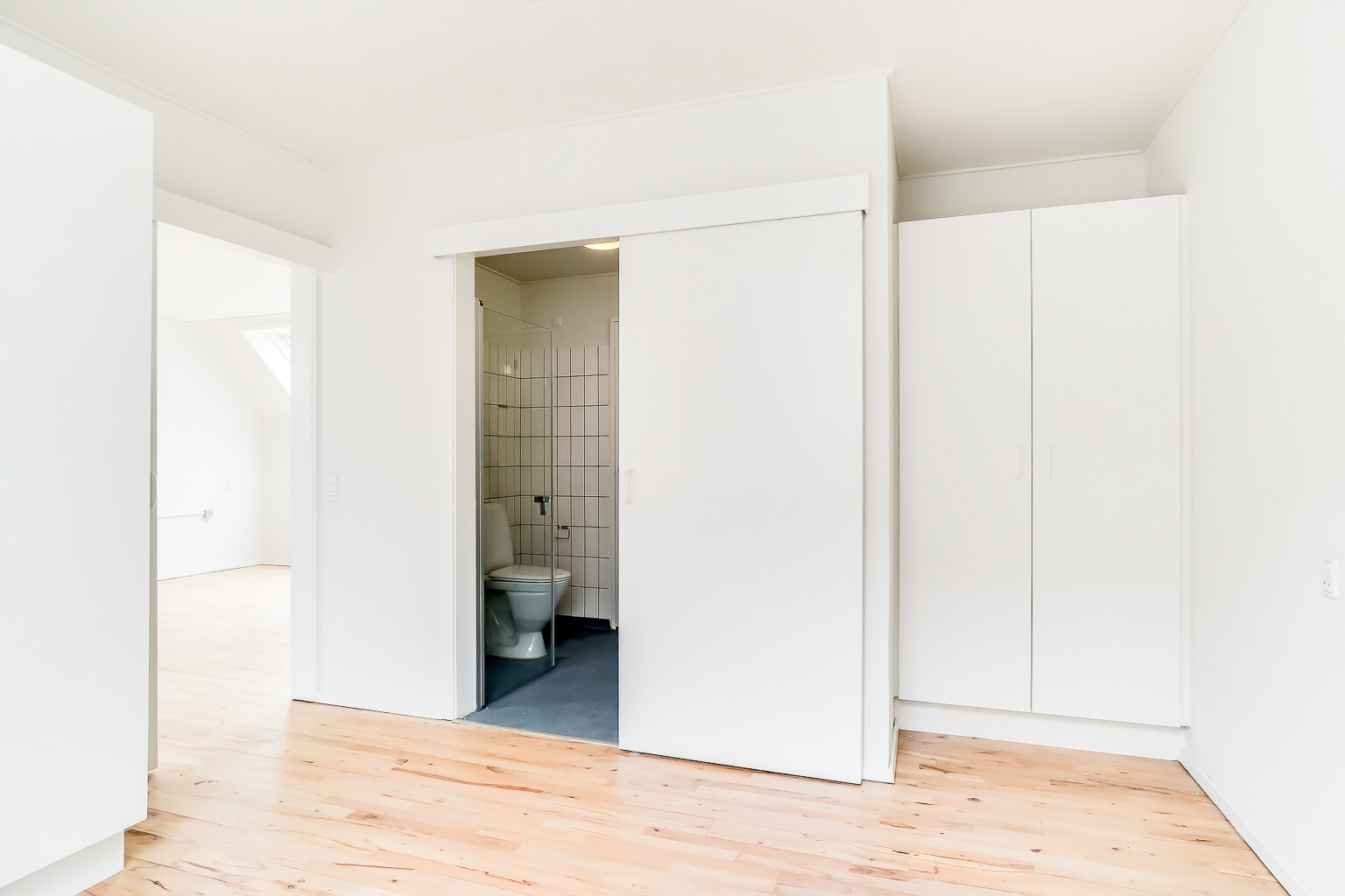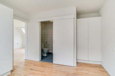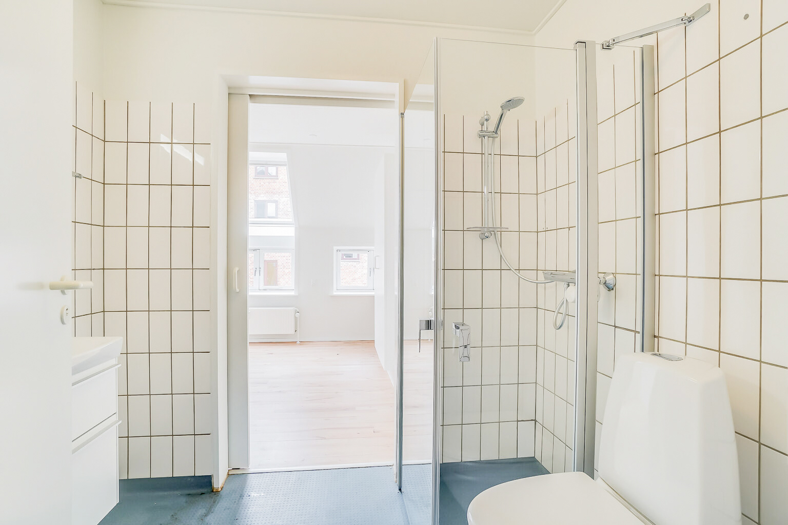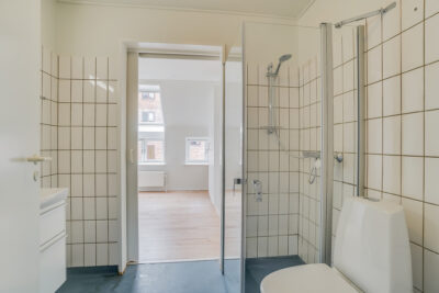 Fra stuen er der indgang til soveværelset, som er en rigtig god størrelse. Her er plads til en dobbeltseng med sengeborde på hver side. Der er allerede et klædeskab med 3 låger indsat i soveværelset. Fra soveværelset er der adgang til lejlighedens badeværelse, som har separat brus med foldbare døre. Der er et spejl med lys i også.