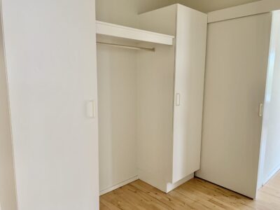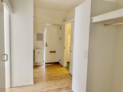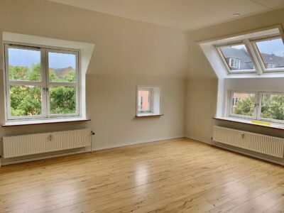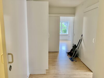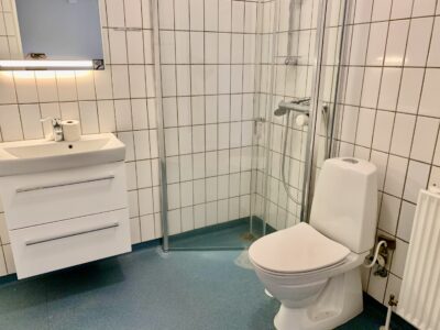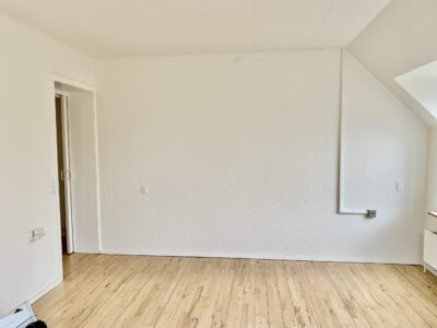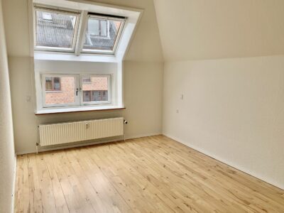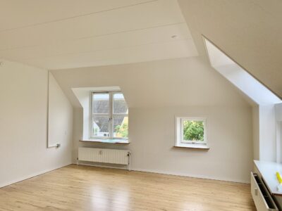 Lejligheden er bestående af en gang/entré med gode opbevaringsmuligheder. Til venstre har vi som det første badeværelset. Det er med en bruseniche, hvor man kan slå dørene sammen og der er godt med plads derude. Ude i gangen igen har vi så til højre indgang til et flot soveværelse. Der er skrå vægge, men de er høje, så man kan indrette normalt. Det er et dejligt stort lyst rum.