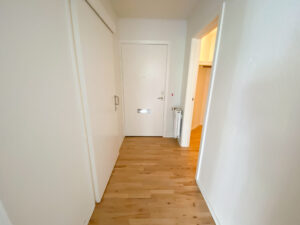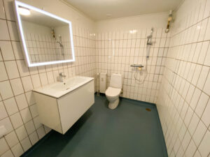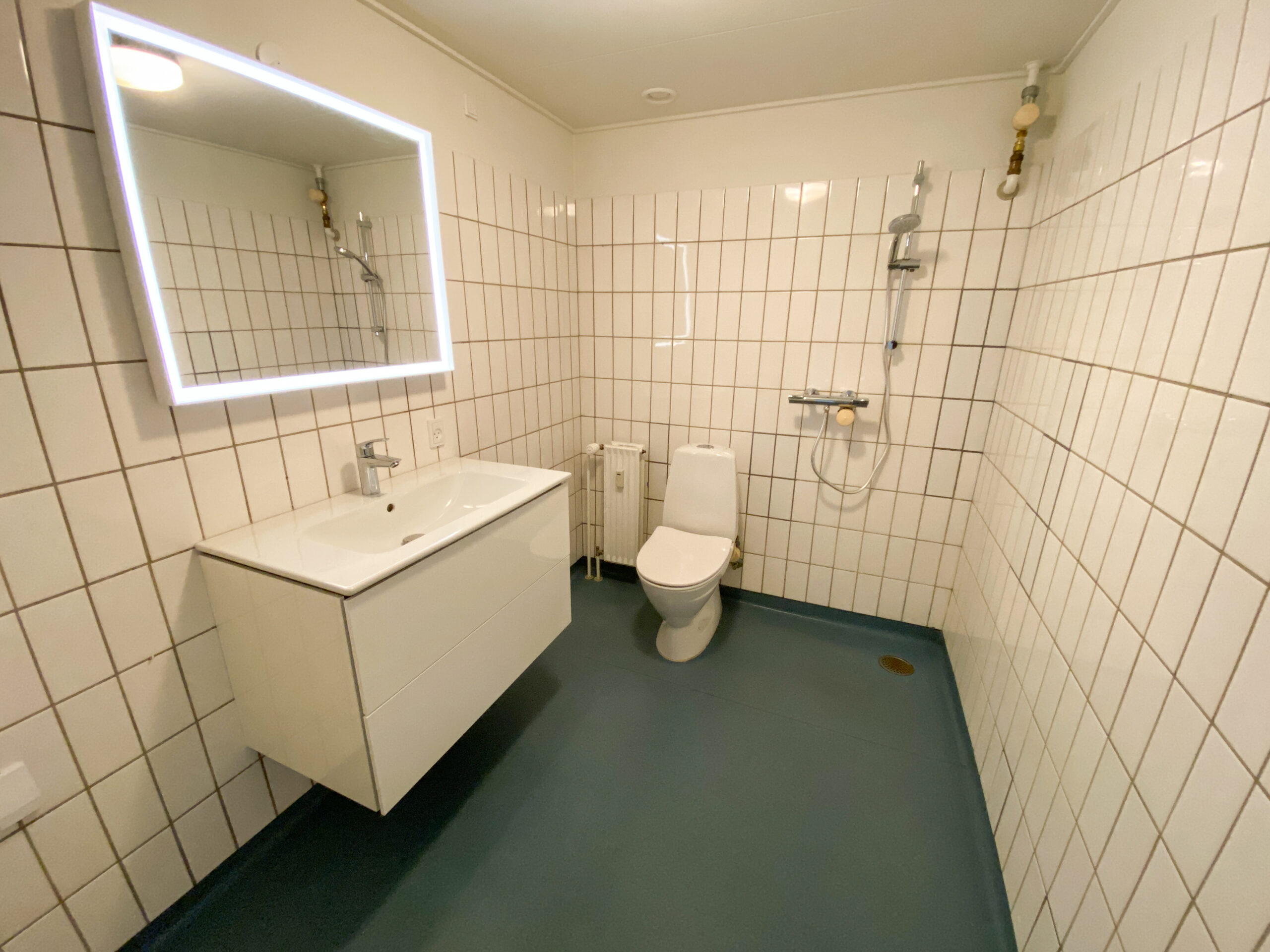 Lejligheden er bestående af entré med et ekstra rum, hvor man enten kan have walk-in closet eller kontor. Herfra kan du gå ud på badeværelset, som har separat brus og med låger, der kan slåes sammen. Her er mulighed for at installere egen vaskemaskine ved siden af håndvasken.