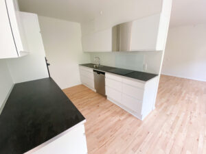 Fra entreen træder du så ind i lejlighedens køkken alrum, her kommer masser af lys ind fra vinduerne, der gør rummet meget lyst. Køkkenet gemmer sig lidt separat i rummet. Der er meget skabsplads og køkkenet er helt nyt (2025) og har en opvaskemaskine, mikroovnsskjuler, høj ovn og gode materialer.