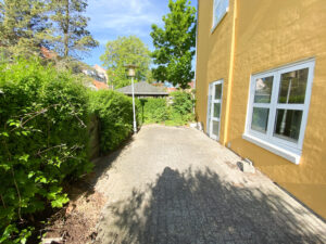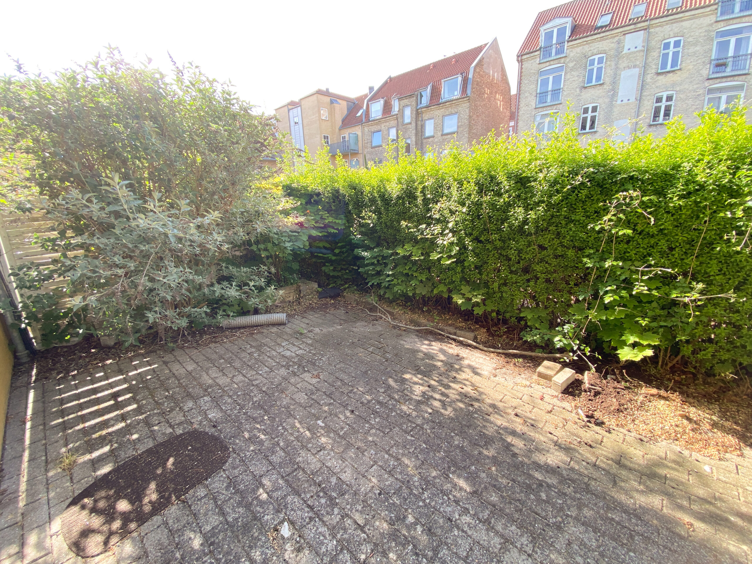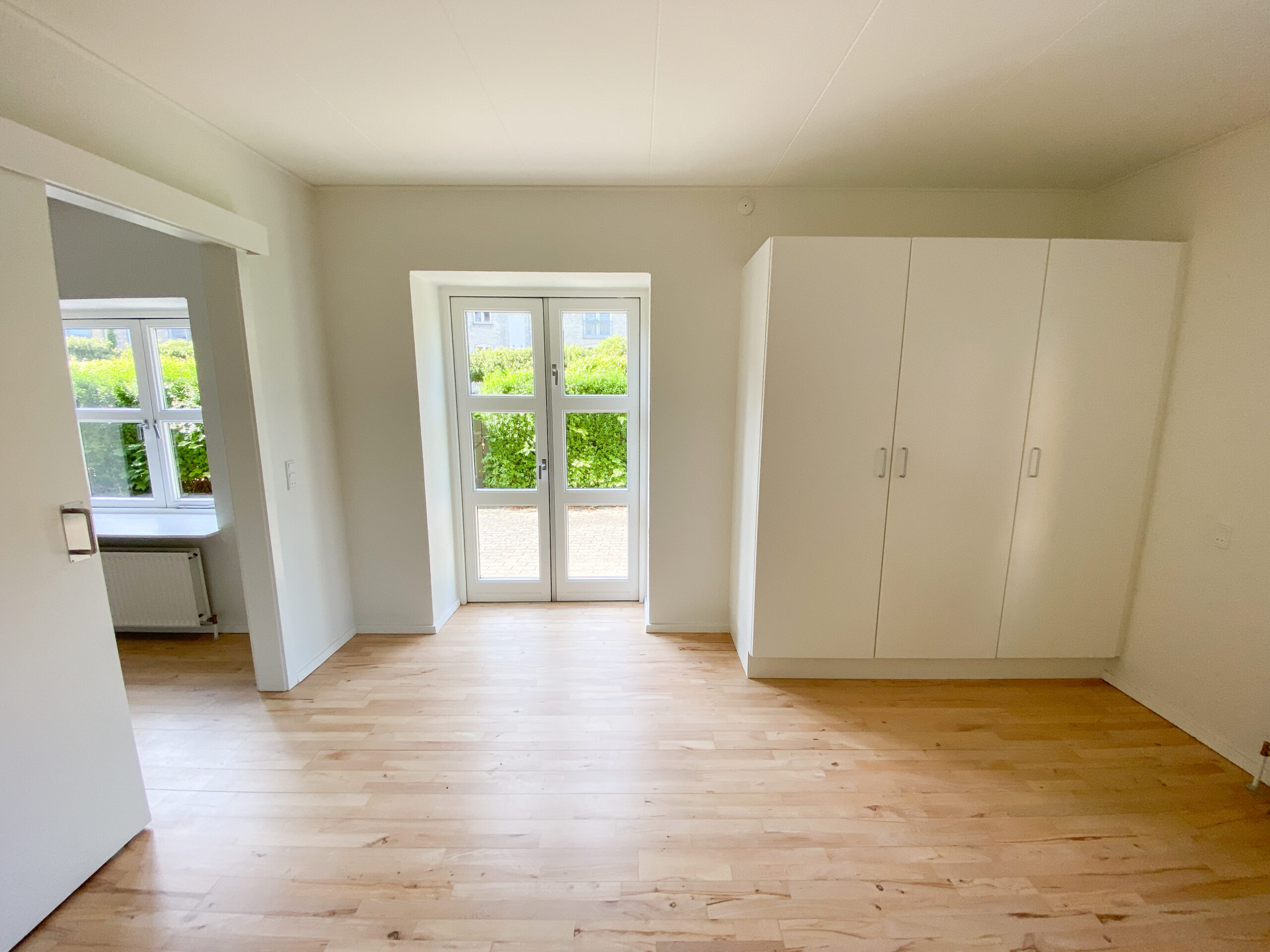 Til sidst har vi så soveværelset, som har et godt klædeskab. Det rummer en dobbeltseng og et eventuelt skrivebord. Fra soveværelset har du udgang til en dejlig stor terrasse, der vender mod syd. Haven er omkredset af en hæk og har nogle bede i siderne, hvor man kan plante lidt blomster osv.