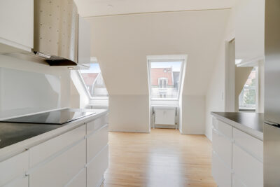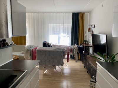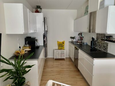 Fra entreen træder du så ind i lejlighedens køkken alrum, her kommer masser af lys ind fra vinduerne, der gør rummet meget lyst. Køkkenet gemmer sig lidt separat i rummet. Der er meget skabsplads og køkkenet er også af nyere dato. Til sidst har vi så soveværelset, som har et klædeskab.