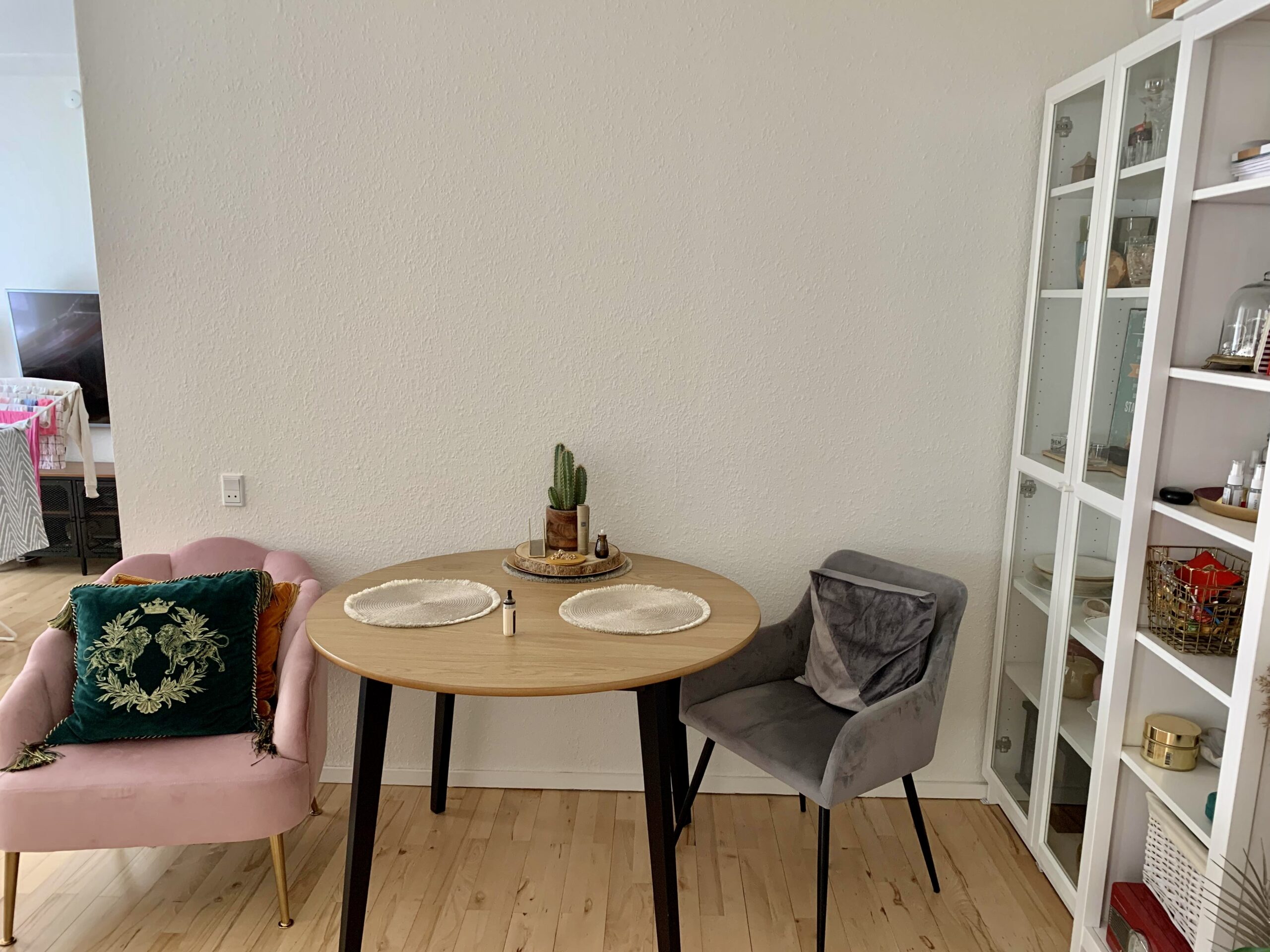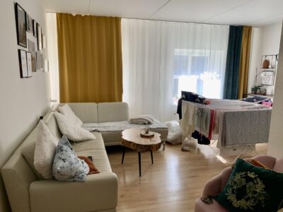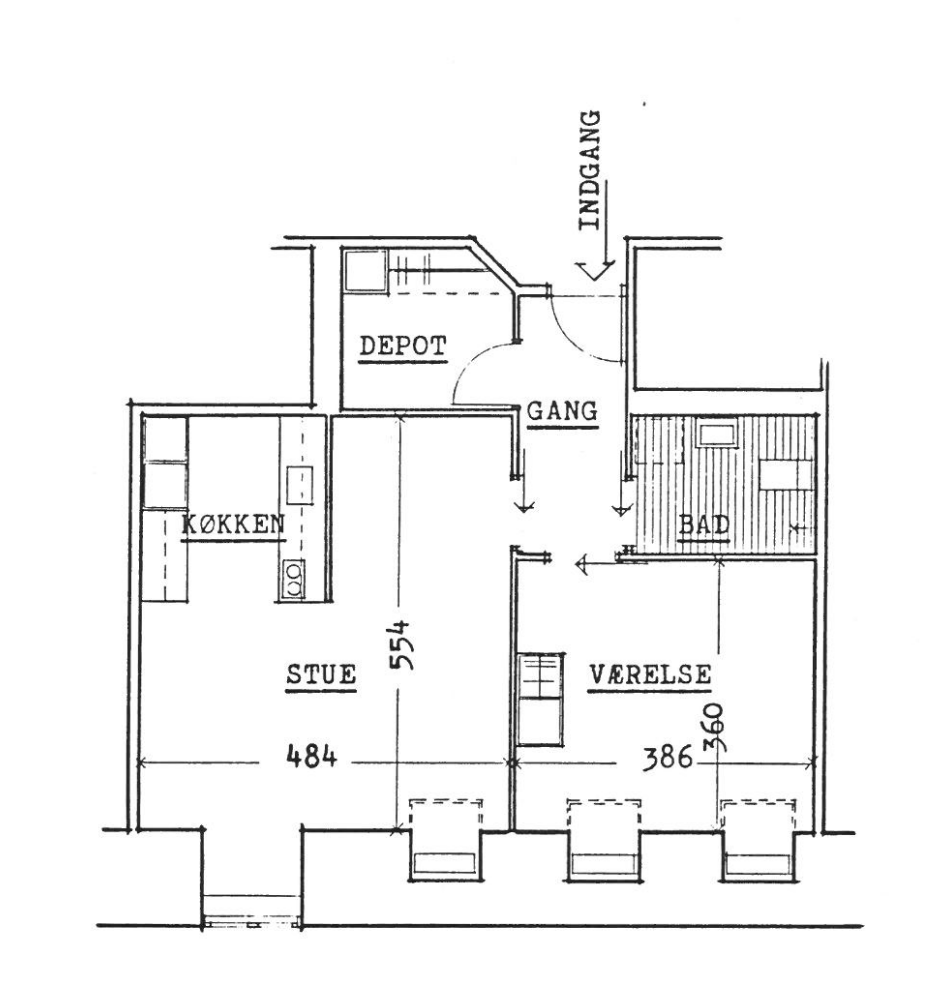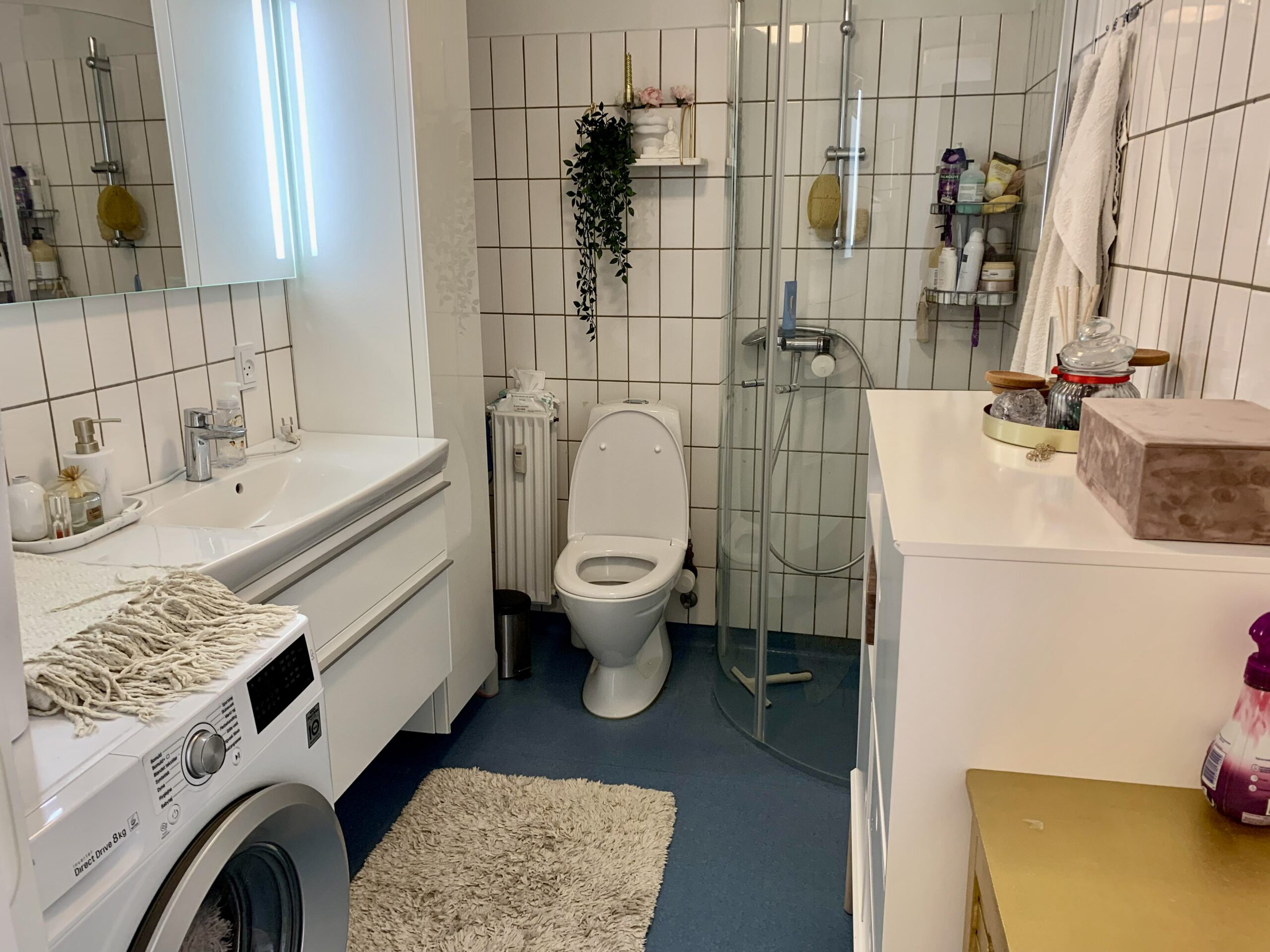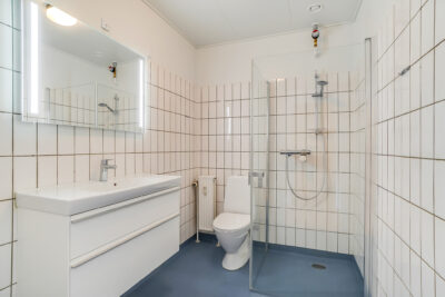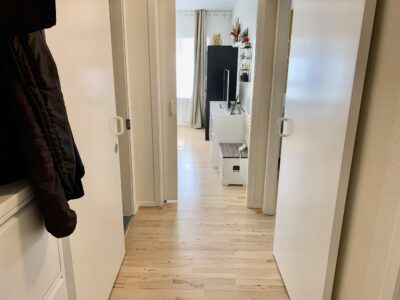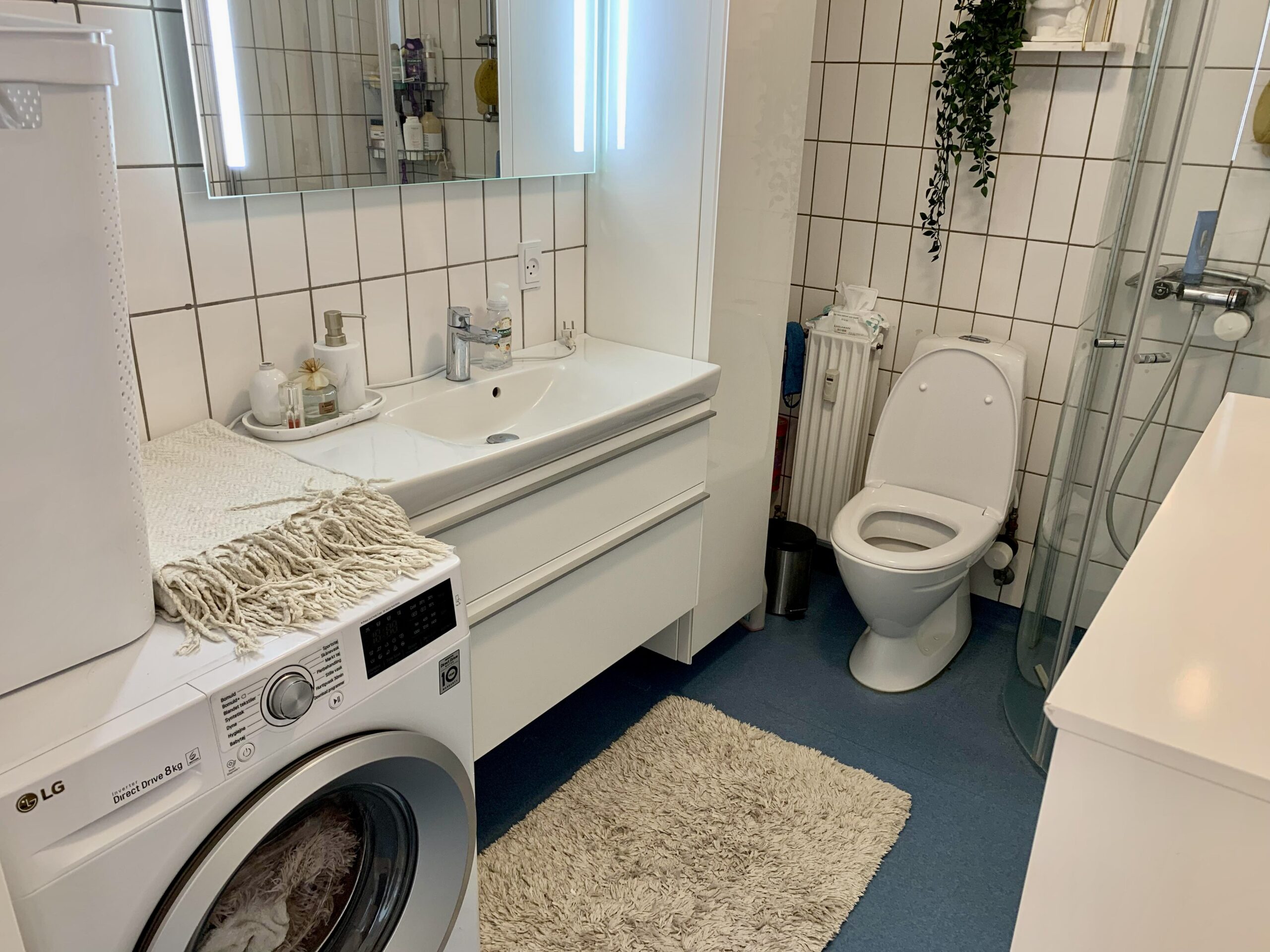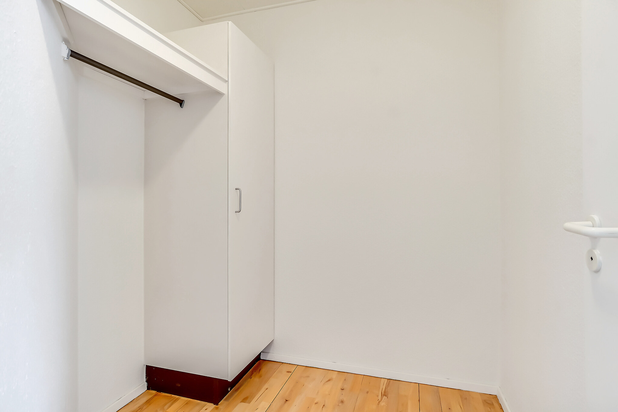 Lejligheden er bestående af entré med et ekstra rum. Herfra kan du gå ud på badeværelset, som har separat brus og med låger, der kan slåes sammen.