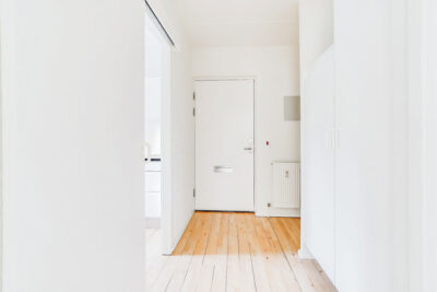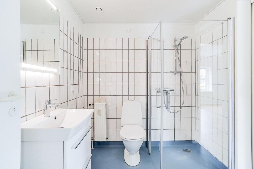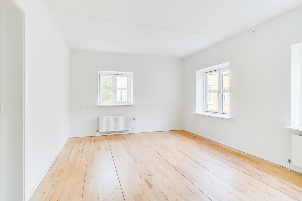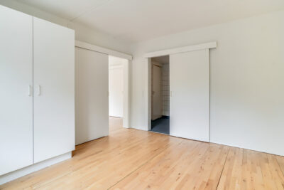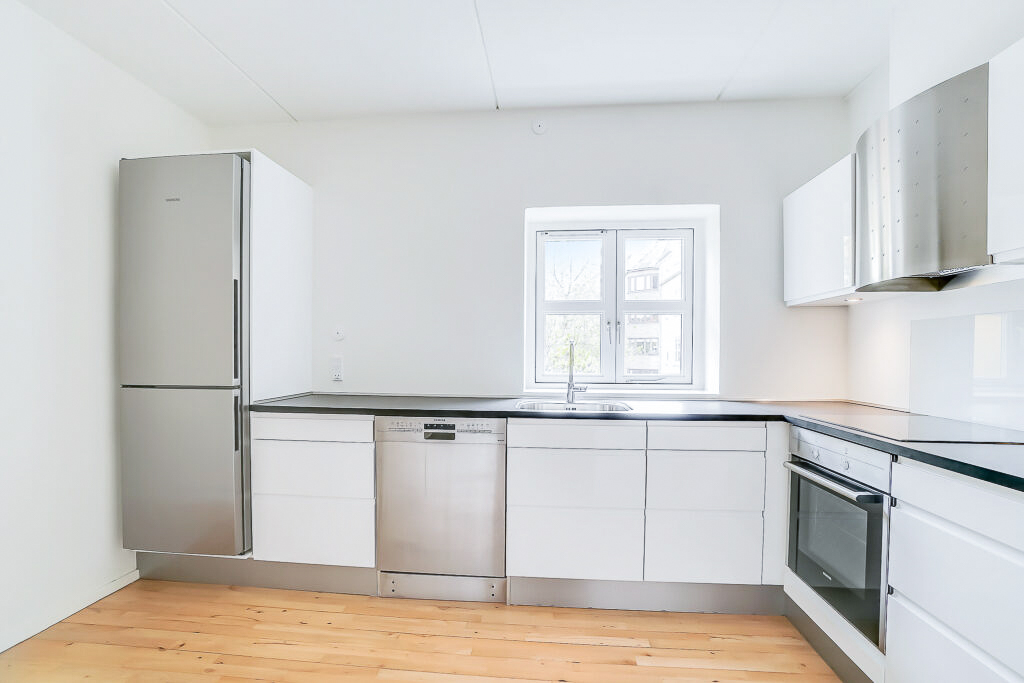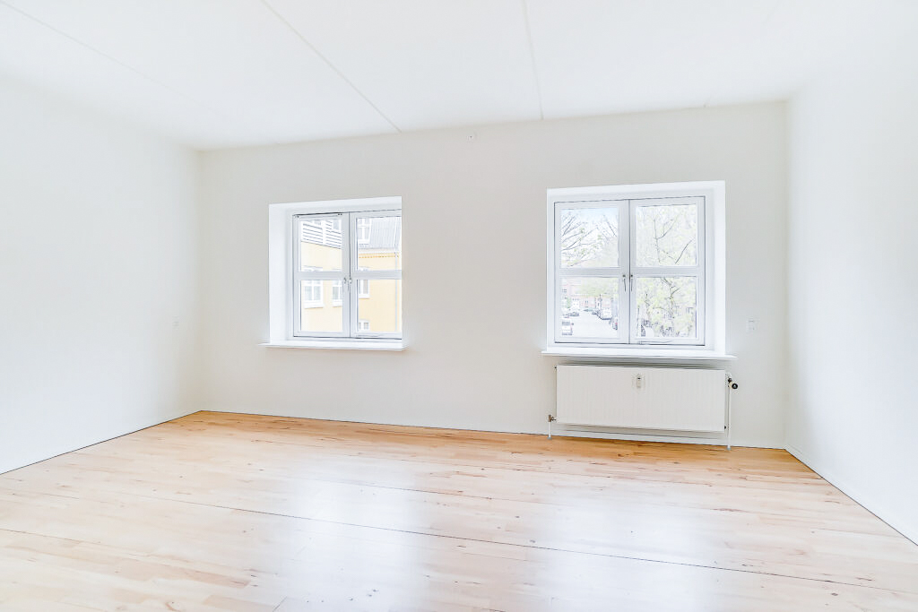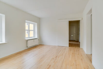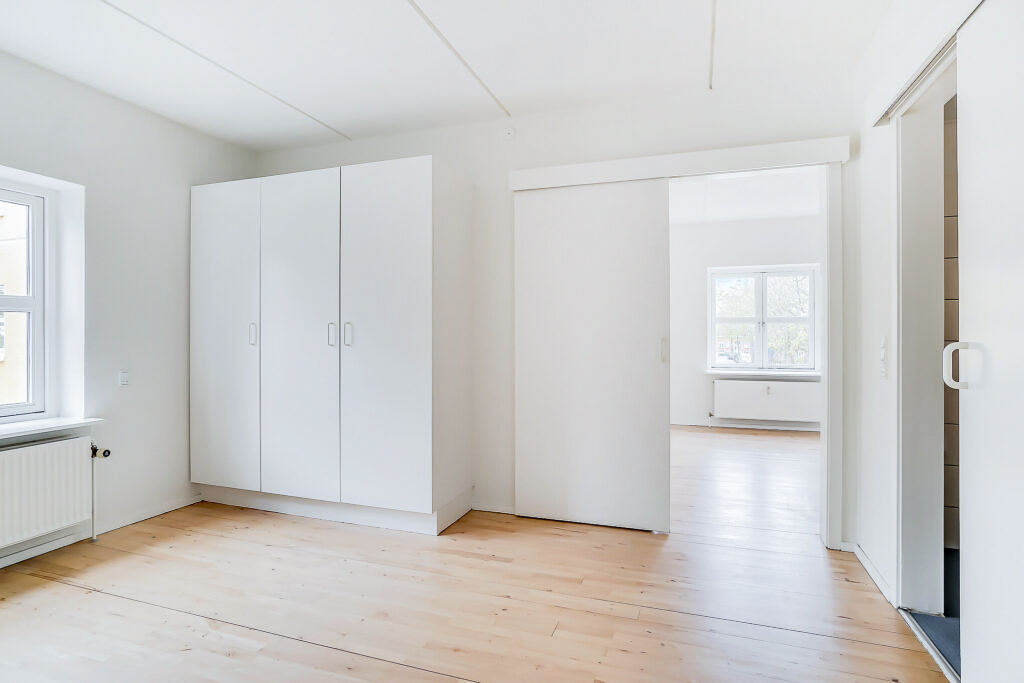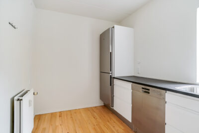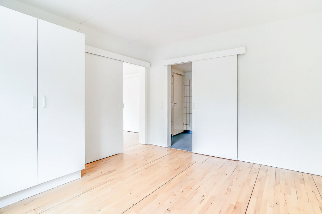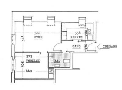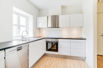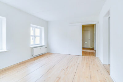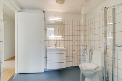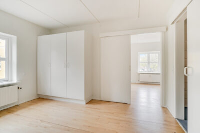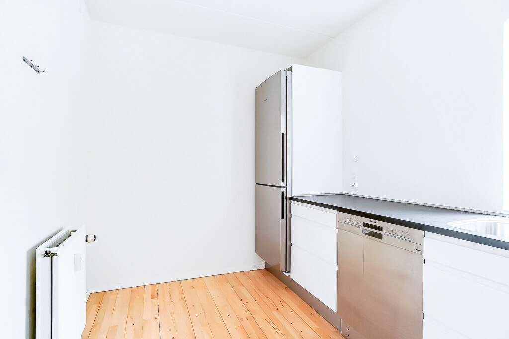 Lejligheden er bestående af en entré med overtøjsopbevaring som fører til en fordelingsgang hvor vi til den ene side har et nyere køkken med en opvaskemaskine og til den anden side har et soveværelse med indbyggede skabe. Mellem soveværelse og stue har vi et badeværelse med separat brus, som også er af nyere materialer. Til sidst har vi lejlighedens stue, som er pænt rummelig.