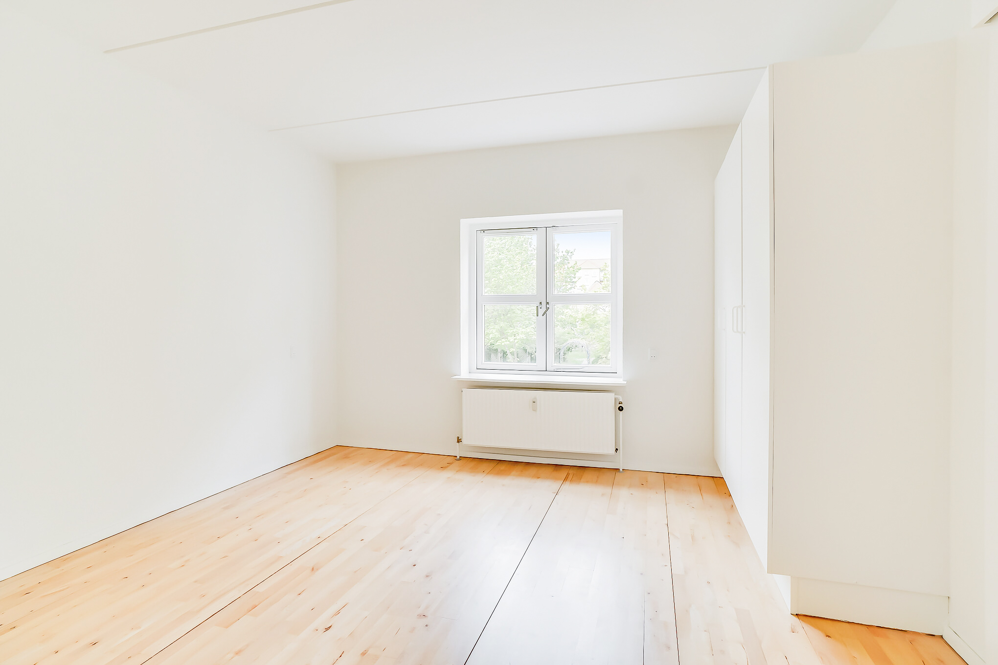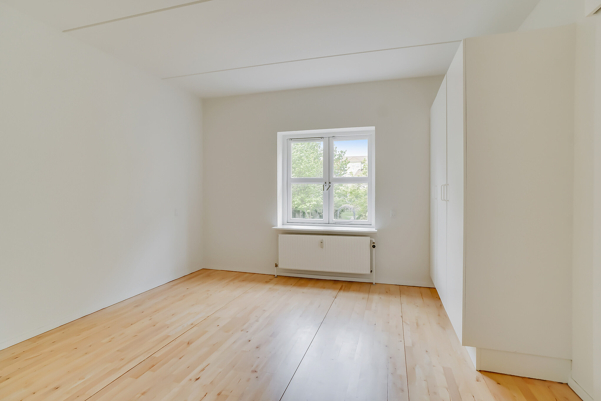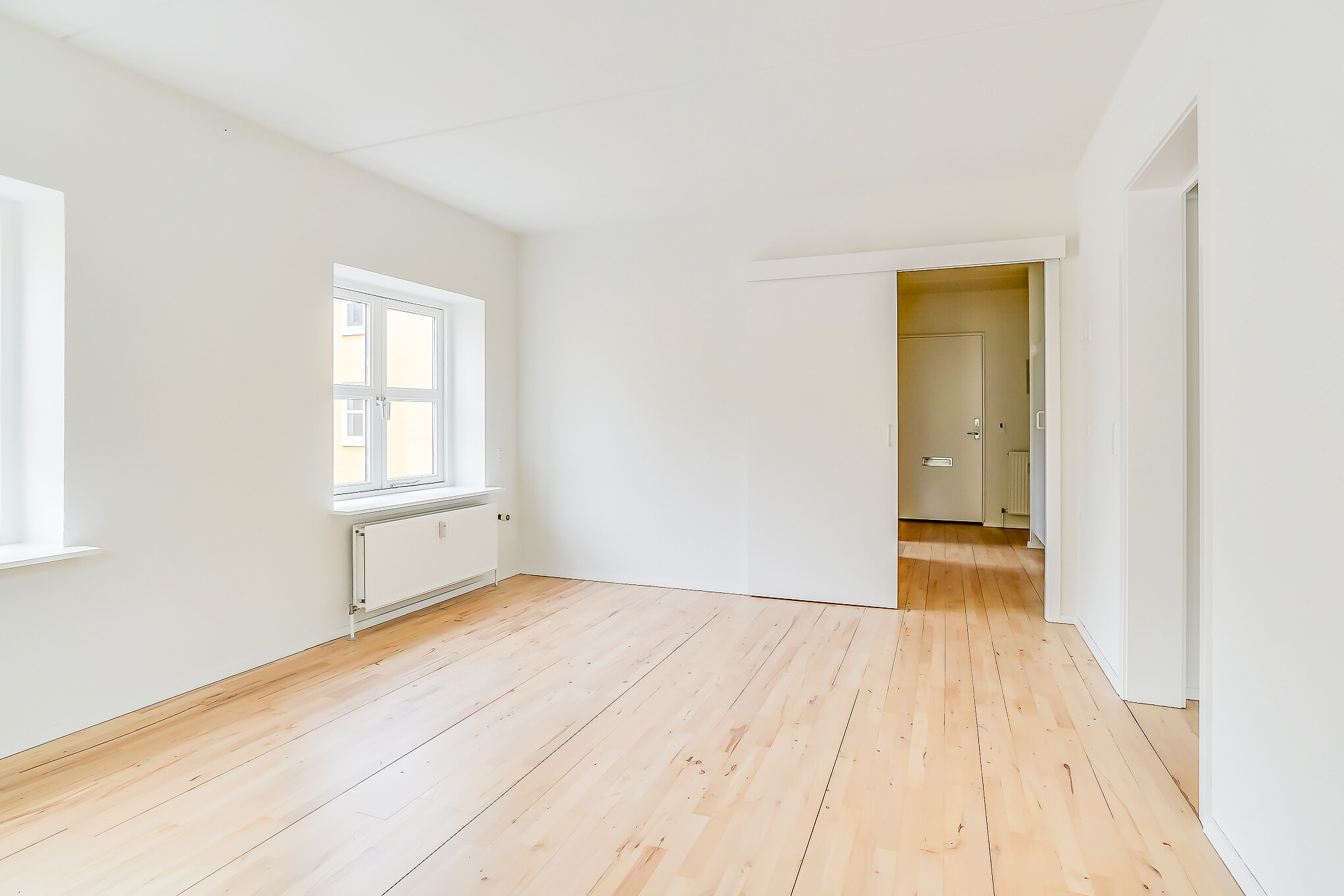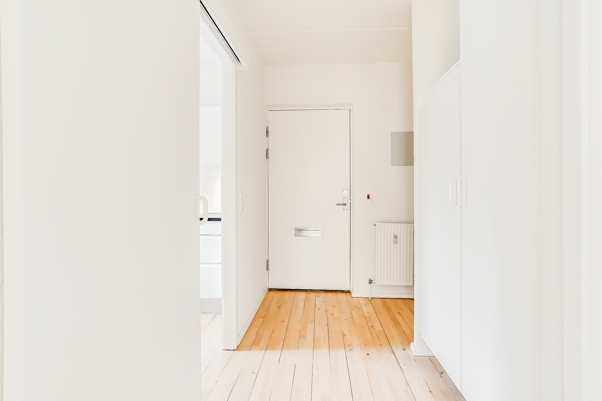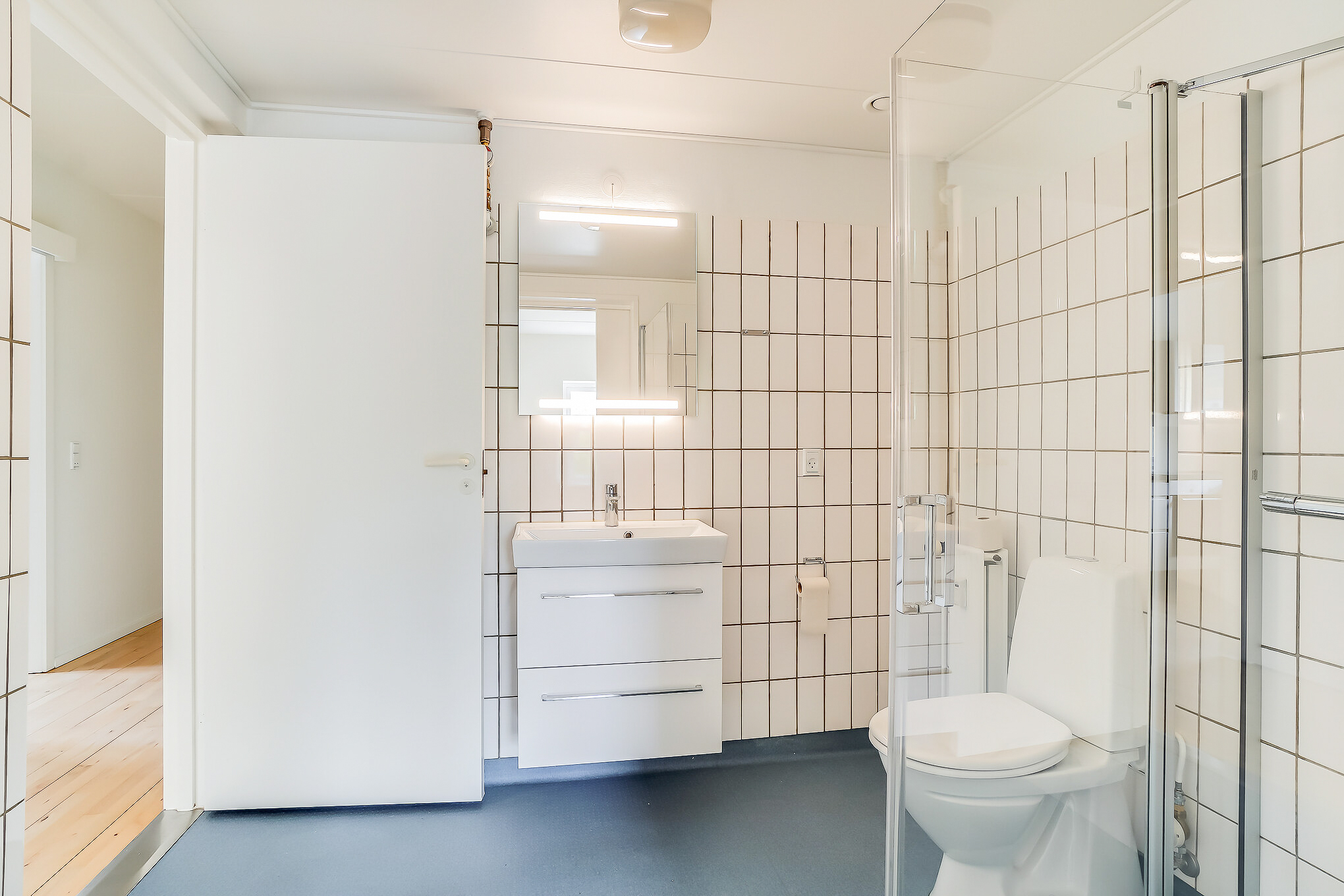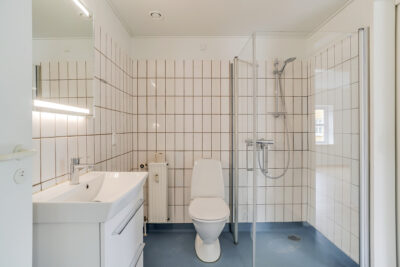 Lejligheden er bestående af en entré med overtøjsopbevaring som fører til en fordelingsgang hvor vi til den ene side har et nyere køkken med en opvaskemaskine og til den anden side har et soveværelse med indbyggede skabe. Mellem soveværelse og stue har vi et badeværelse med separat brus, som også er af nyere materialer. Til sidst har vi lejlighedens stue, som er pænt rummelig.