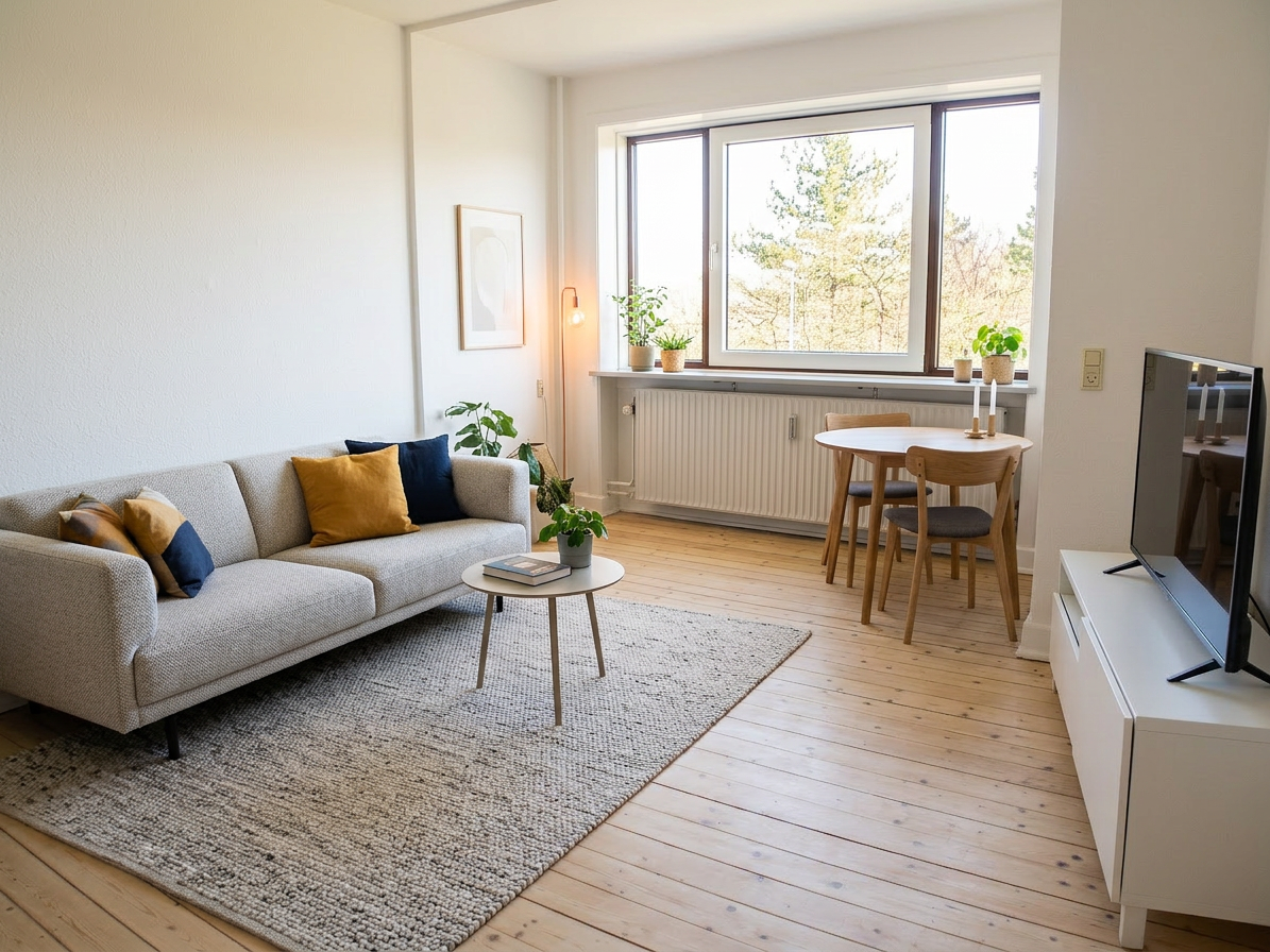 Lejligheden byder på en lys stue med plads til både sofa og spisebord, der inviterer til hyggelige stunder. Det funktionelle køkken er udstyret med nødvendige faciliteter, og badeværelset er praktisk indrettet. Her får du en bolig med en god planløsning, der skaber en følelse af rummelighed.