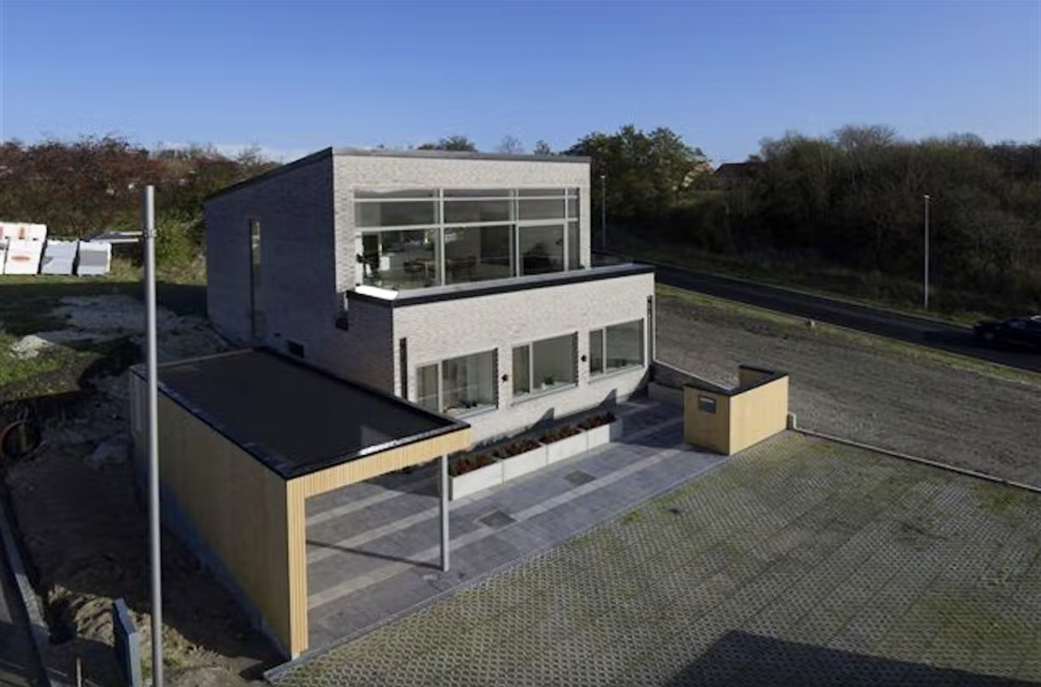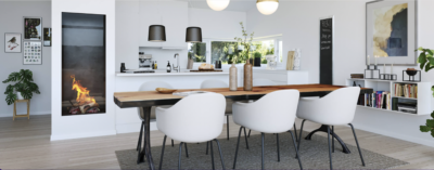På førstesalen har vi det store lyse og flotte køkkenalrum. Køkken-øen er vendt sådan, at man kan stå og nyde udsigten imens der laves mad. Køkkenalrummet er delt op sådan, at der er et stueområde i den ene side og plads til spiseområde midt i rummet. Det hele kommer derfor ikke til at være for tæt. Der er flotte store vinduespartier, som giver en panoramaudsigt.