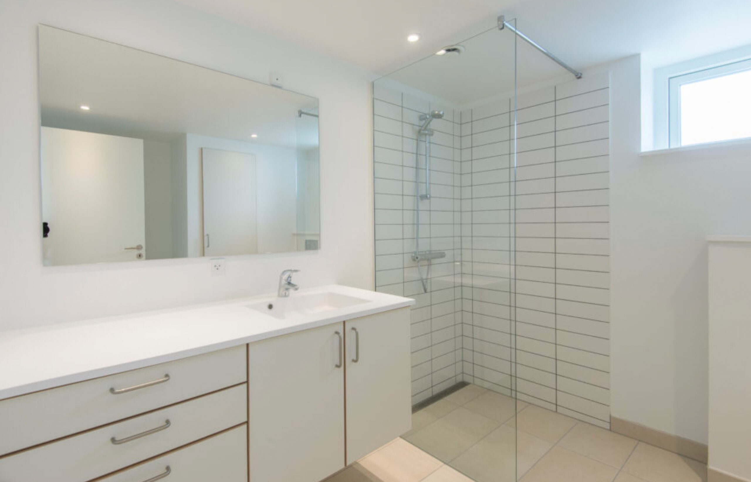 Der er smukt lakeret egetræsparket i alle opholdsrum og lyse klinker på badeværelset.