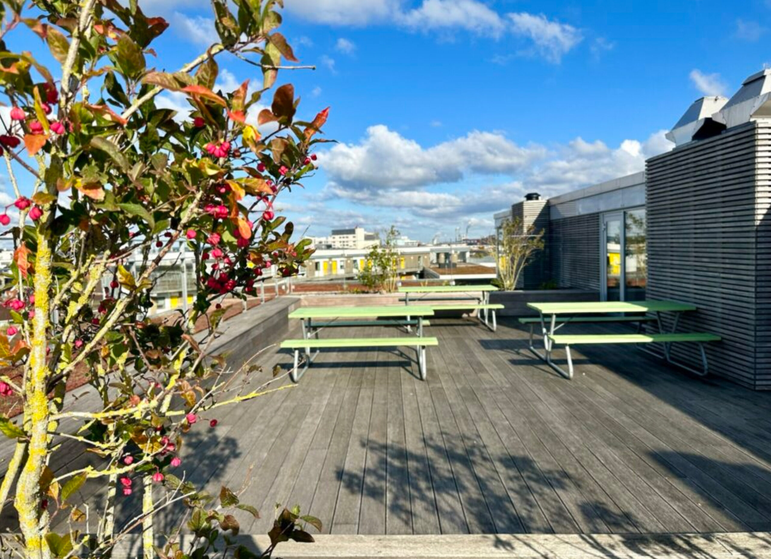 Der er adgang til fælles tagterrasse på 7. sal med smuk udsigt over det meste af Aalborg og omegn. Ved hovedindgangen til bygningen er der overdækket cykelparkering. I nærområdet er der ligeledes brugsret til legeplads samt adgang til hyggelige grønne områder med bl.a. grillplads med borde og bænke.