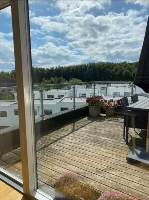 Glæd jer til at træde ud på den sydvestvendte tagterrasse, hvor I kan tilbringe de lange sommeraftener med udsigt over den nærtliggende skov. I råder desuden over et skur og bliver en del af en velfungerende ejendom med rare naboer.